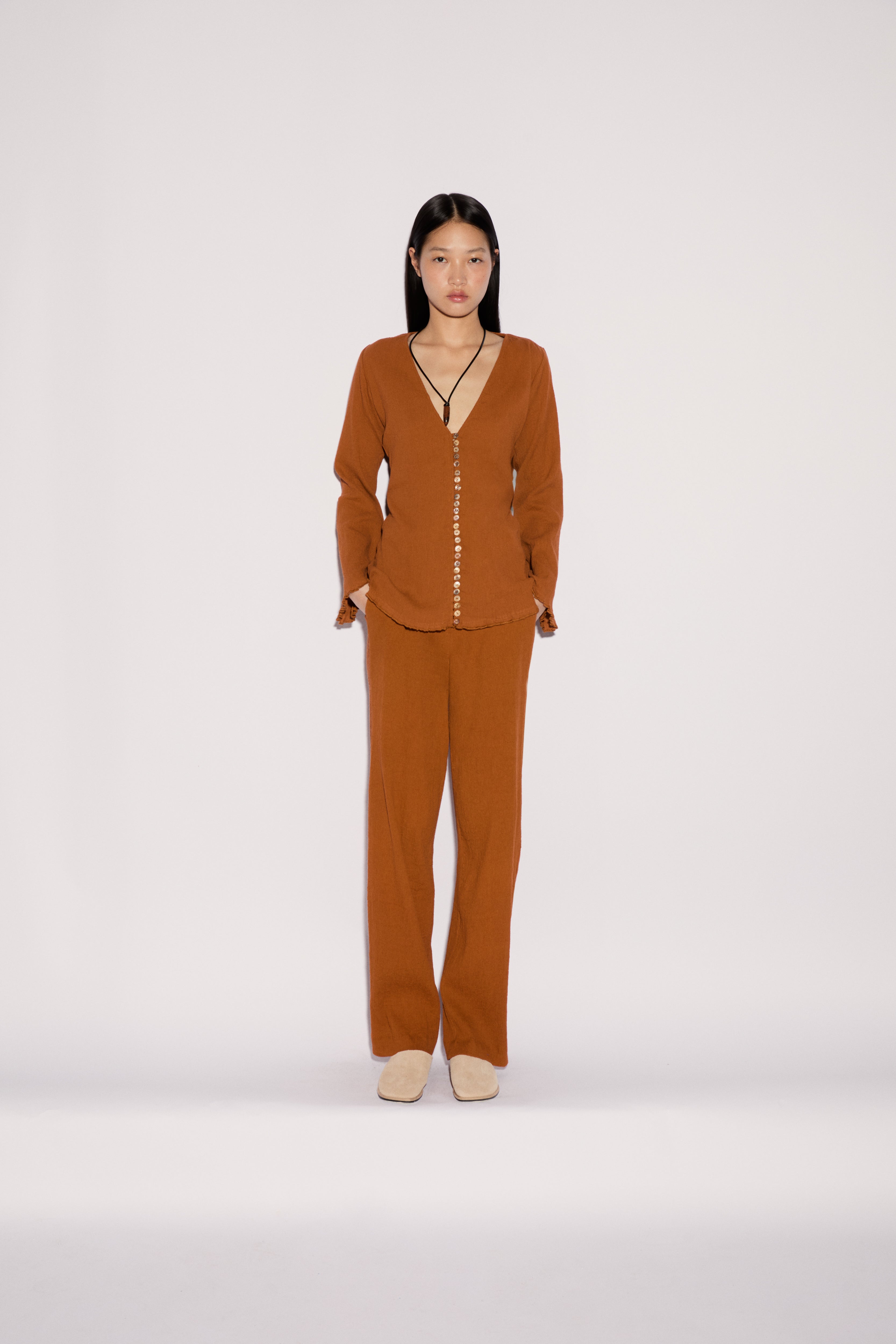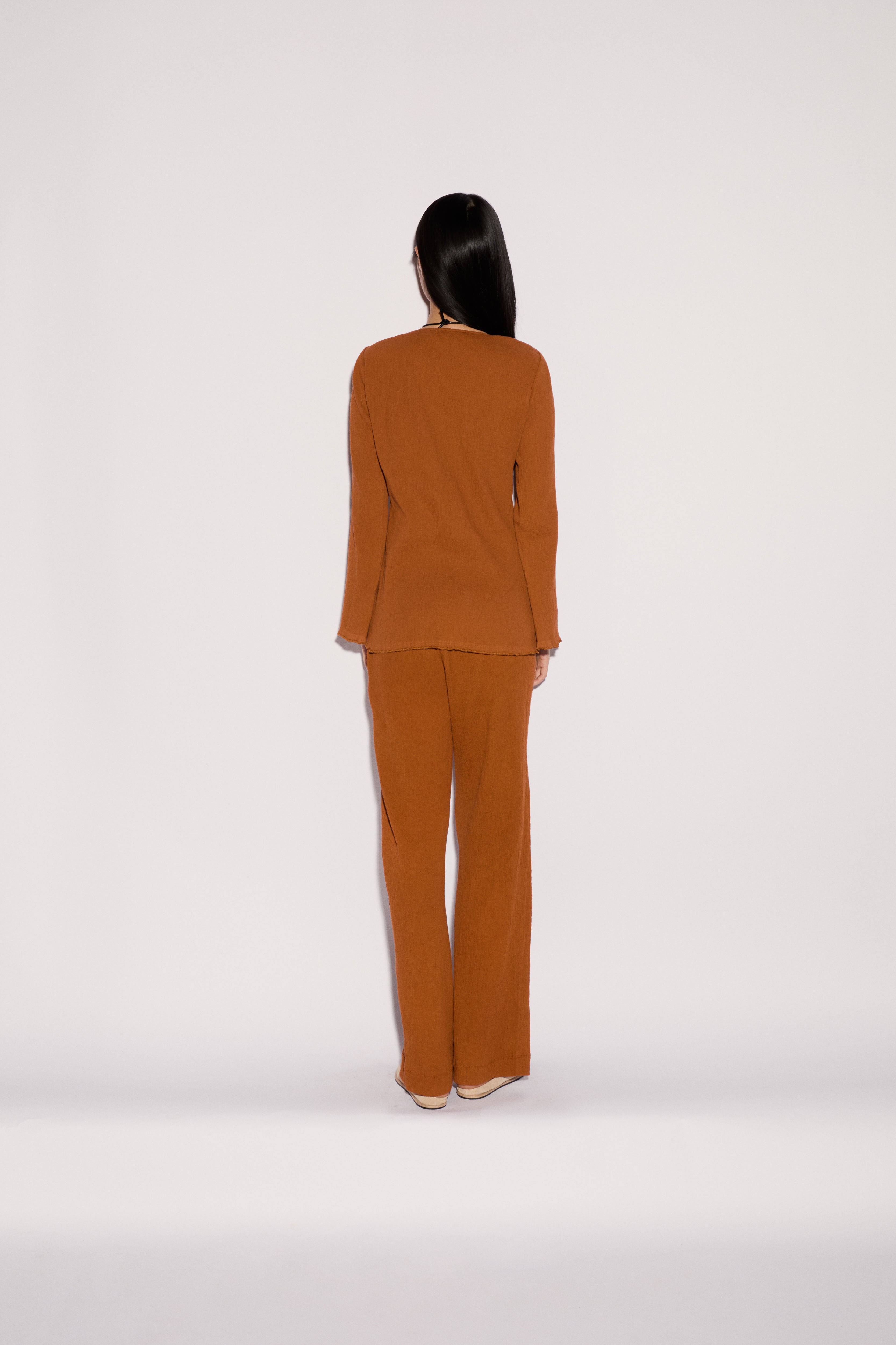 The Cyrus pants are crafted from crinkled cotton in a rustic caramel shade, featuring a relaxed straight-leg silhouette with subtle texture. With their breathable structure and fluid shape, they bring a sense of ease to everyday wear.