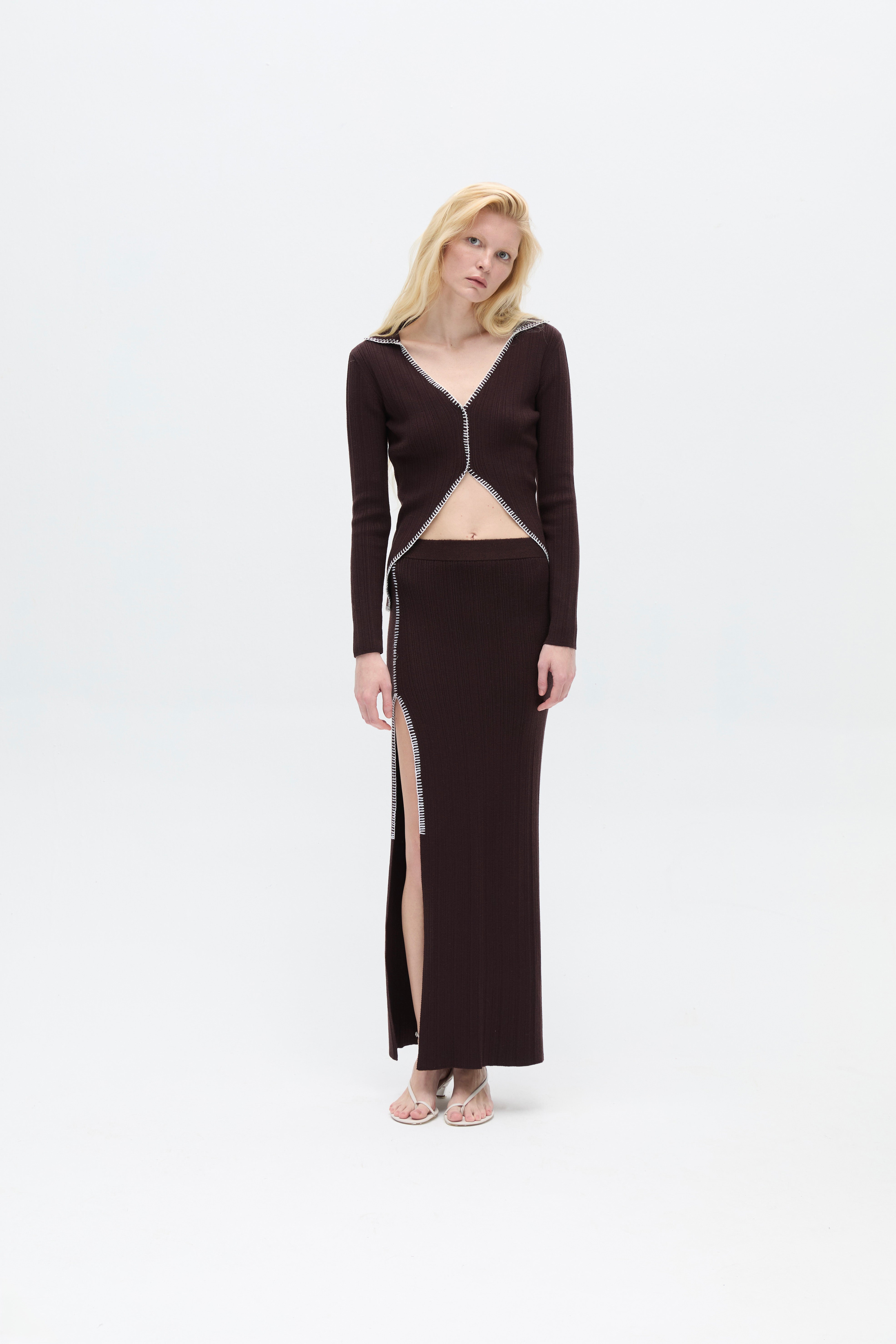The Iris Skirt is a sleek knitted piece elevated by a side slit and refined hemstitched detailing. Cut for a streamlined fit through the hips and falling to an elegant length, it offers a balance of minimalism and subtle craftsmanship. Designed to pair effortlessly with matching tops or to add texture to simple separates.