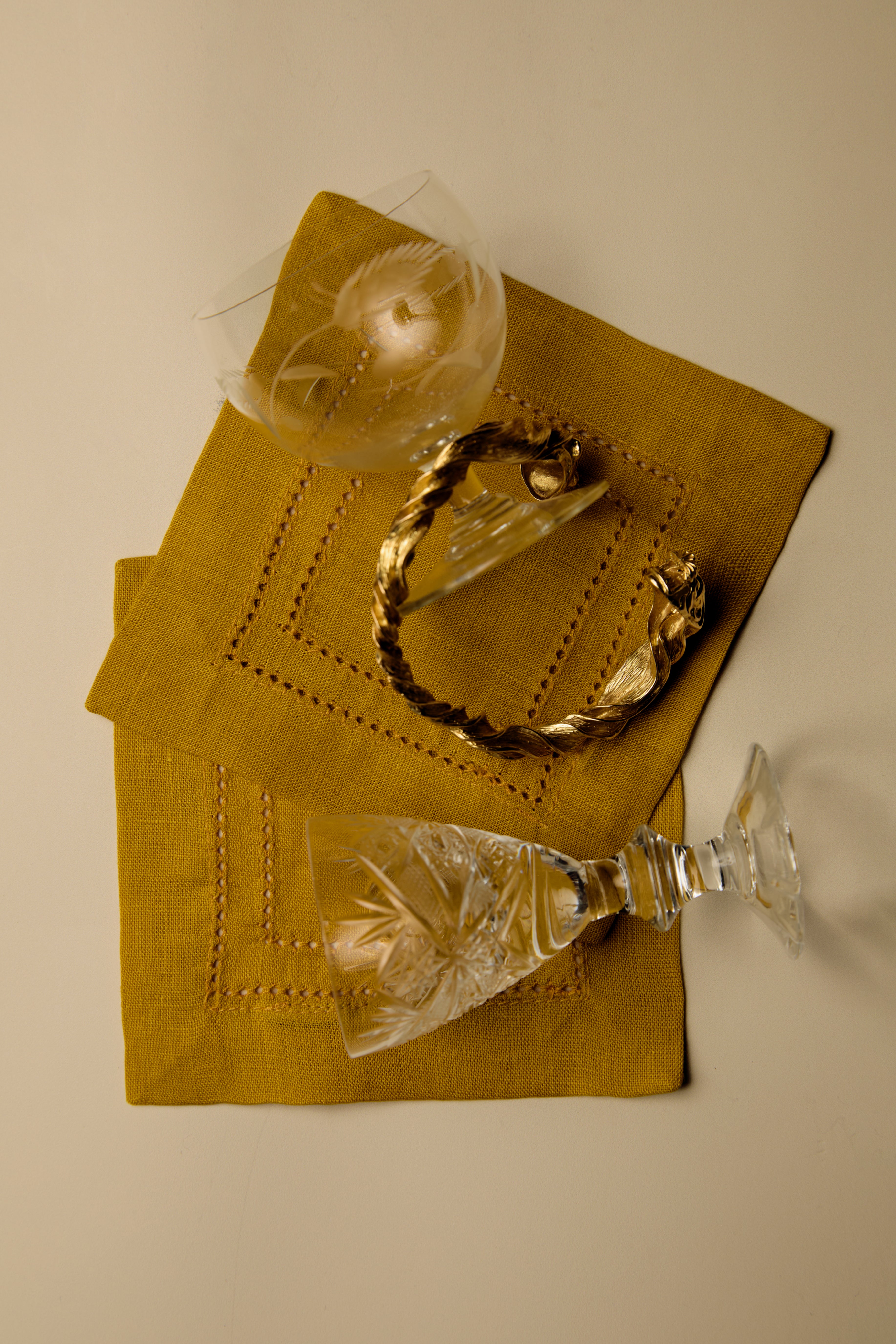 Maena Coaster Set is crafted from pure linen in a warm mustard hue, combining natural elegance with everyday functionality. The solid color design blends effortlessly into any table setting, while the finely stitched edges add a subtle detail. Sold as a set of 4, they’re perfect for protecting your table and elevating presentation at the same time.