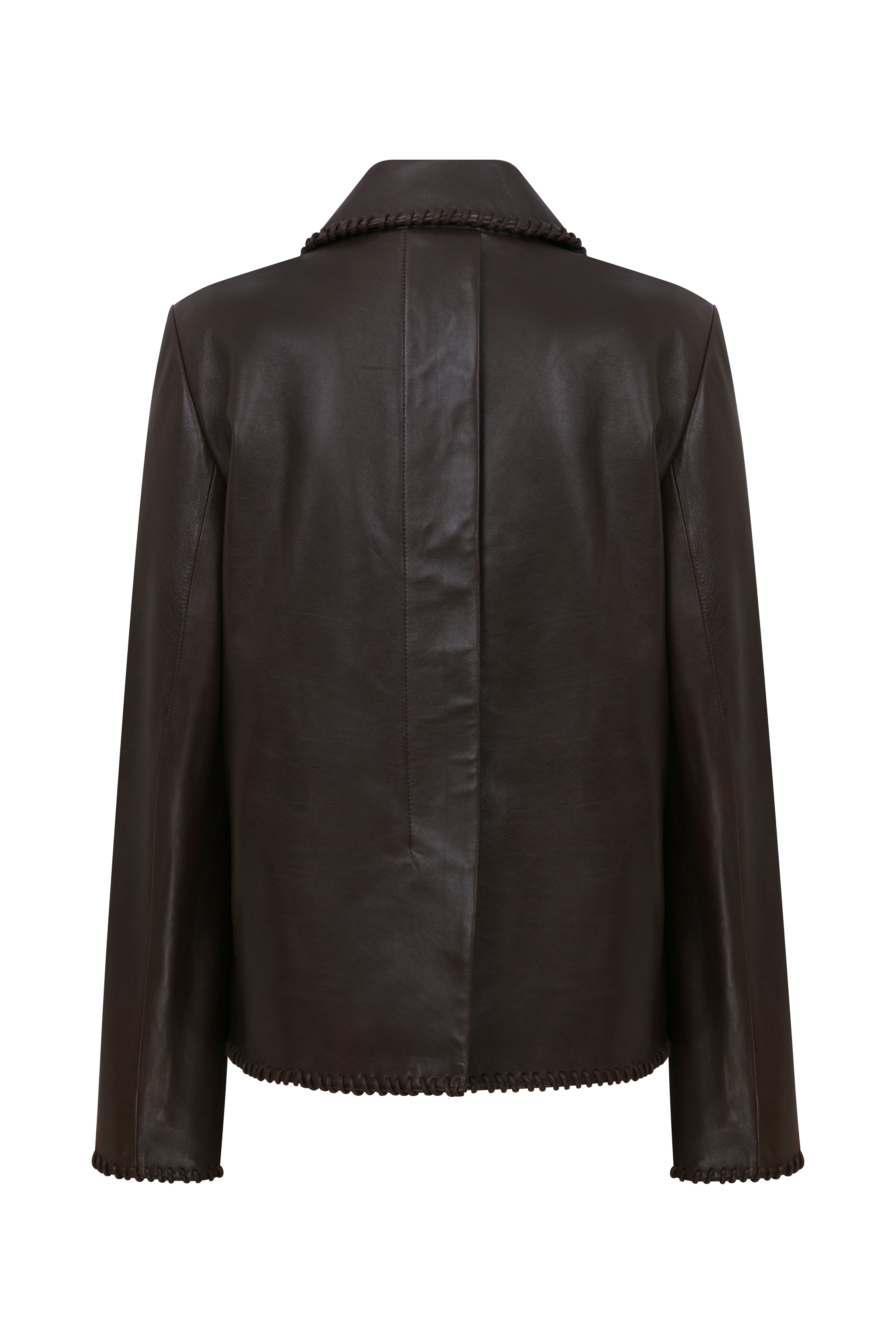 The Devon Jacket is a collared leather jacket in rich dark brown, crafted from supple lambskin. It features a tailored silhouette with subtle structure through the shoulders and a relaxed drape over the body. The hemstitched edges add artisanal detail, making it a versatile layer for both refined and casual styling.