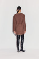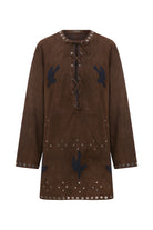 The Hudson Dress is a brown suede dress detailed with tonal embroidery and lace-up tie accents at the neckline. Designed in a straight, relaxed silhouette, it offers a comfortable fit while maintaining a polished, statement look. Grommet embellishments along the cuffs and hemline add subtle edge, making it a versatile choice for both day and evening wear.