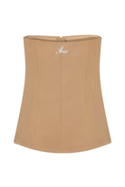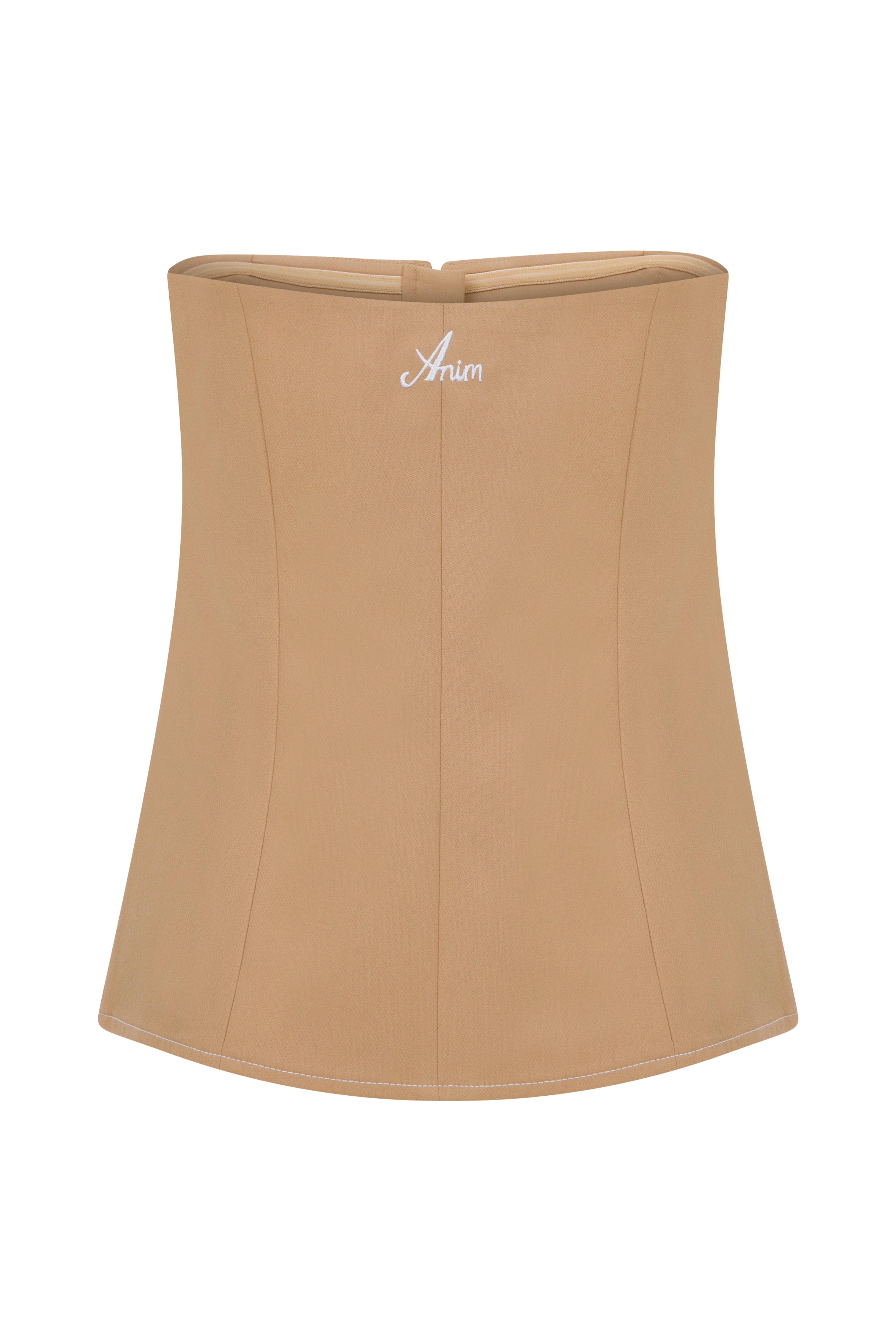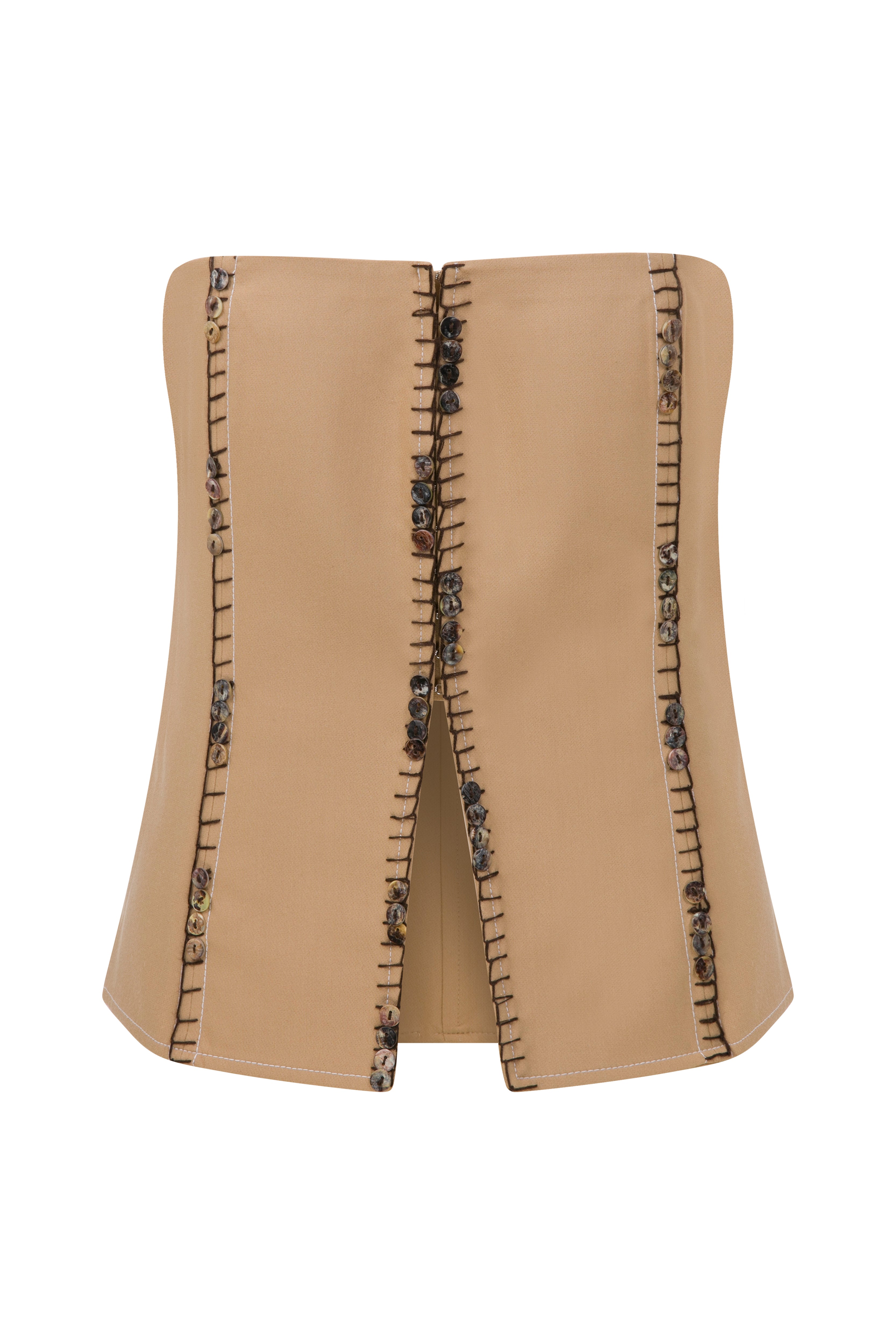 The Dua Top is a strapless top in a warm beige tone, crafted from a structured polyester-viscose blend with a hint of elastane. Designed for a close, supportive fit, it contours the torso while allowing comfortable movement. The vertical hemstitched panels and shell button accents bring a touch of artisanal detail to its minimalist silhouette.