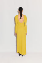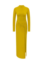 The Wade Dress is a high neck long sleeved maxi dress with asymmetric drapping details, presented in a striking mustard shade that reflects the warmth of the season. Made from fluid viscose, it features a slim fit bodice that hugs the waist and hips, complemented by elegant draping that adds movement and flow. The maxi length elongates the figure, creating a refined and statement-making style.