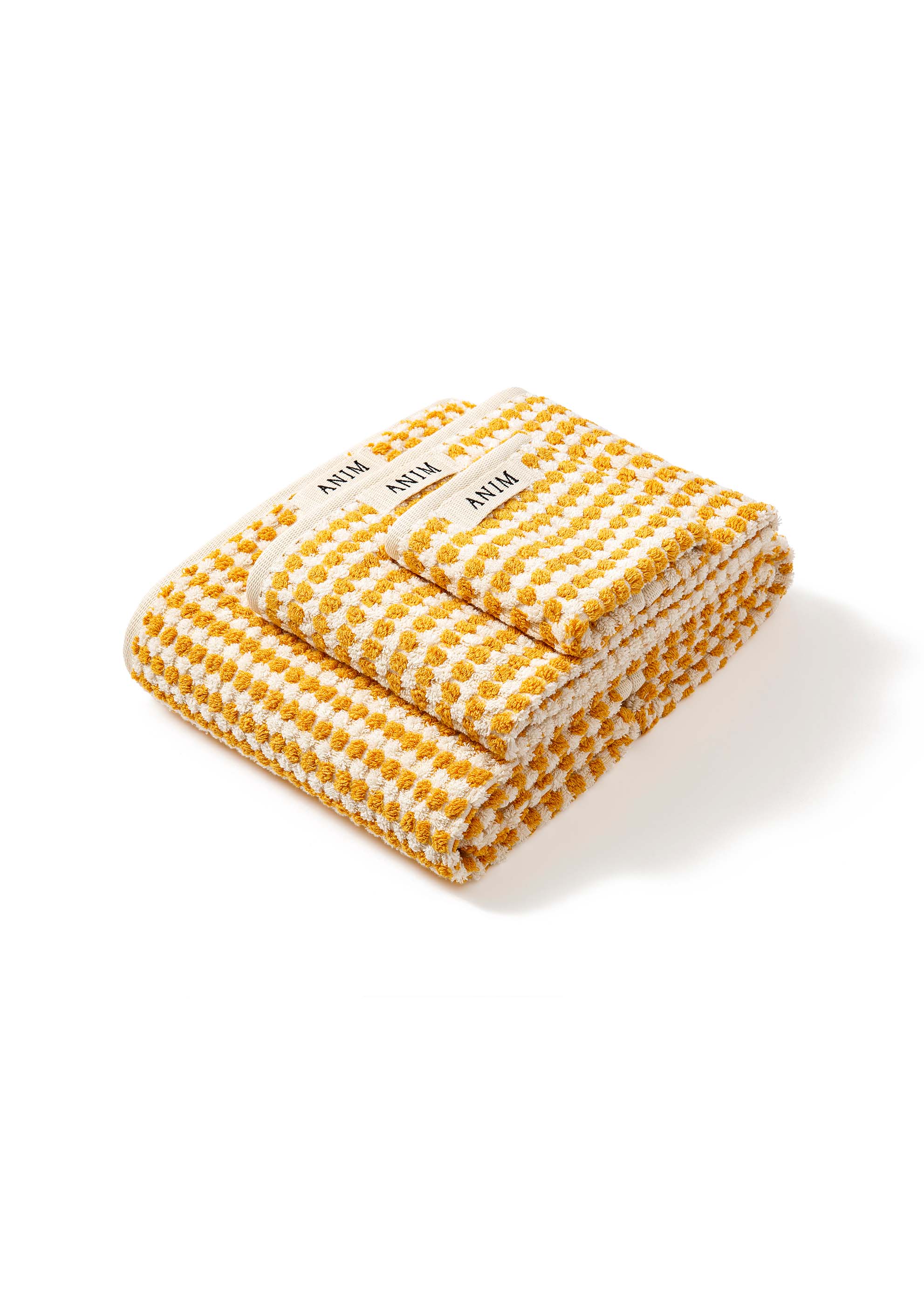 The Cheka Towel Set combines soft tones with a cheerful touch through its checkered design in yellow and cream hues. Made from pure cotton, its absorbent texture offers comfort for everyday use while adding warmth and an elegant feel to your bathroom.