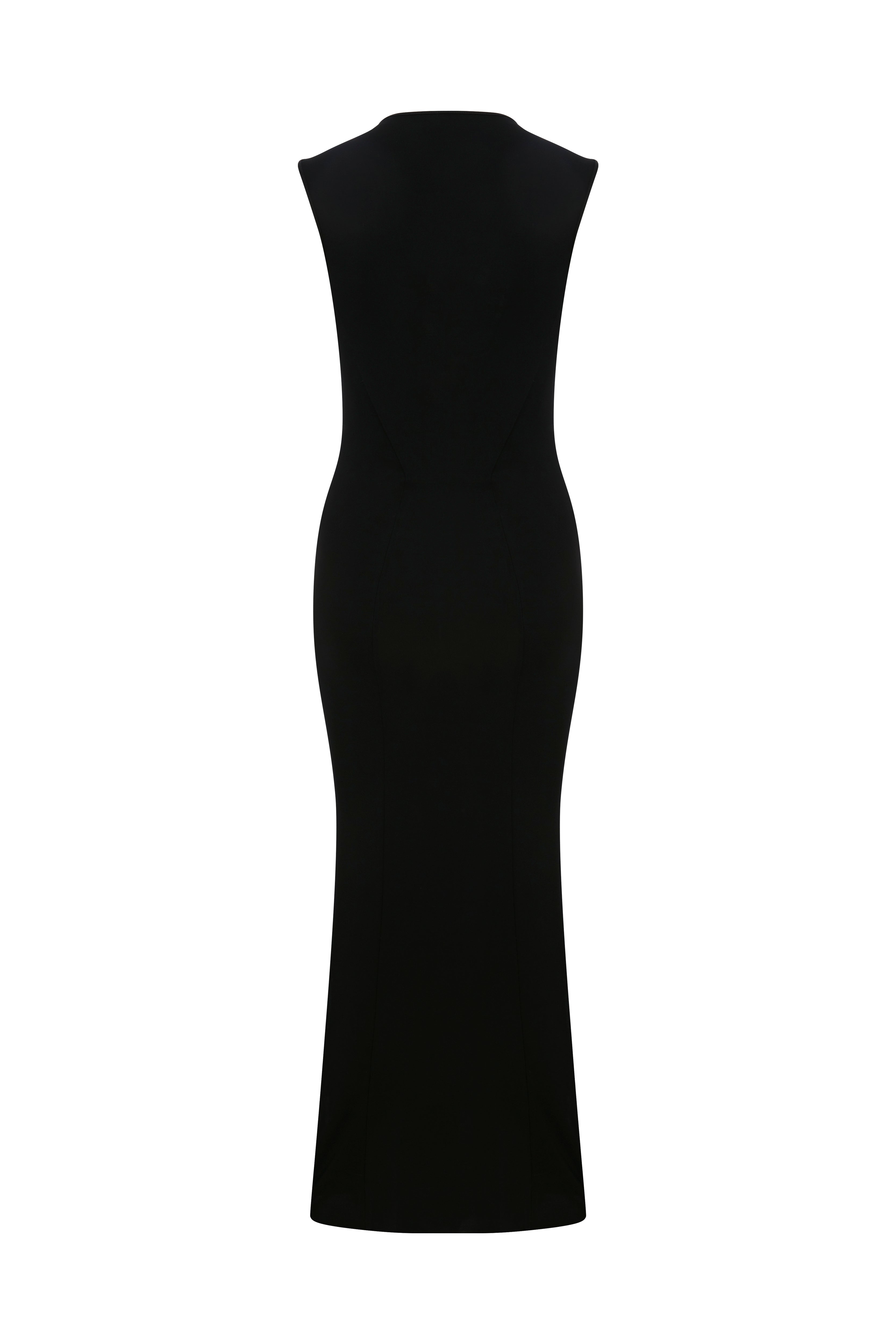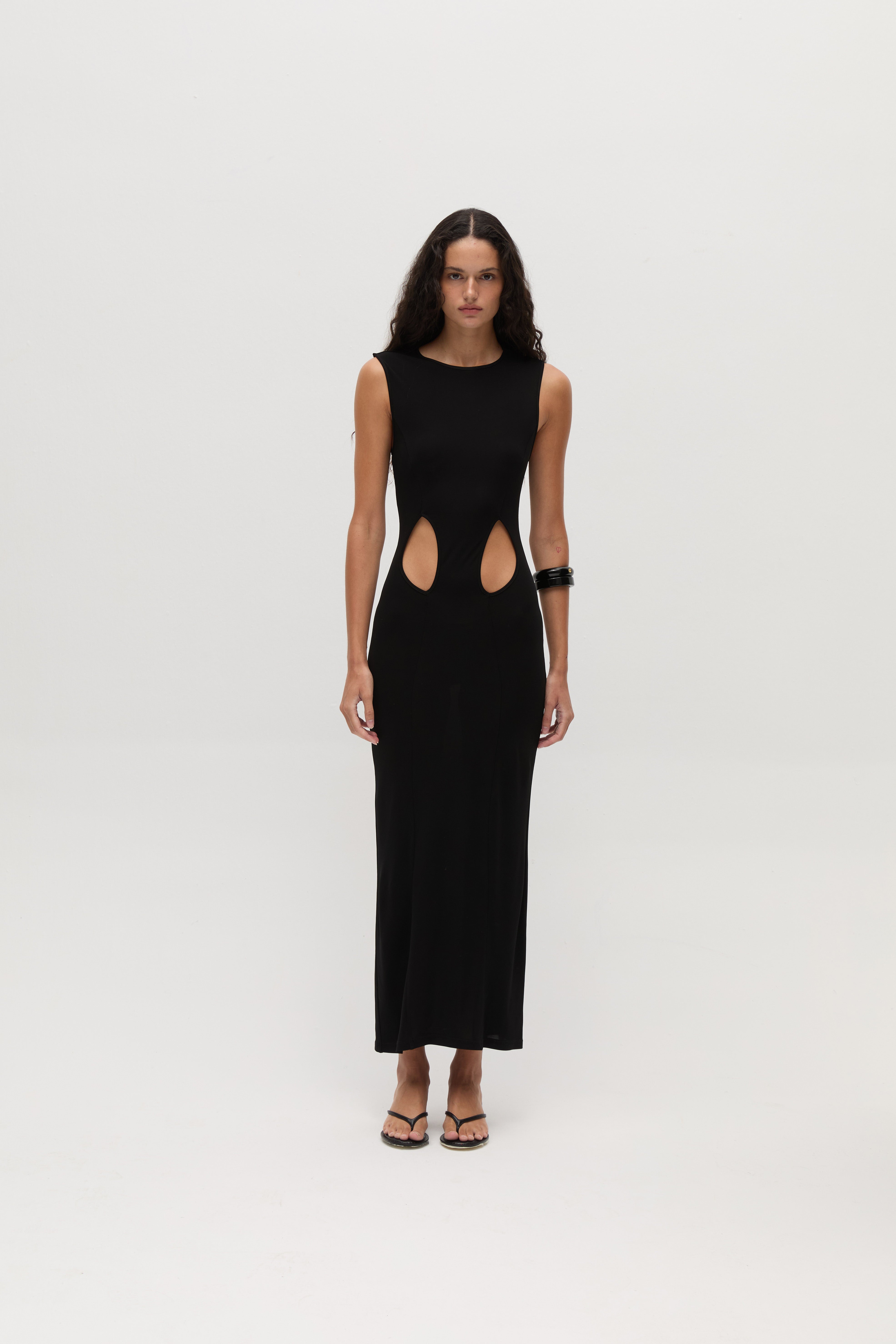 The Meli Dress is made from soft jersey, featuring a sleeveless midi design with striking cut details on the front. The sleek, body-tracing fit accentuates the waist and elongates the silhouette, while still allowing comfortable movement. This balance of structure and ease creates a modern, confident look that transitions seamlessly from casual moments to refined evening occasions.
