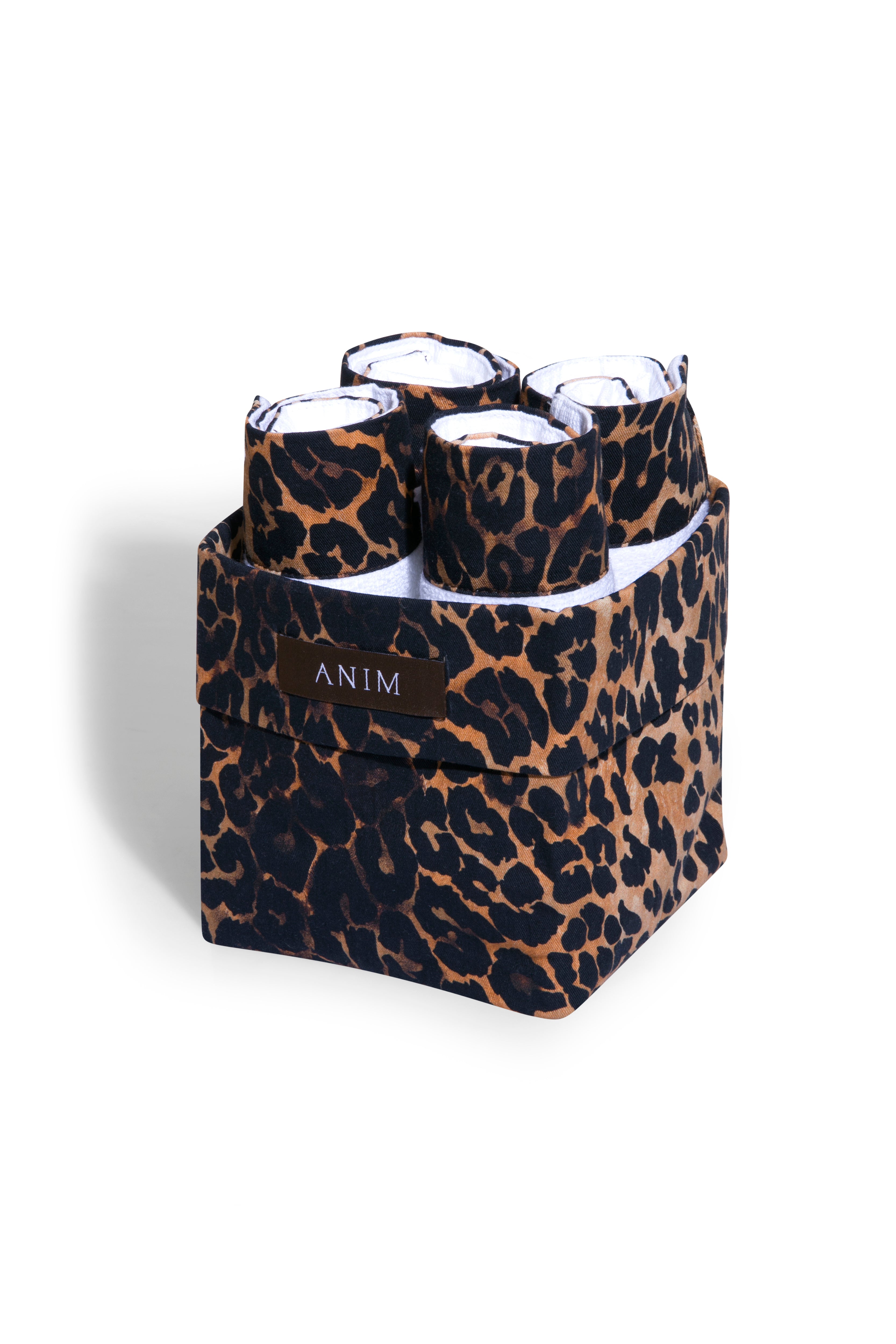 The easiest and coziest way to cheer up your bathroom, while upgrading it with the finest quality of Turkish towels. The bundle includes four crisp white cotton washcloths, each finished with a leopard striped border that adds a touch of charm. Packed in a matching pouch, this thoughtfully designed set brings together style and function — perfect for daily use, travel, or gifting.