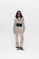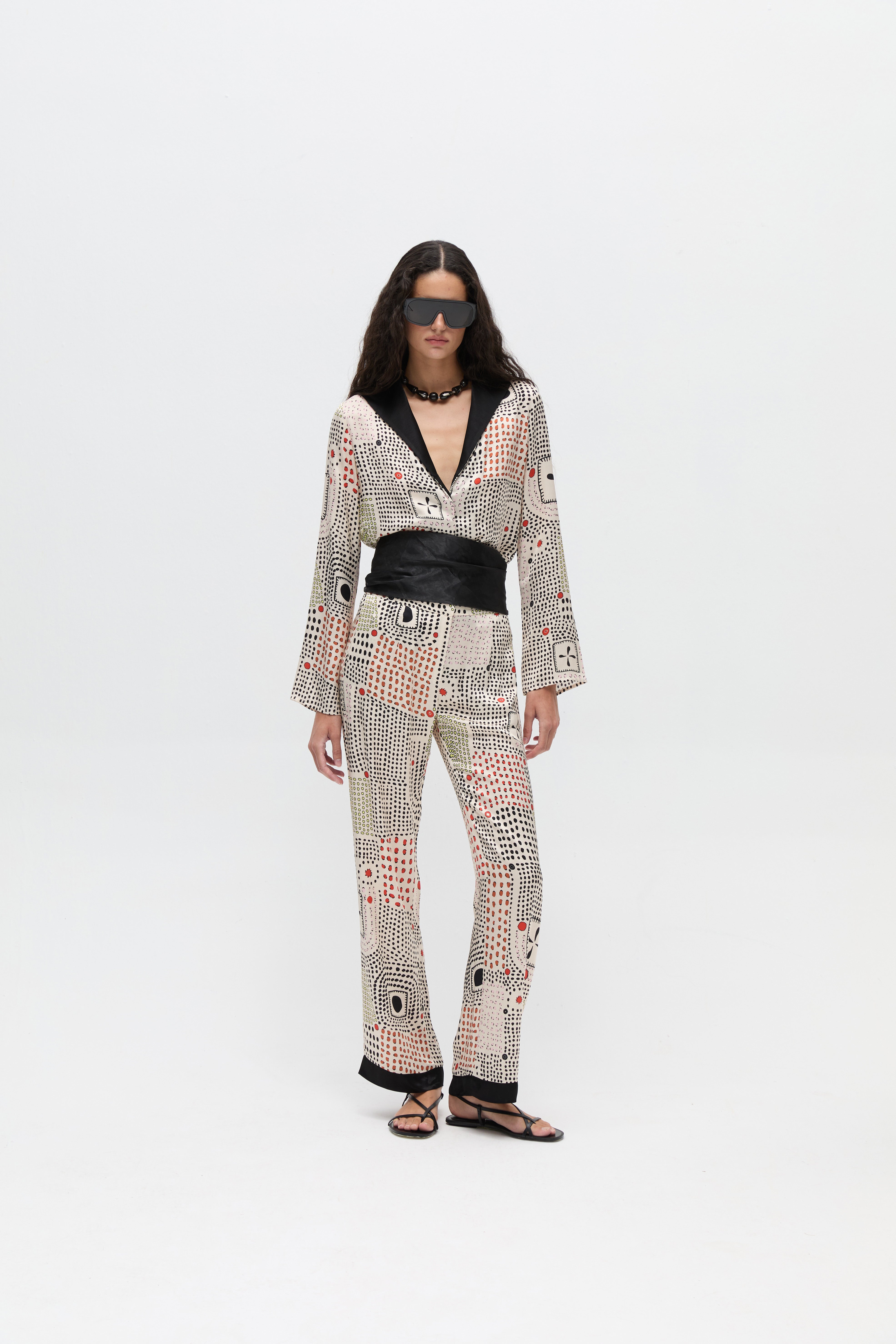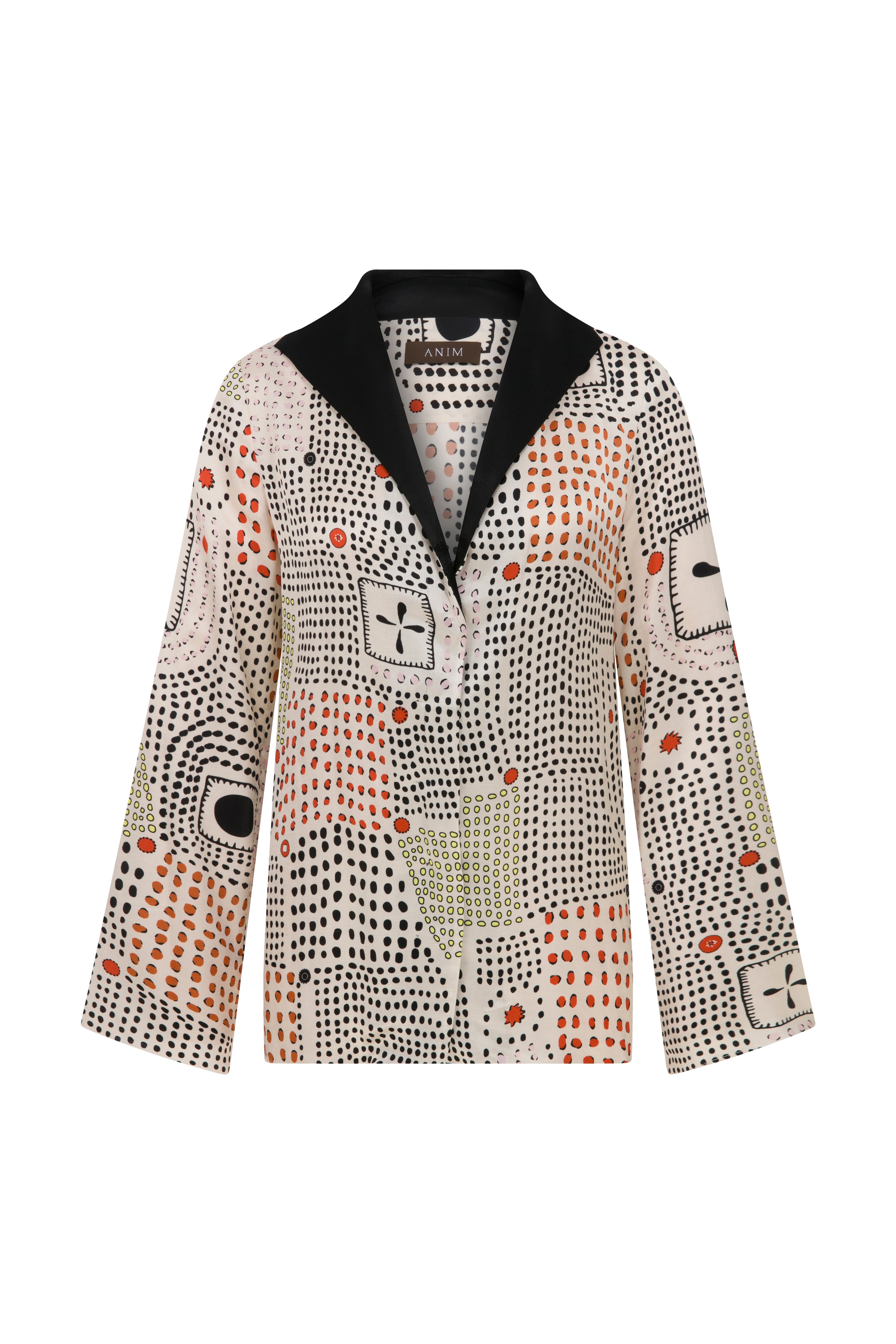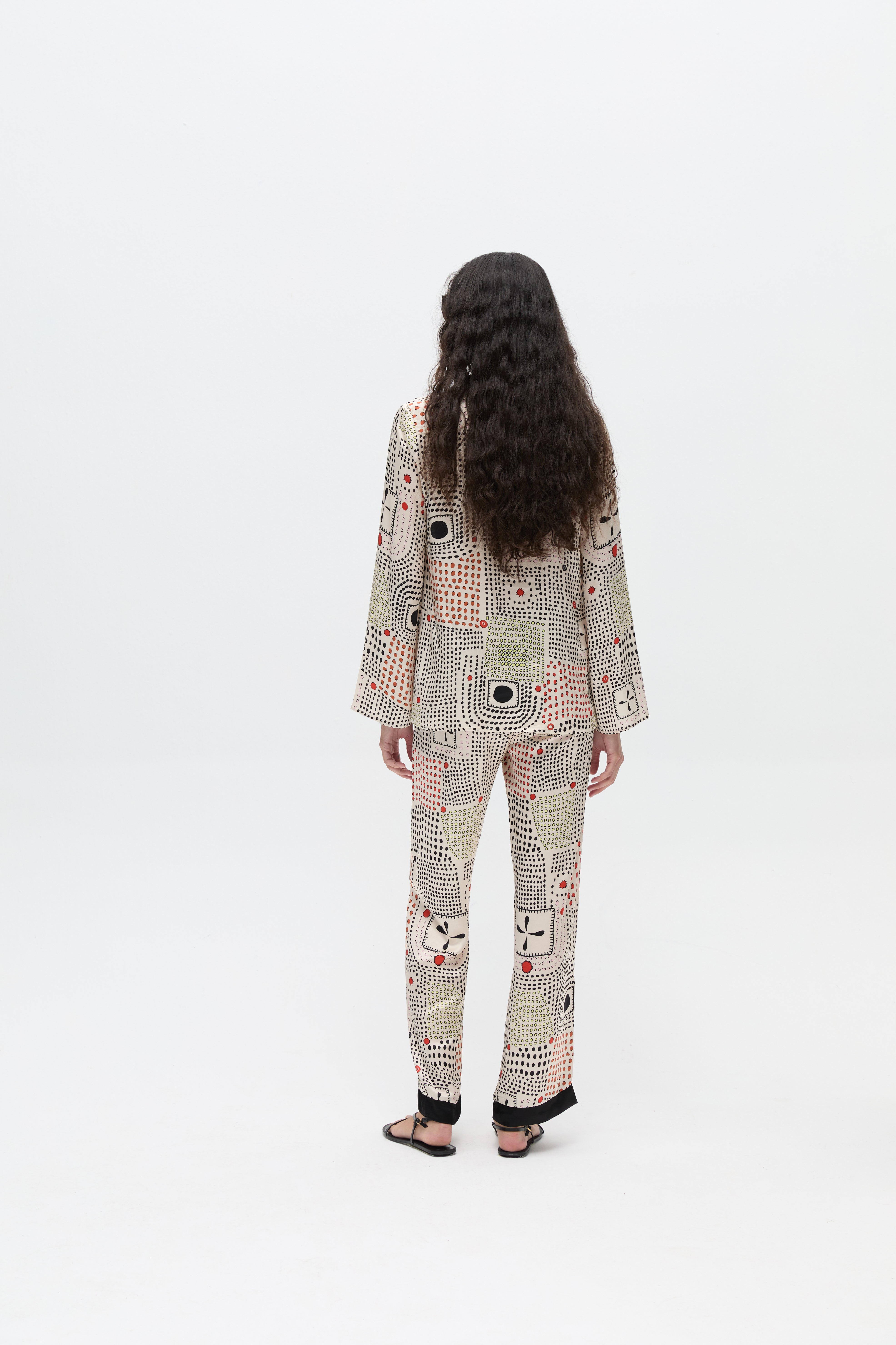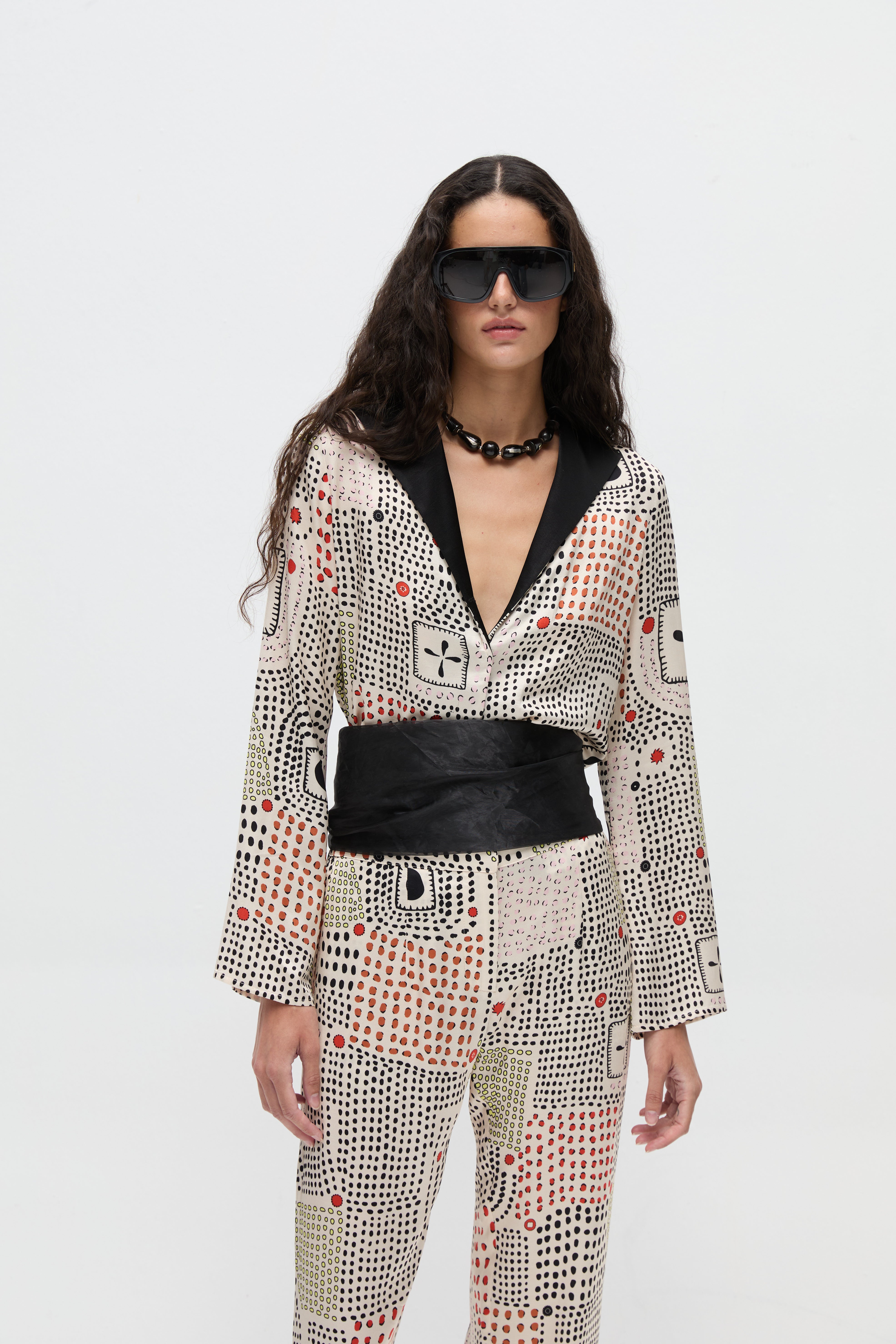 The Pippa Shirt is crafted from satin-textured viscose fabric featuring a vibrant geometric print. Its relaxed fit drapes fluidly over the body, creating a smooth silhouette. The long sleeves and open collar balance casual ease with refined structure, making it a versatile piece for both everyday and elevated looks.
