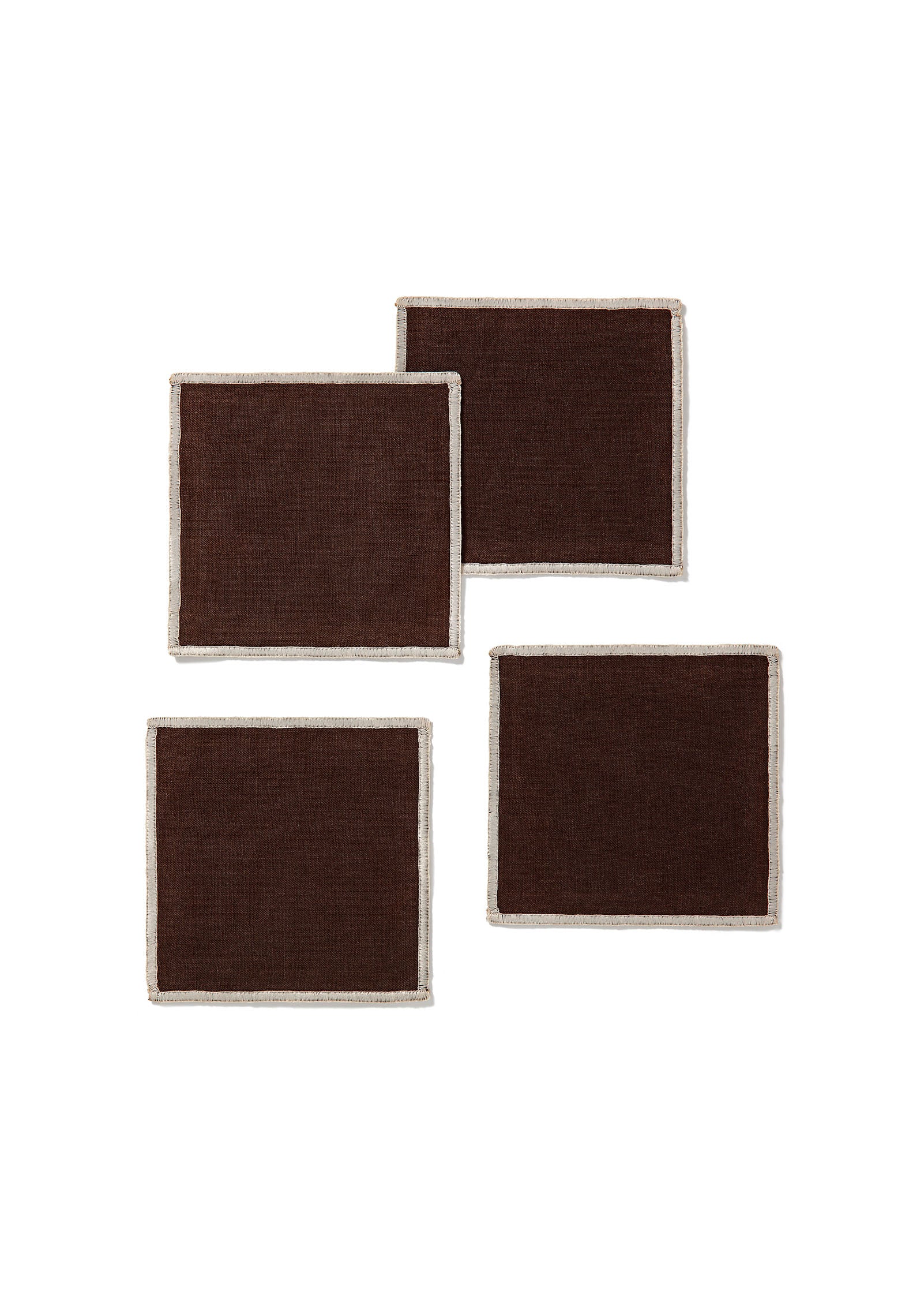 Margot Coaster Set includes four brown linen coasters accented with contrast beige piping, offering a warm, grounded tone elevated by a refined finish. A versatile choice for both everyday and elegant settings.