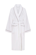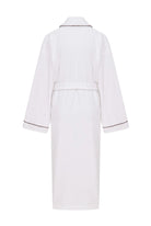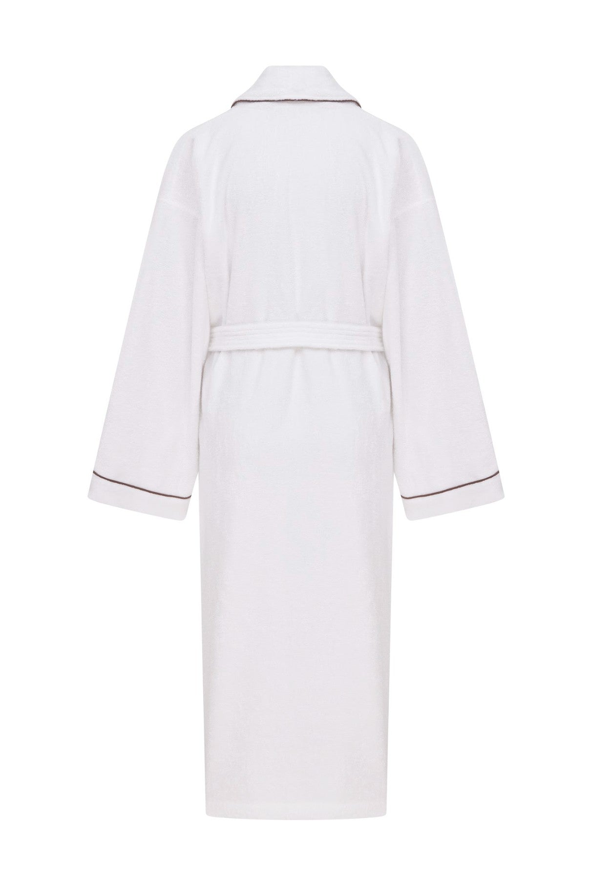 Rea White Robe is an elegant bathrobe in a rich white tone, offering both comfort and style for moments of relaxation. Crafted from soft, absorbent fabric with brown piping, it’s perfect for wrapping yourself in after a bath or lounging at home.