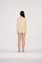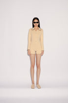 The Mirae Jumpsuit is crafted from a cotton-polyester blend in a soft beige tone, designed with long sleeves and a flattering mini cut. Accented with brown hemstitched detailing, it blends tailored structure with subtle handcrafted charm.