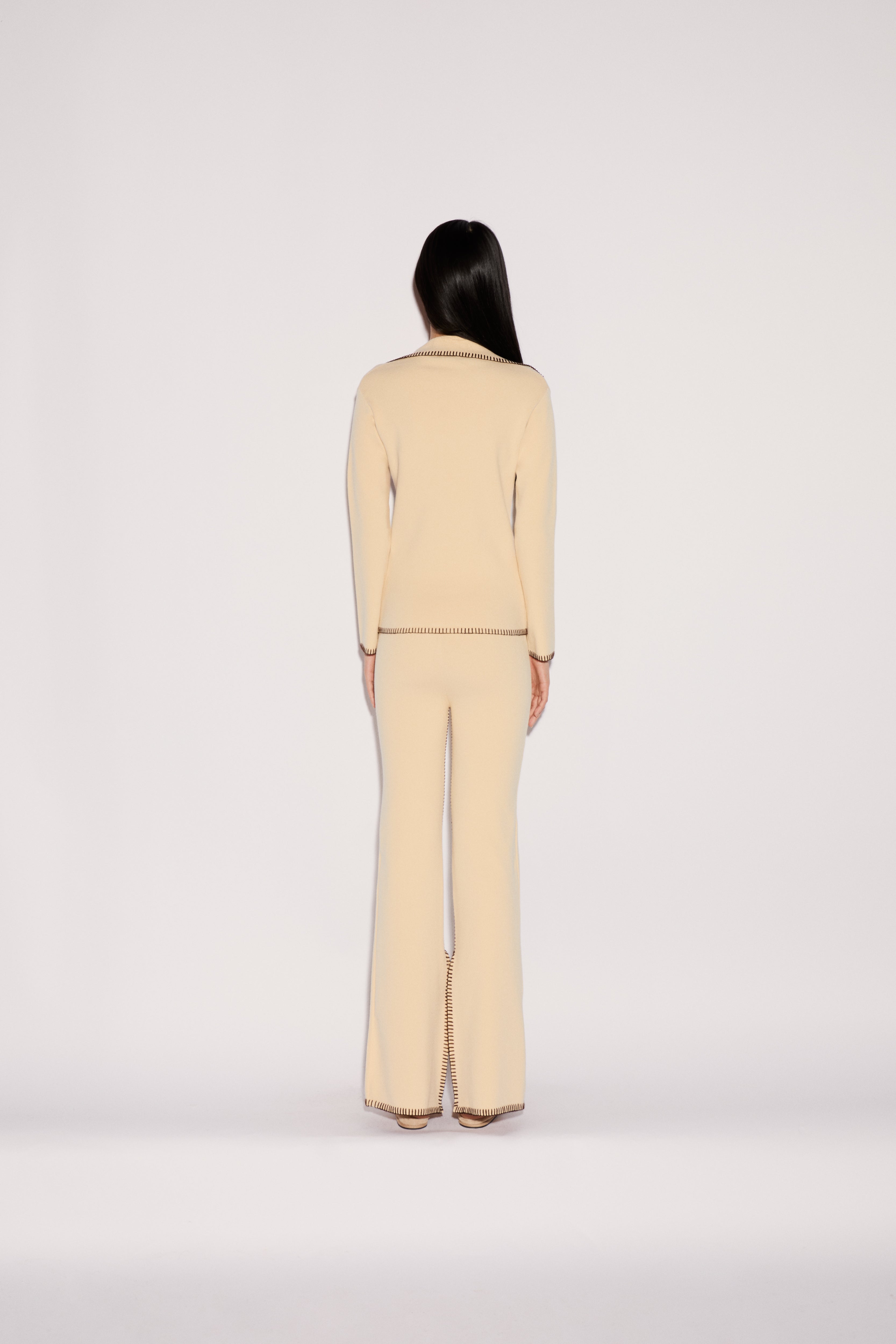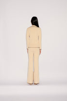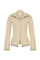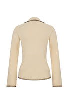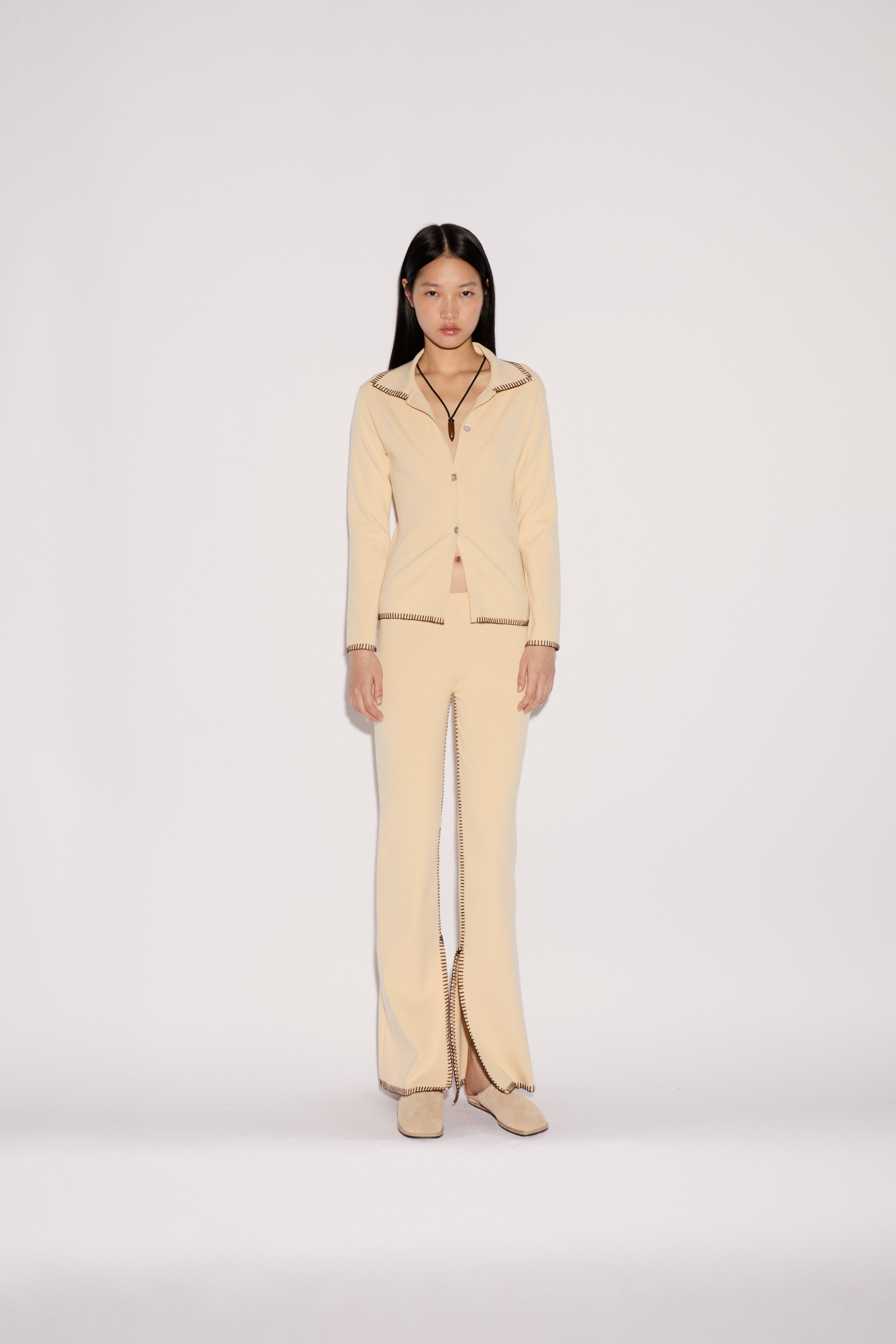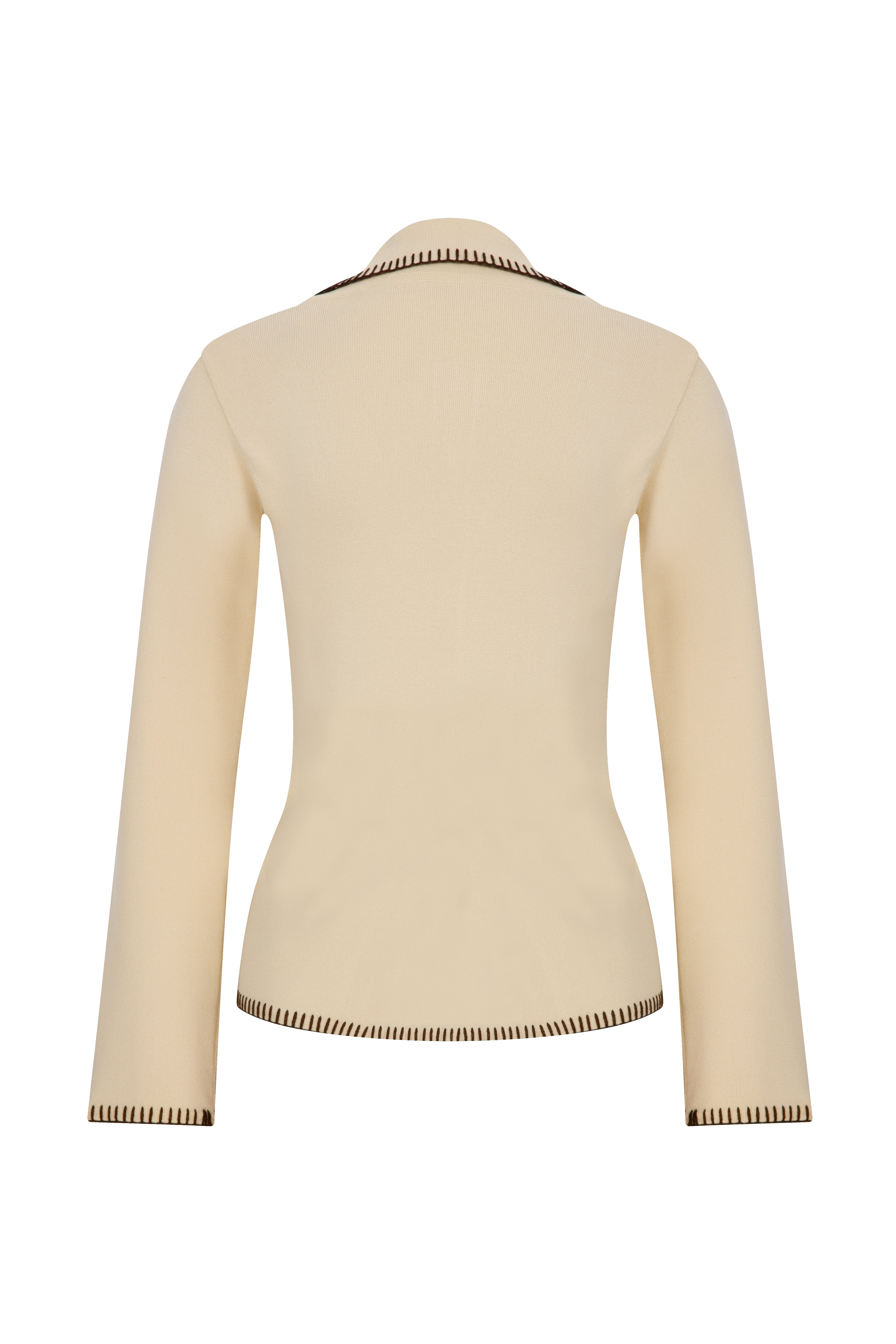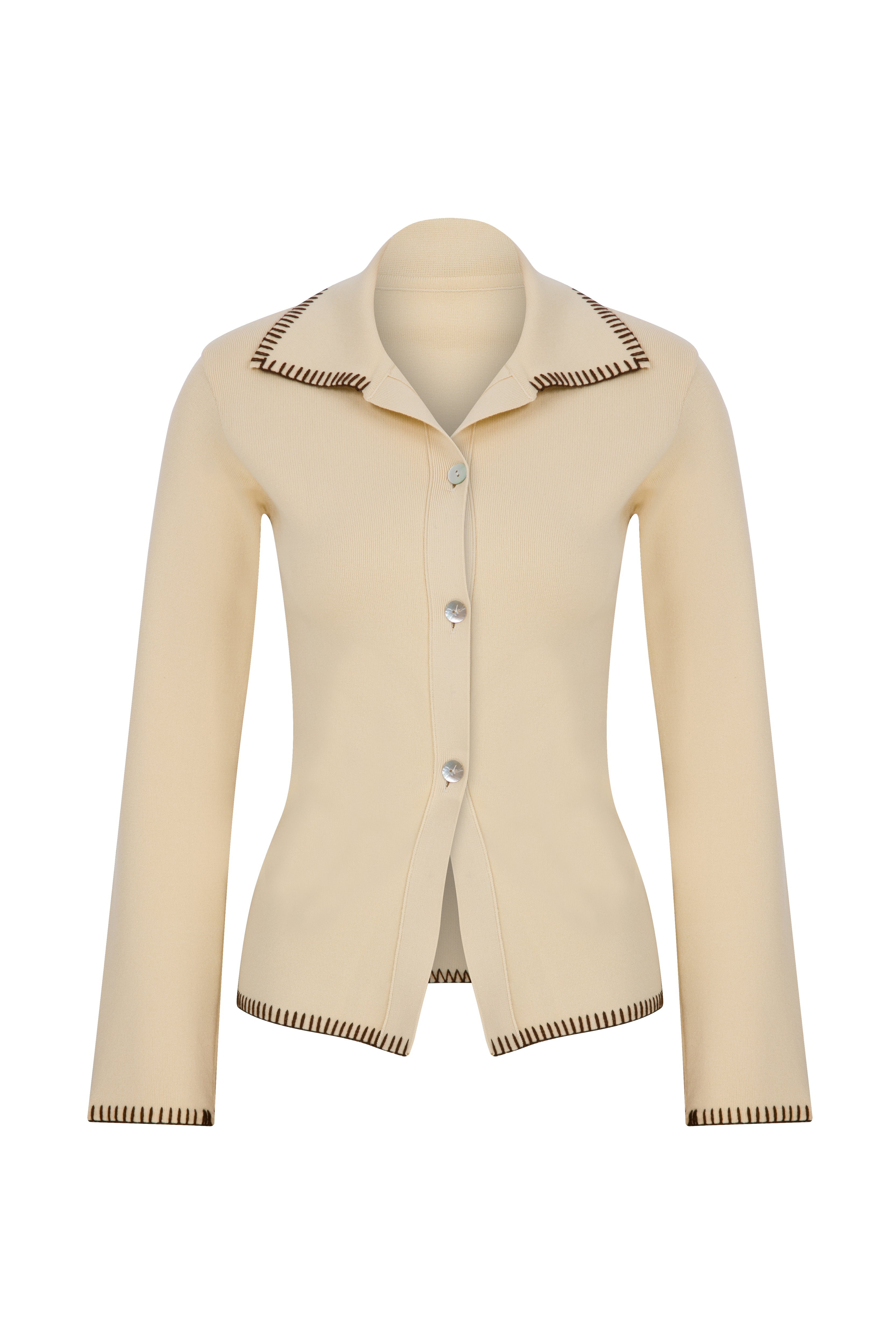 The Koza Top is crafted from a cotton-polyester blend in a soft beige tone, featuring front button closure and delicate hemstitched accents. Its long sleeves and tailored silhouette offer a refined, everyday essential with subtle artisanal touches.