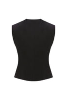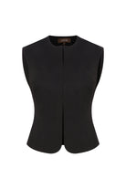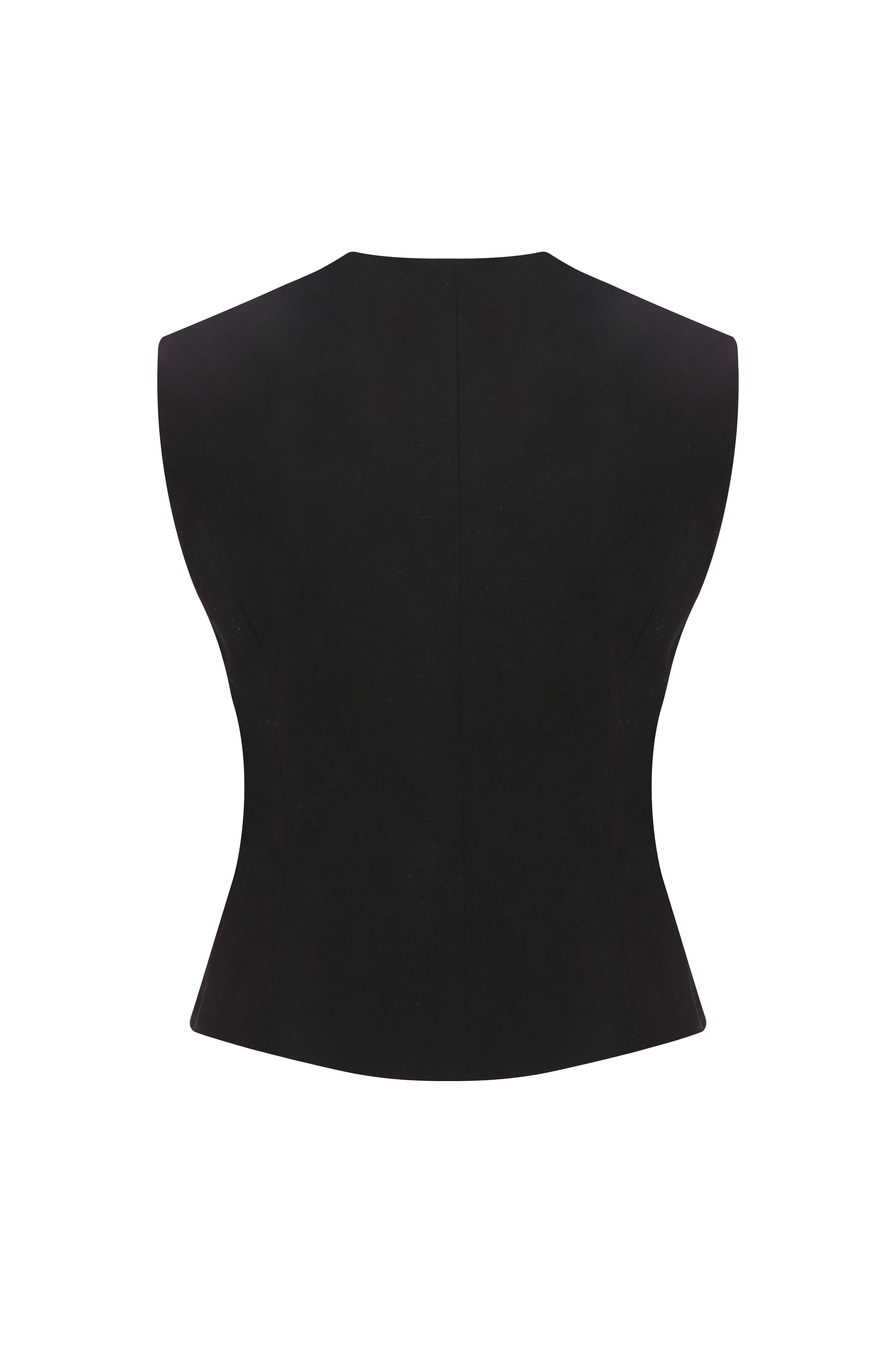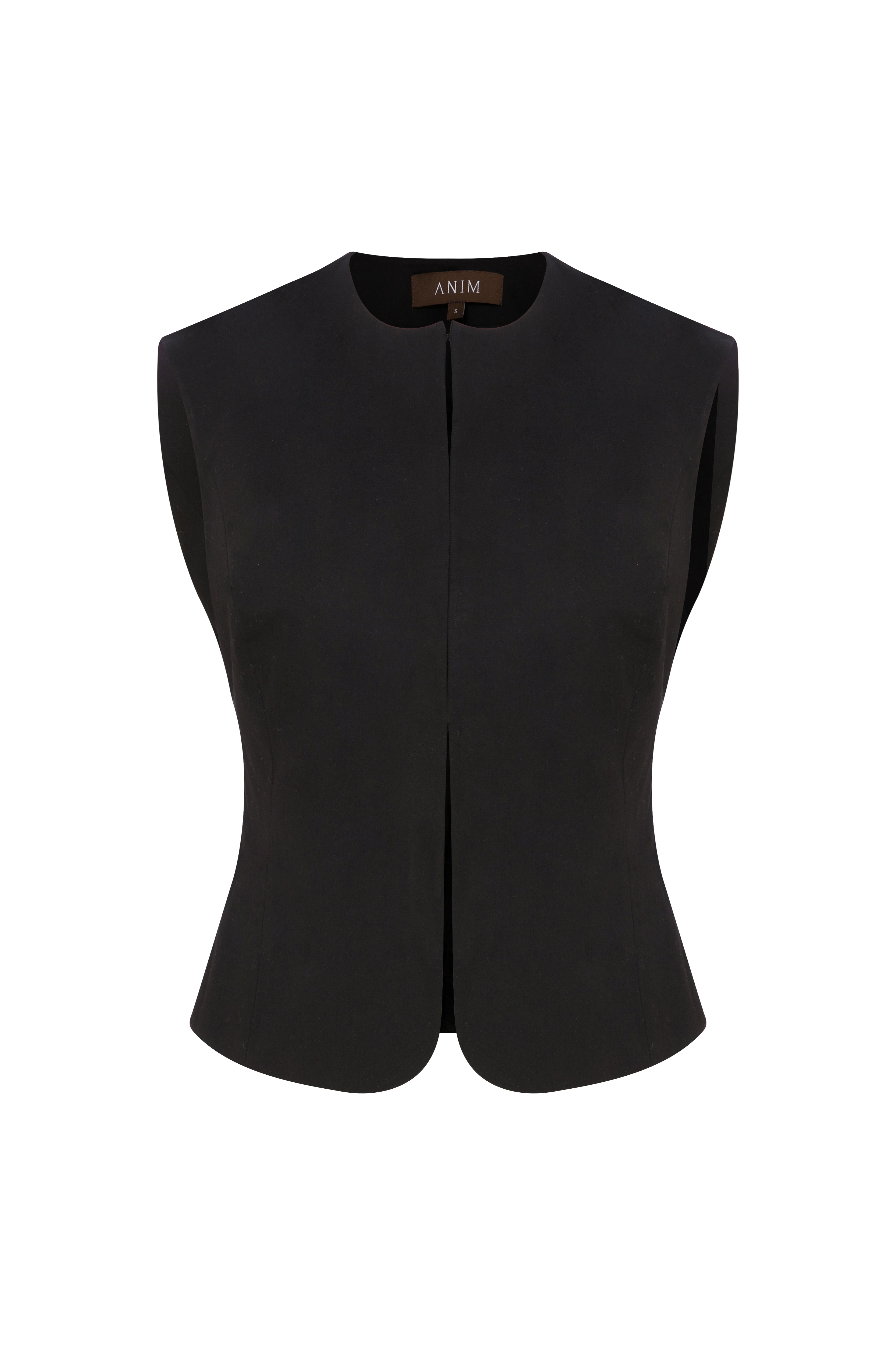 The Sova Vest is crafted from sturdy cotton gabardine in classic black, featuring a clean, tailored silhouette and a hook-and-eye front closure. Sharp and minimal, it’s a versatile layering piece with a modern, structured feel.