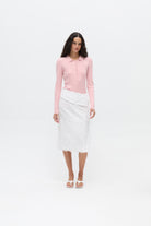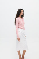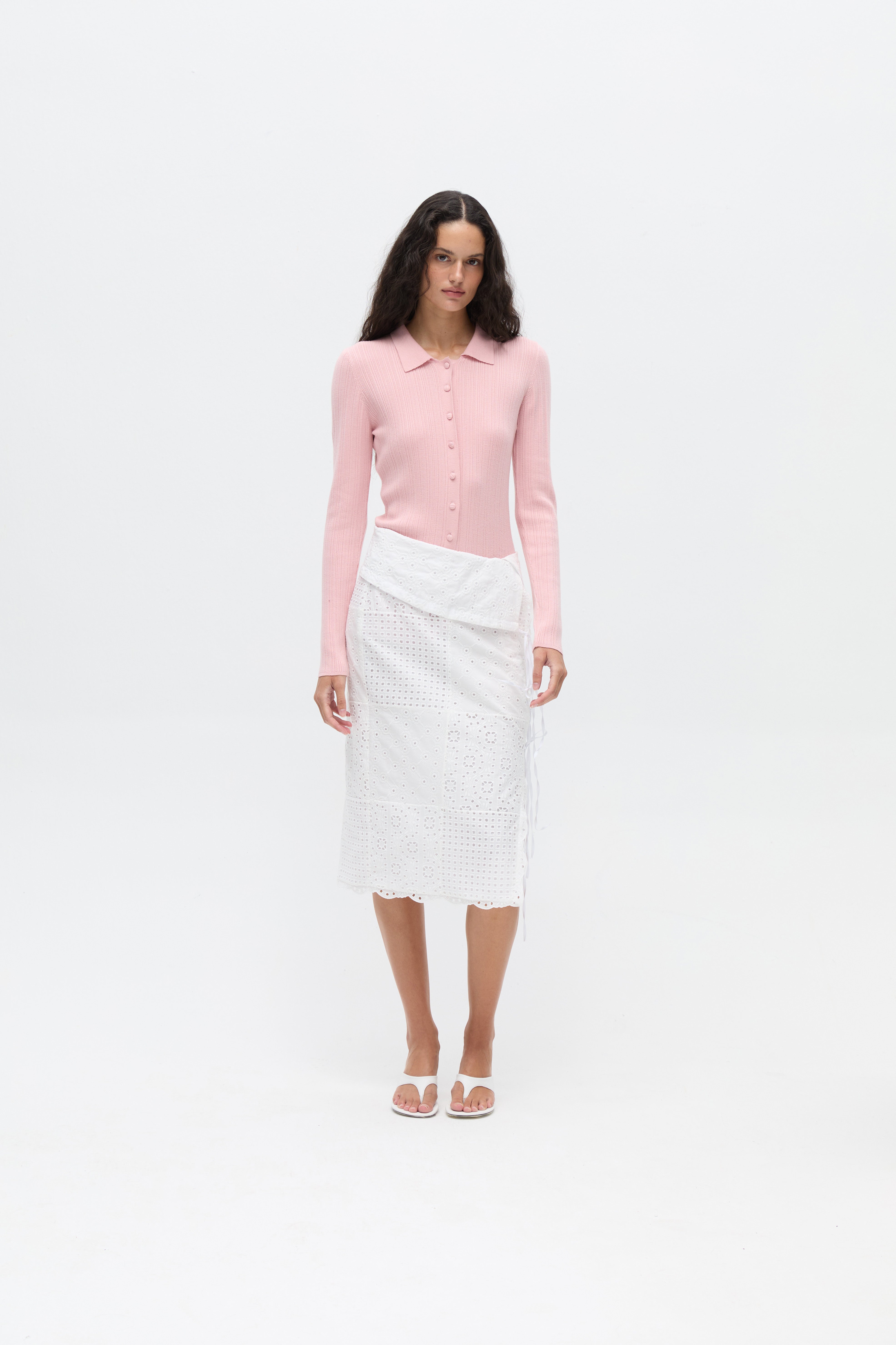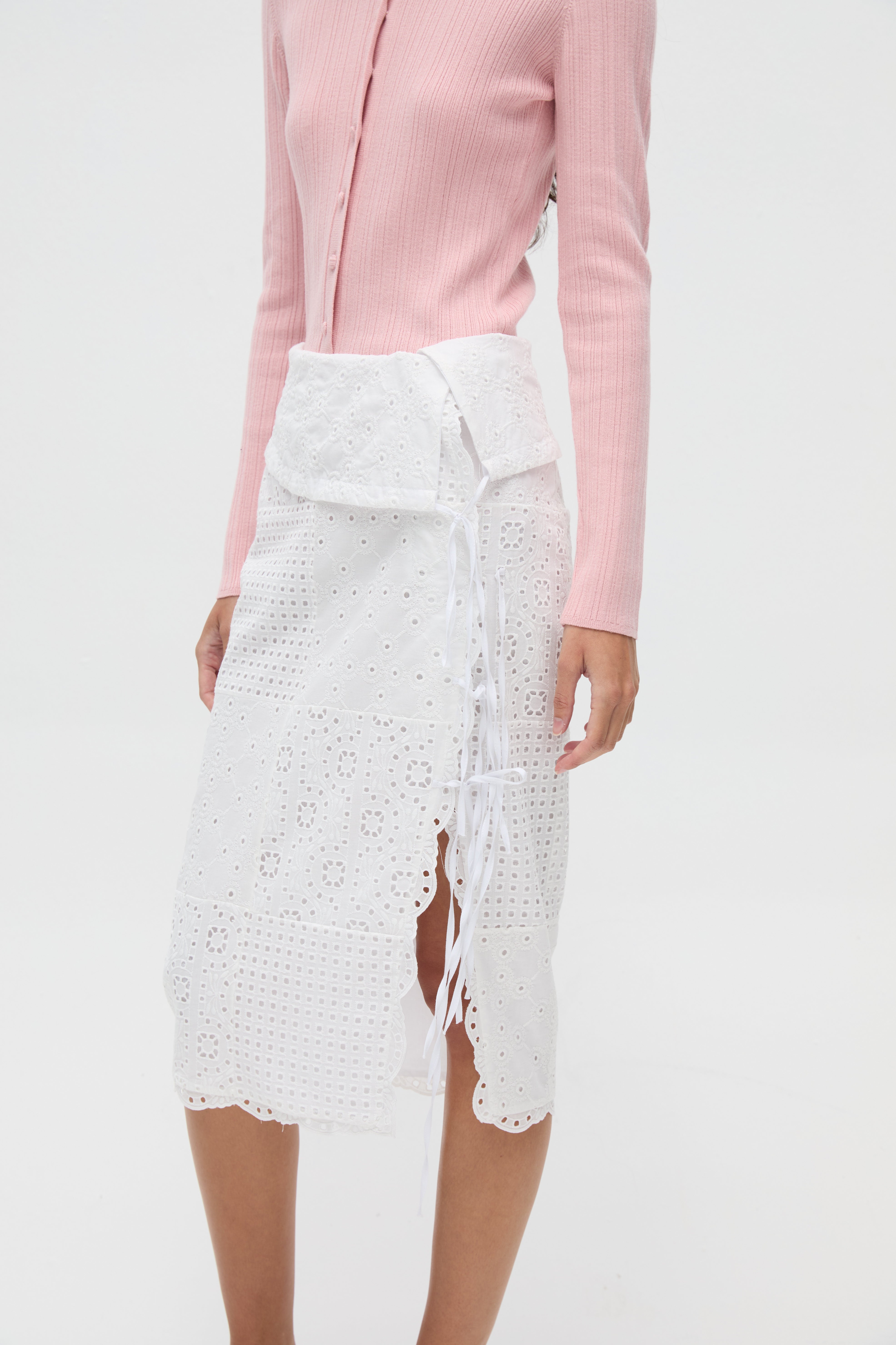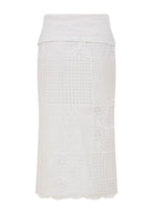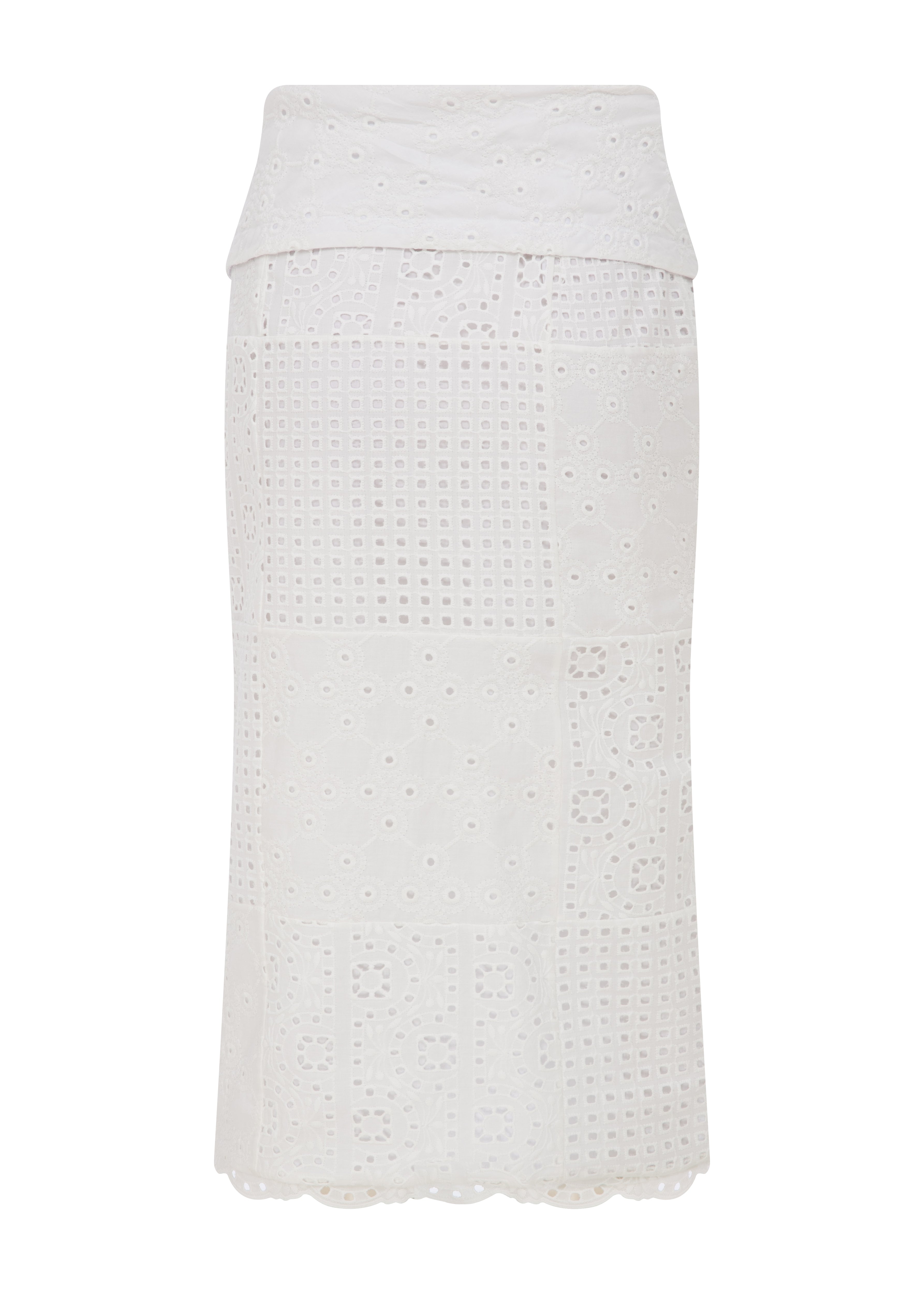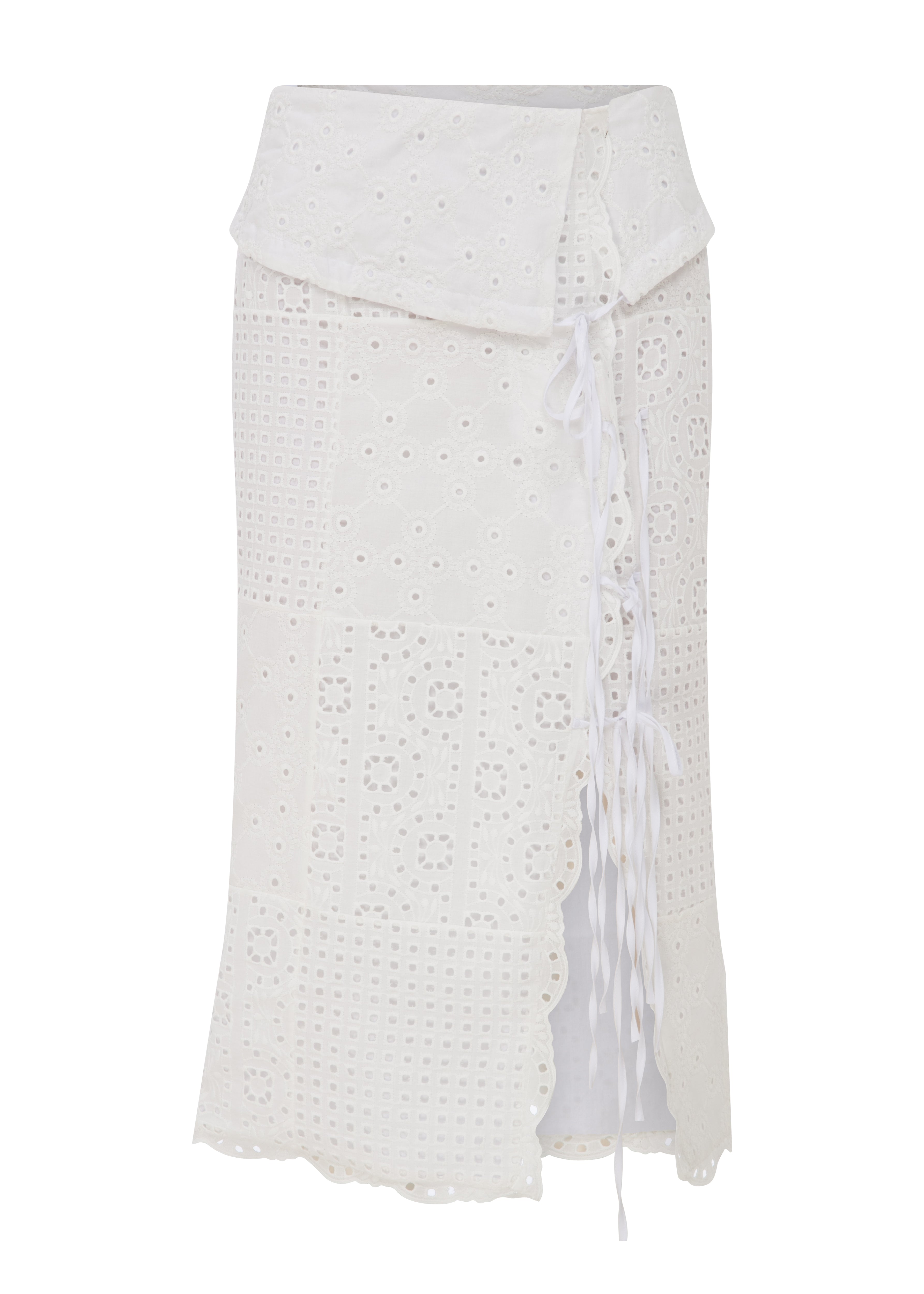 The Elise Midi Skirt is crafted from embroidered cotton anglaise, featuring a front slit accentuated by delicate tie details. Designed to sit comfortably at the waist, it skims the hips in a streamlined shape before falling to a graceful mid-calf length. Its clean, elongating silhouette makes it a versatile piece that pairs effortlessly with both casual tops and more structured blouses.