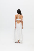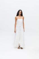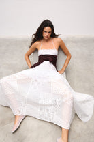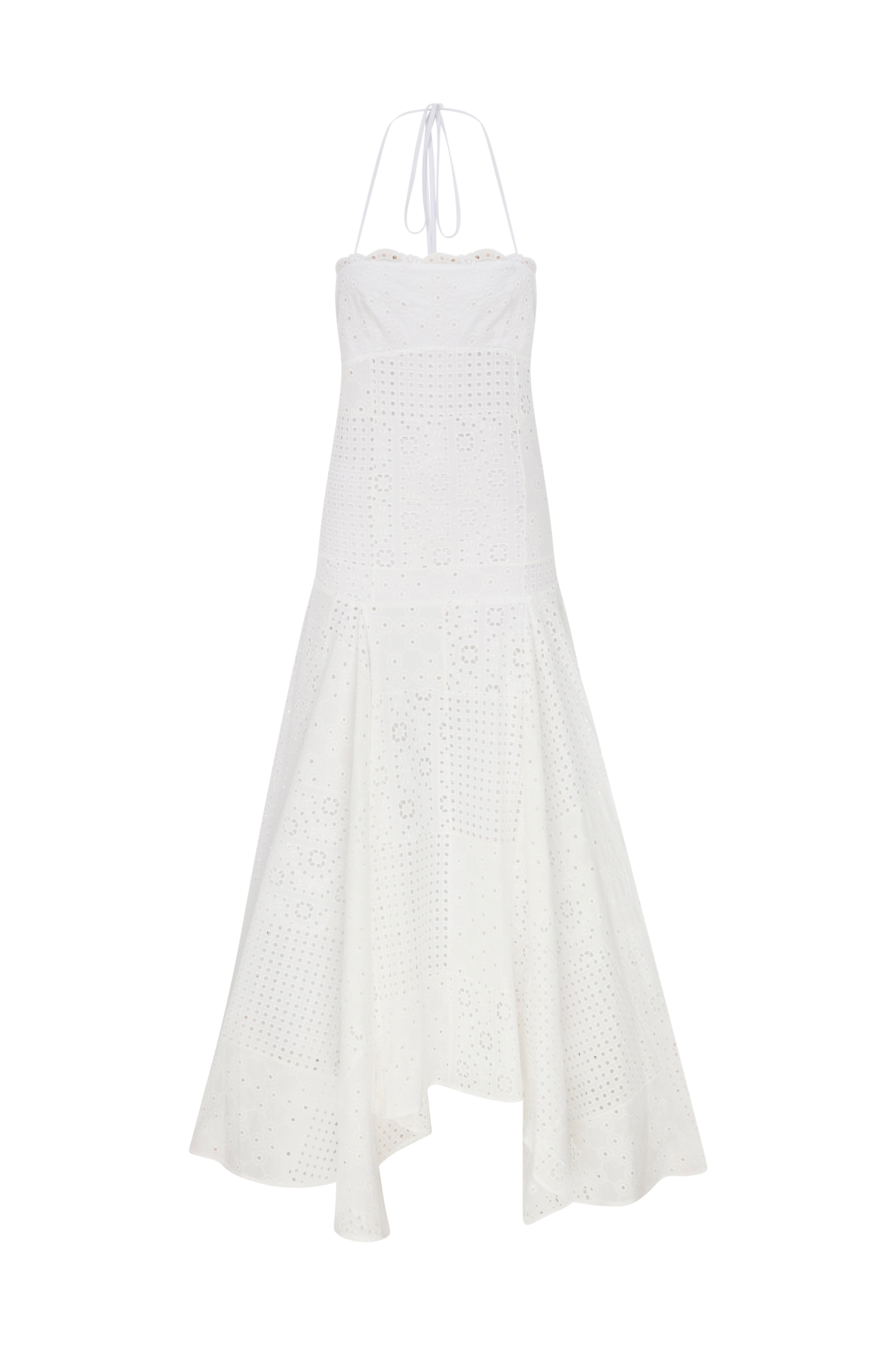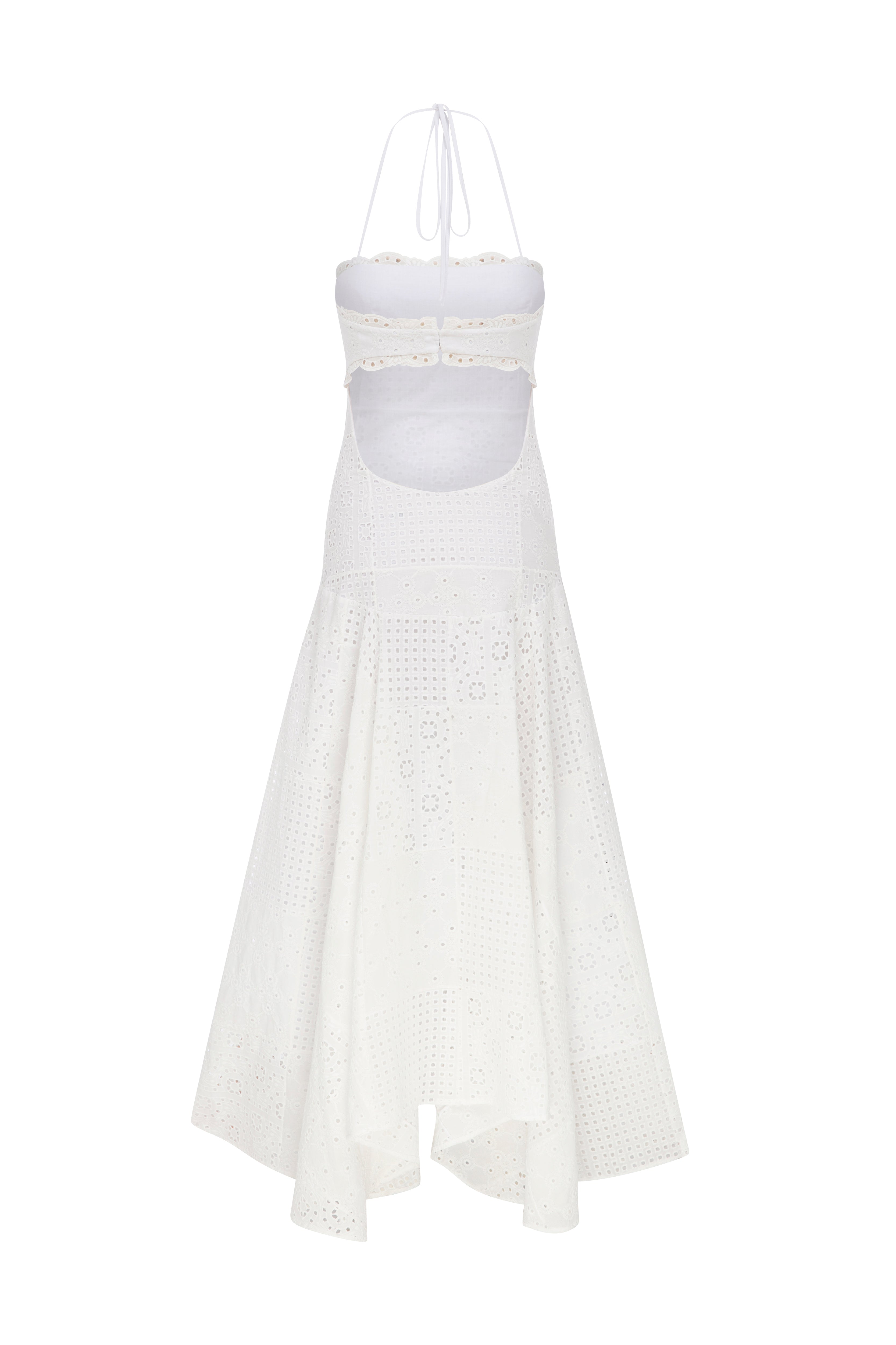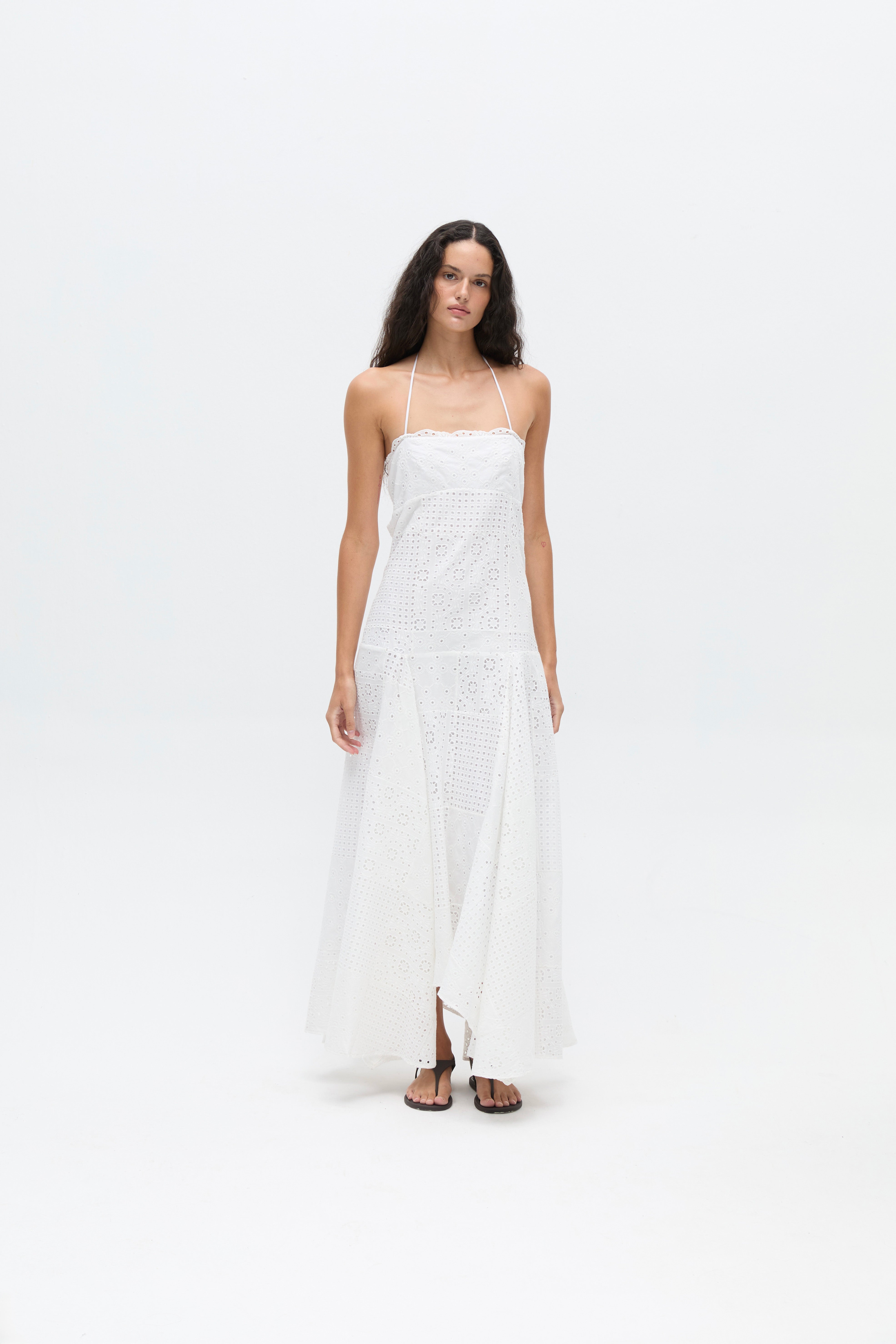 The Elise Maxi Dress is crafted from airy embroidered cotton anglaise, showcasing an open-back design that balances elegance with a light, effortless charm. The silhouette is fitted at the bust and flows into a flared skirt, creating fluid movement and a flattering full-length shape. Finished with a gracefully flared hem, it makes for a refined and versatile choice for any occasion.