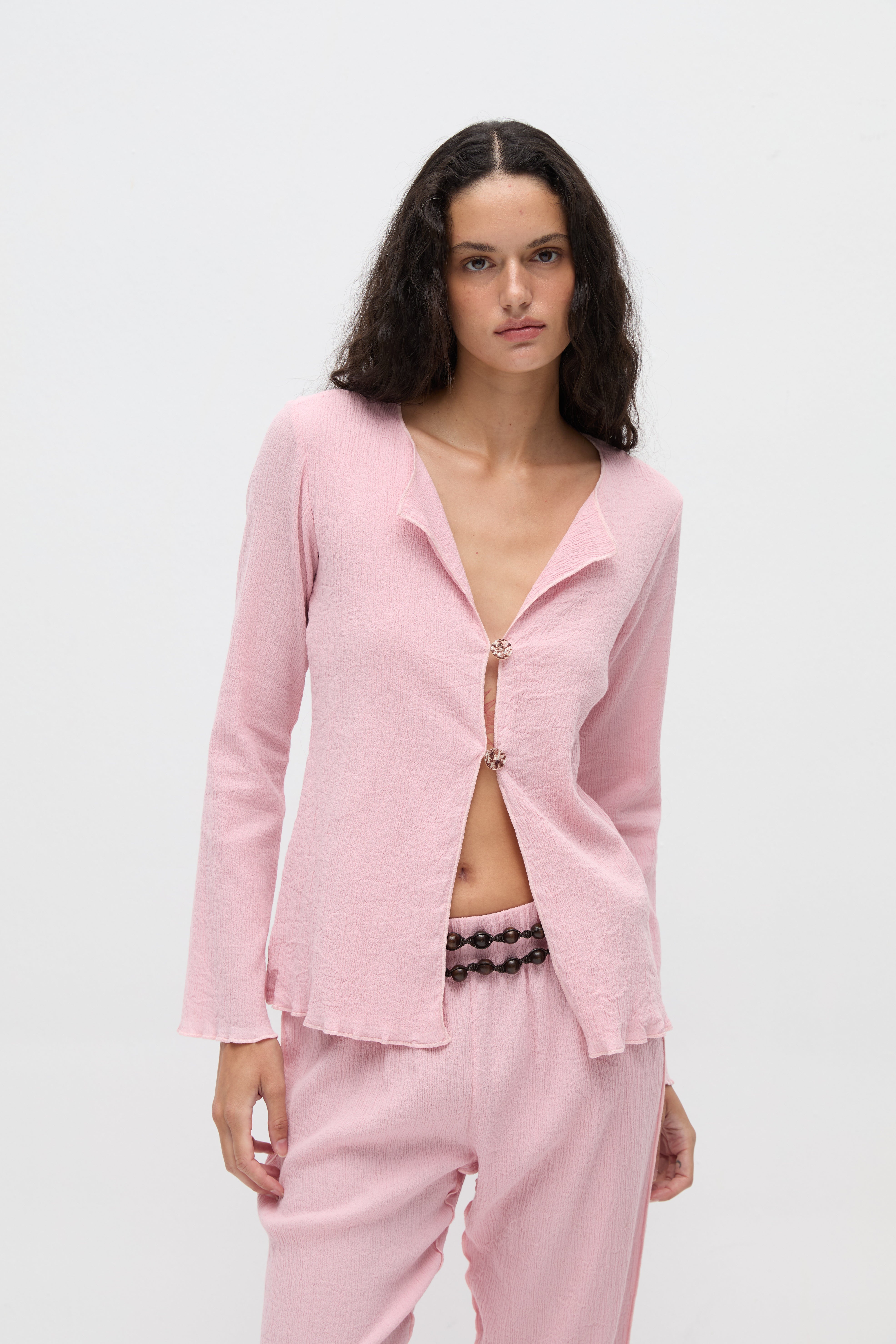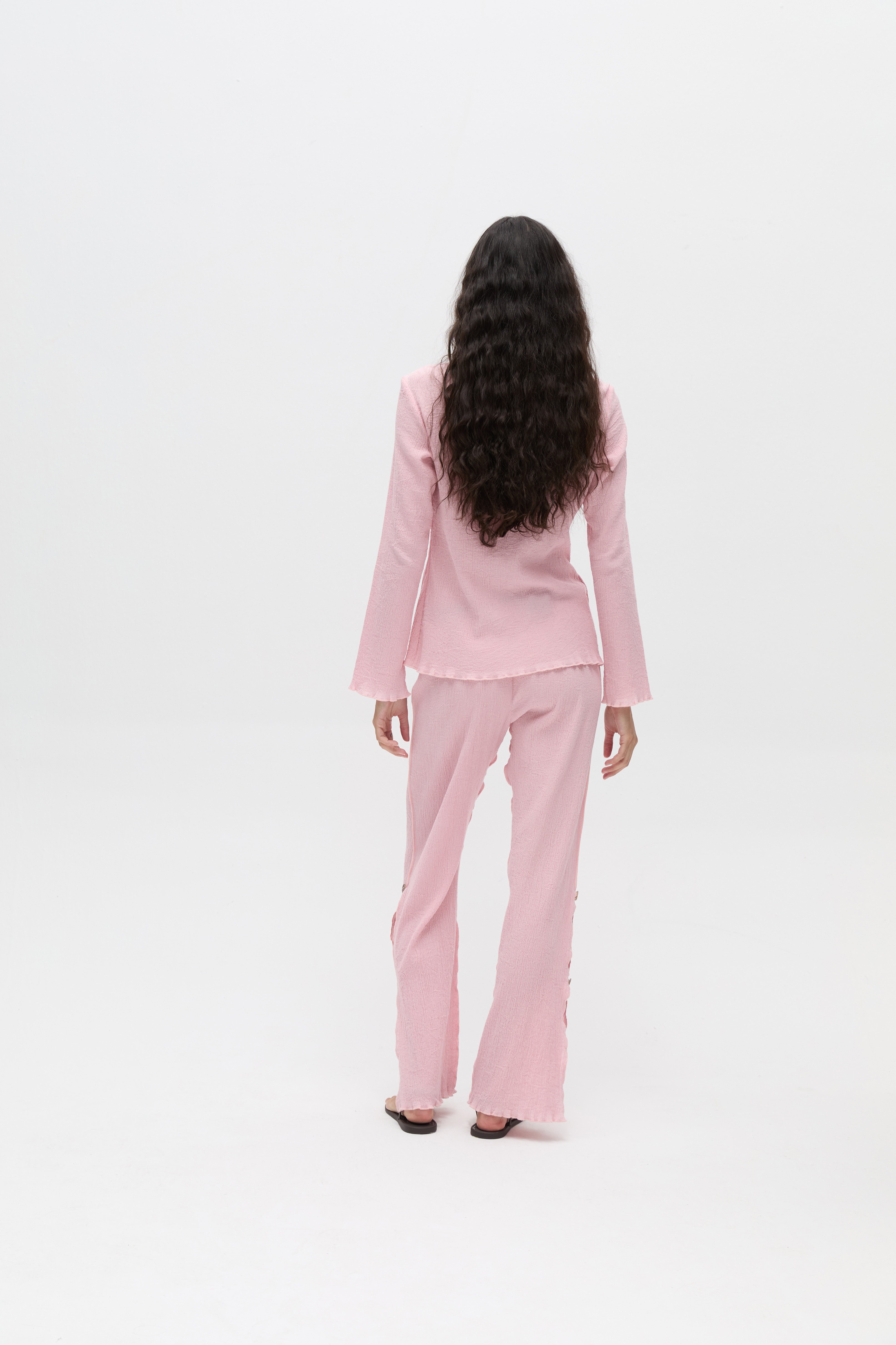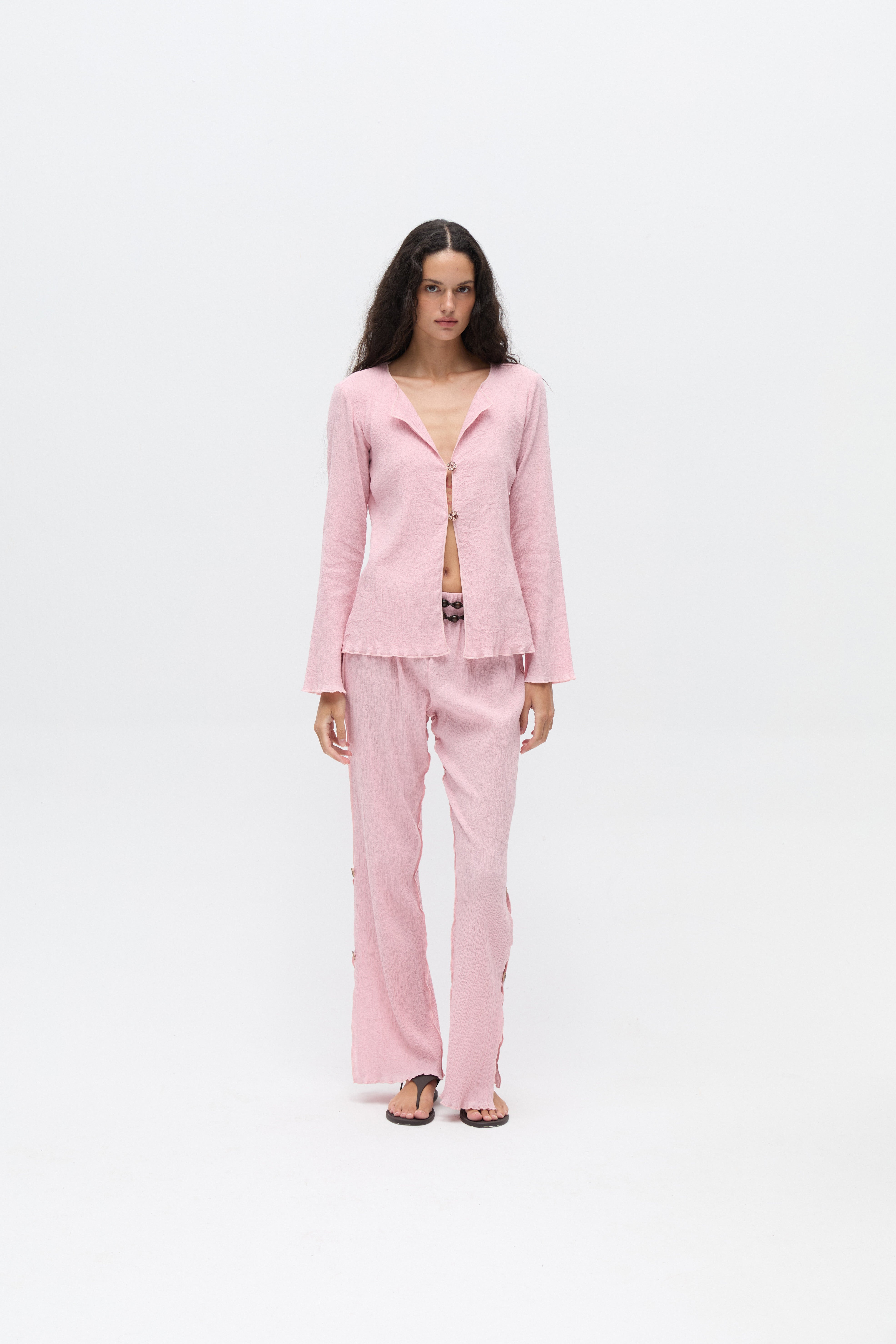 The Malaika Top is crafted from crinkle pink cotton and designed with a fitted silhouette, long sleeves, and a round neckline. Contrasting piping frames the edges, while oversized front button closures serve as both a functional detail and a striking focal point. The fabric’s natural texture lends subtle dimension, and its comfortable structure ensures a flattering, easy-to-wear fit.