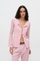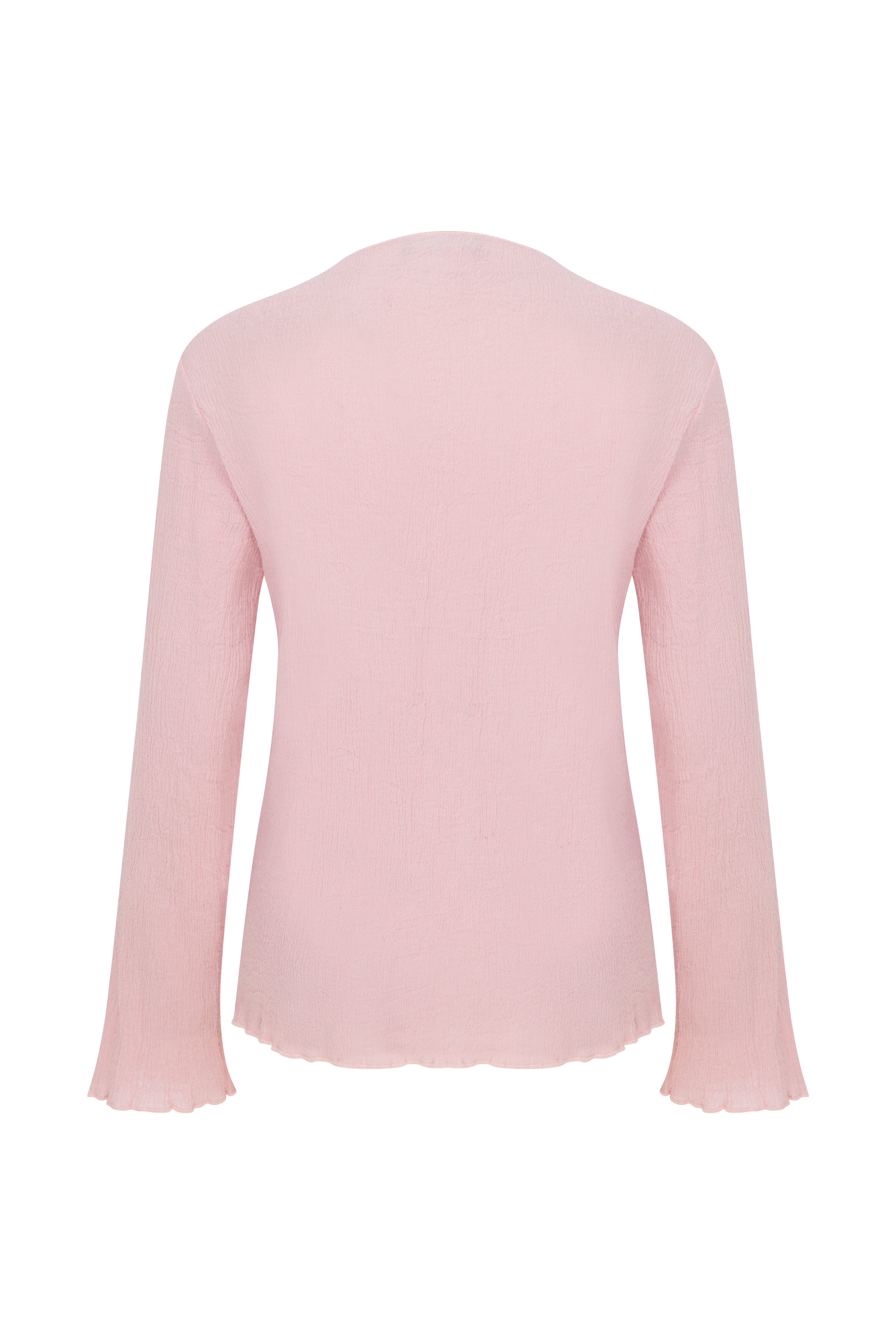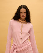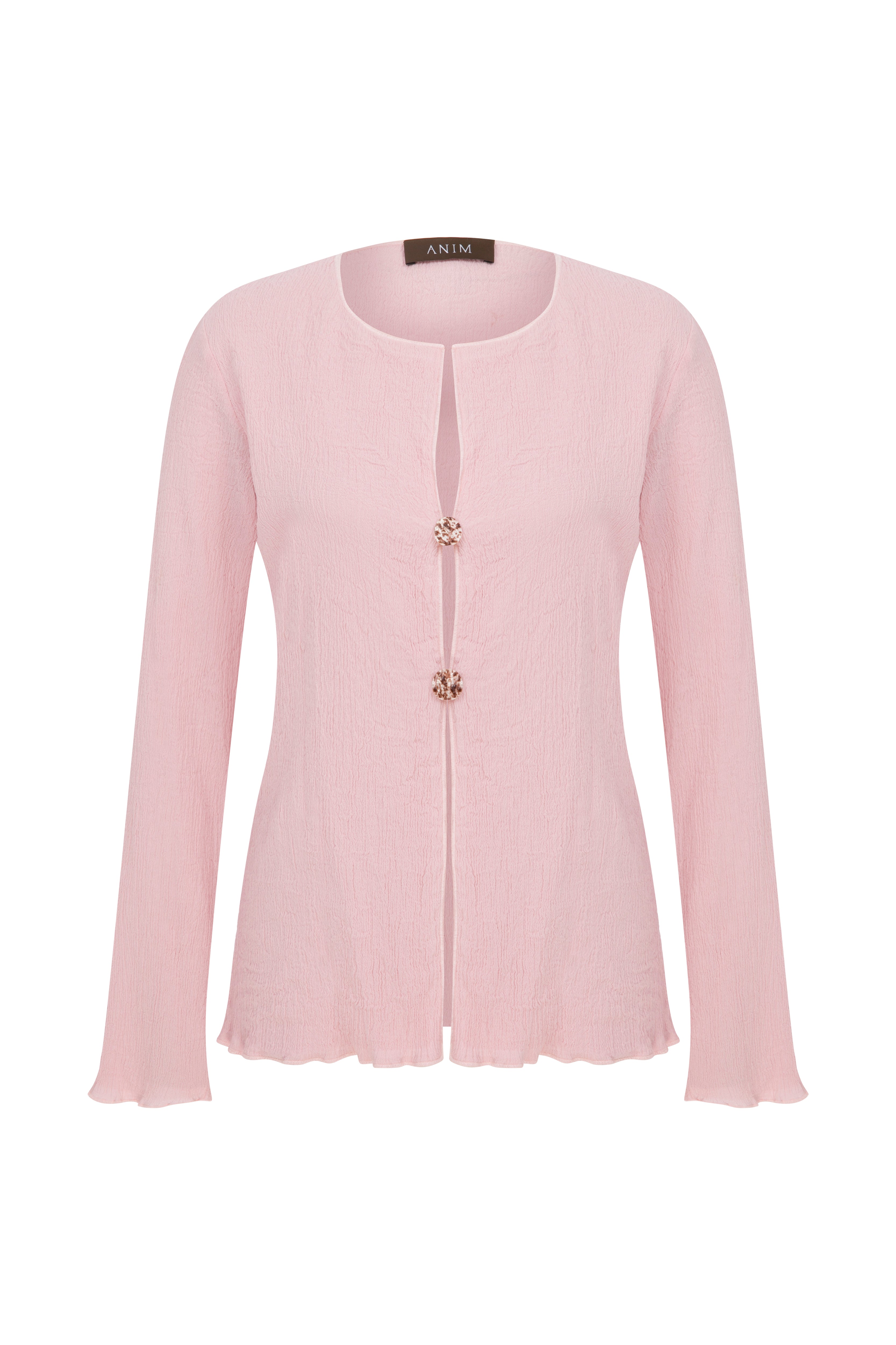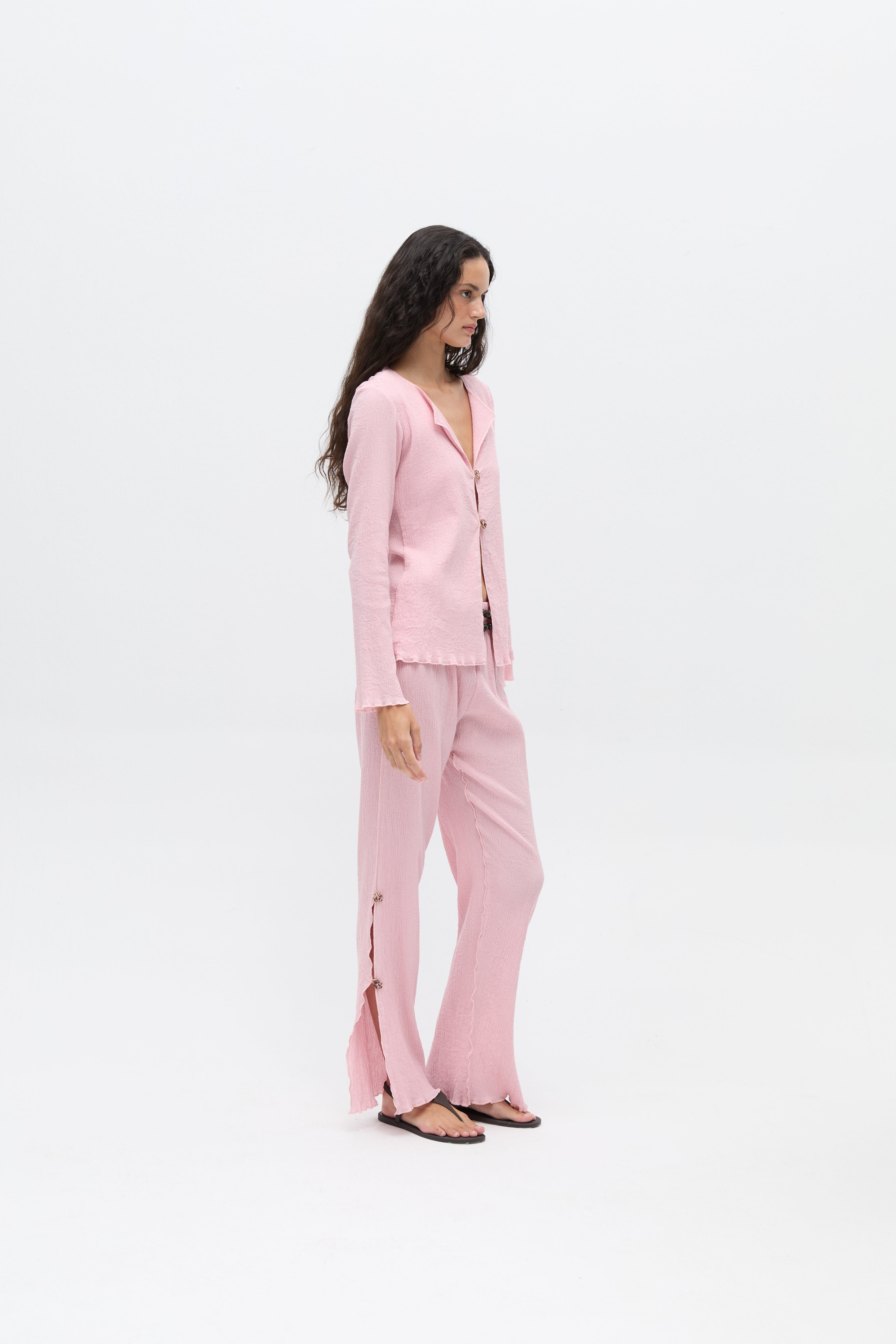 The Malaika Top is crafted from crinkle pink cotton and designed with a fitted silhouette, long sleeves, and a round neckline. Contrasting piping frames the edges, while oversized front button closures serve as both a functional detail and a striking focal point. The fabric’s natural texture lends subtle dimension, and its comfortable structure ensures a flattering, easy-to-wear fit.