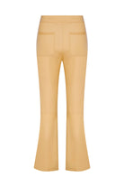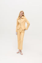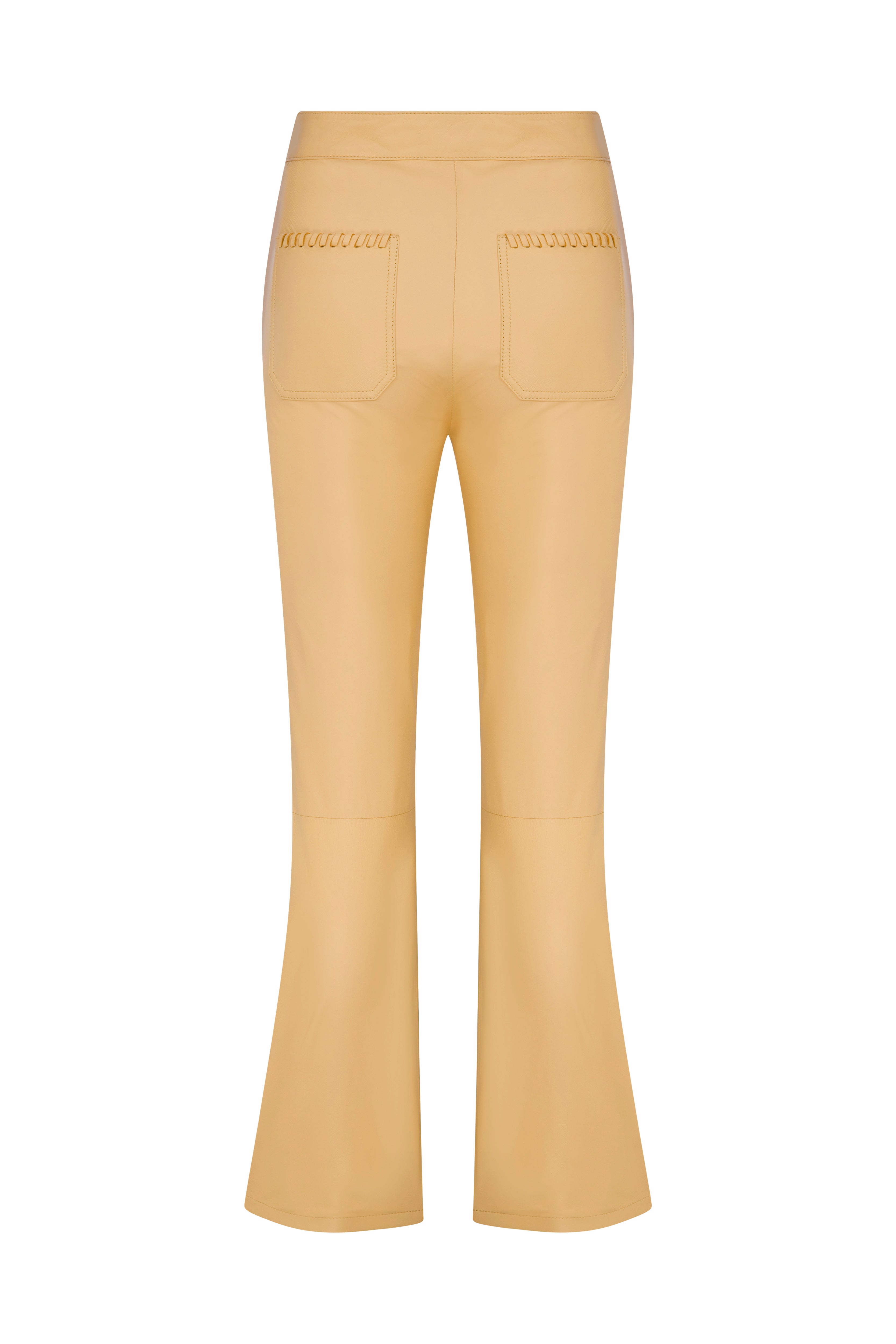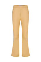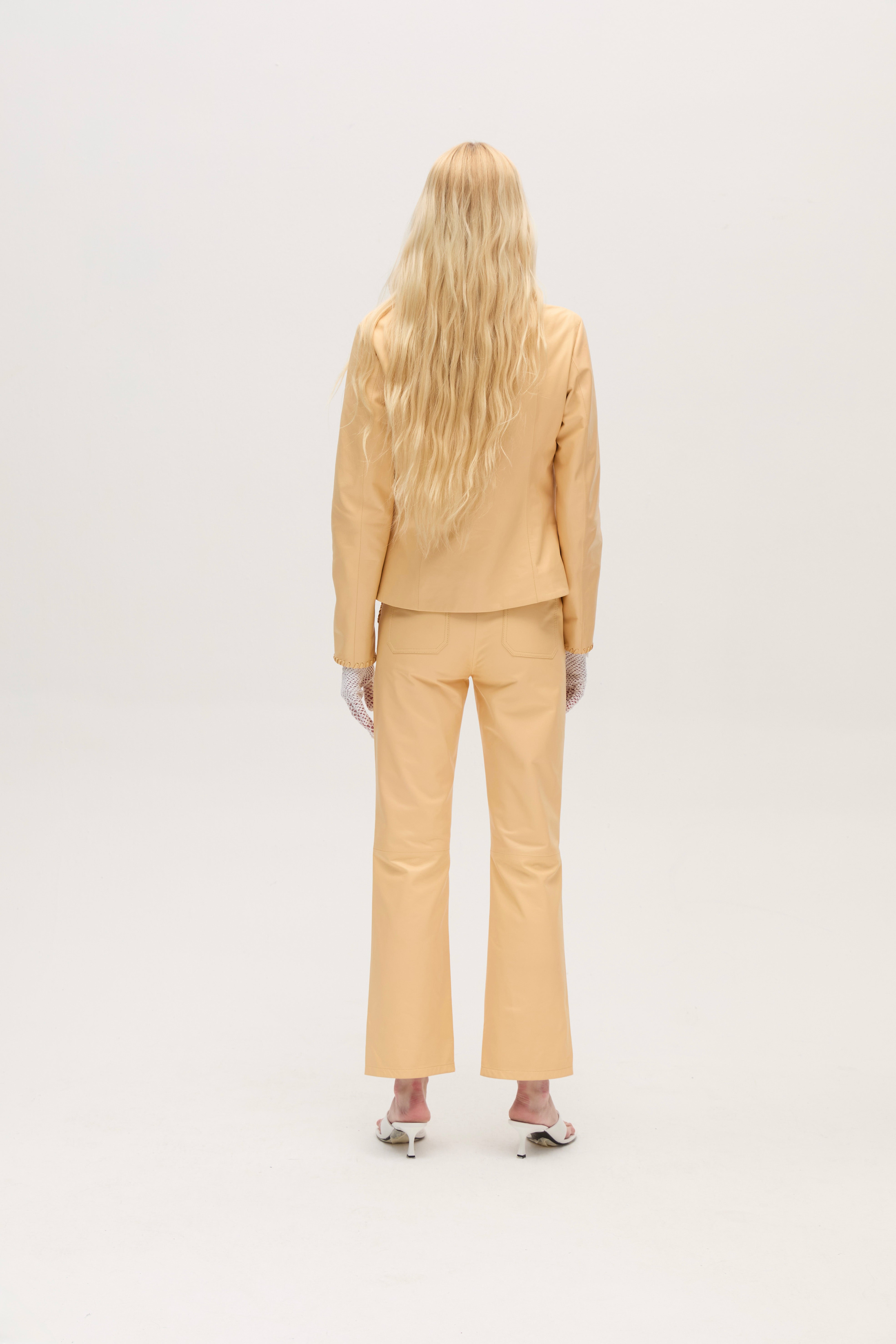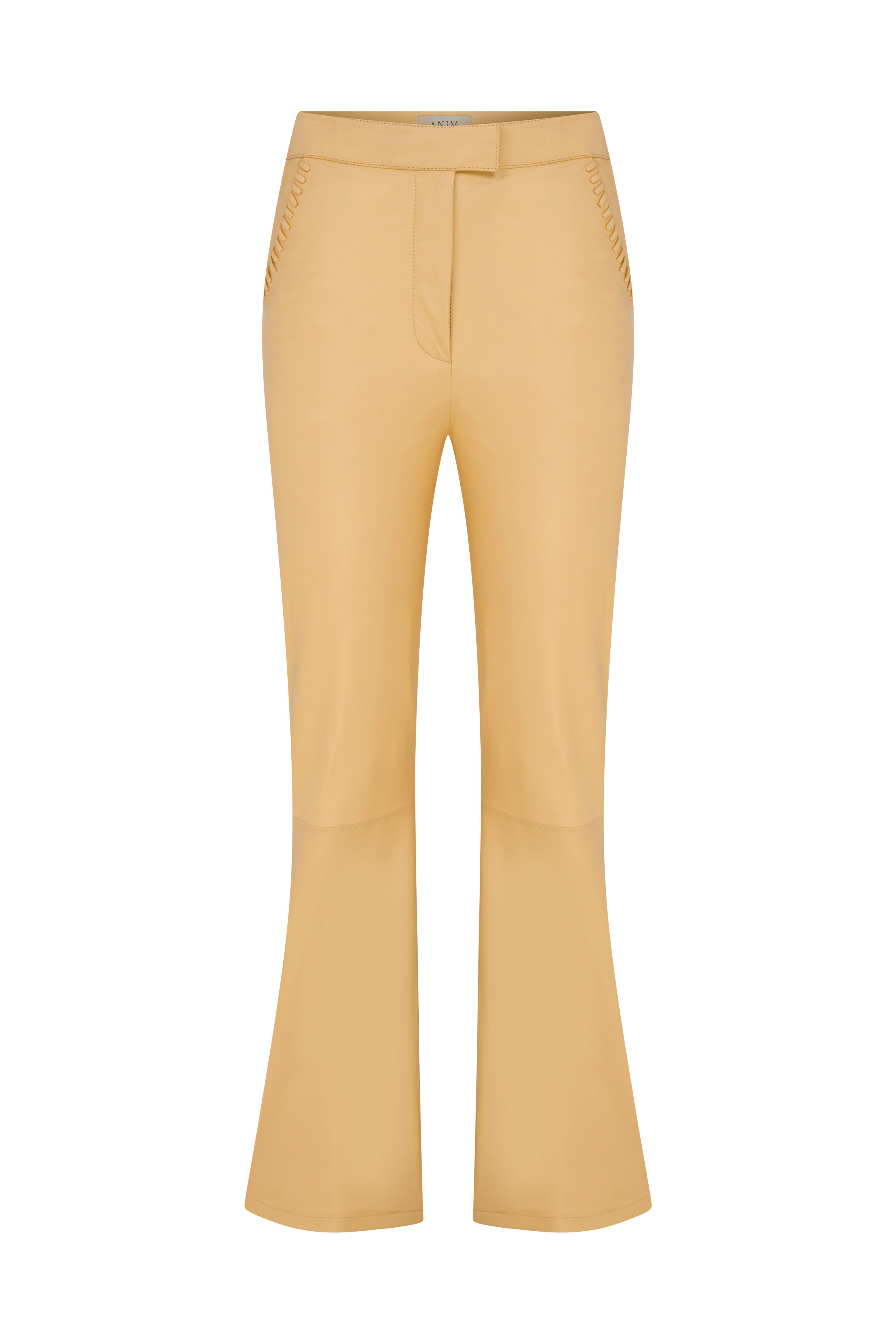 The Nina Pants are crafted from yellow-toned lambskin leather and designed with a sleek straight-leg cut that elongates the silhouette. The mid-rise waist offers a balanced look, while the smooth surface and soft texture provide a modern feel and comfortable movement. With their bold color, these pants make a strong statement and pair effortlessly with both minimal tops and more daring combinations for a confident, contemporary style.