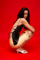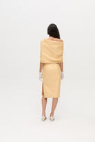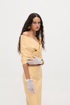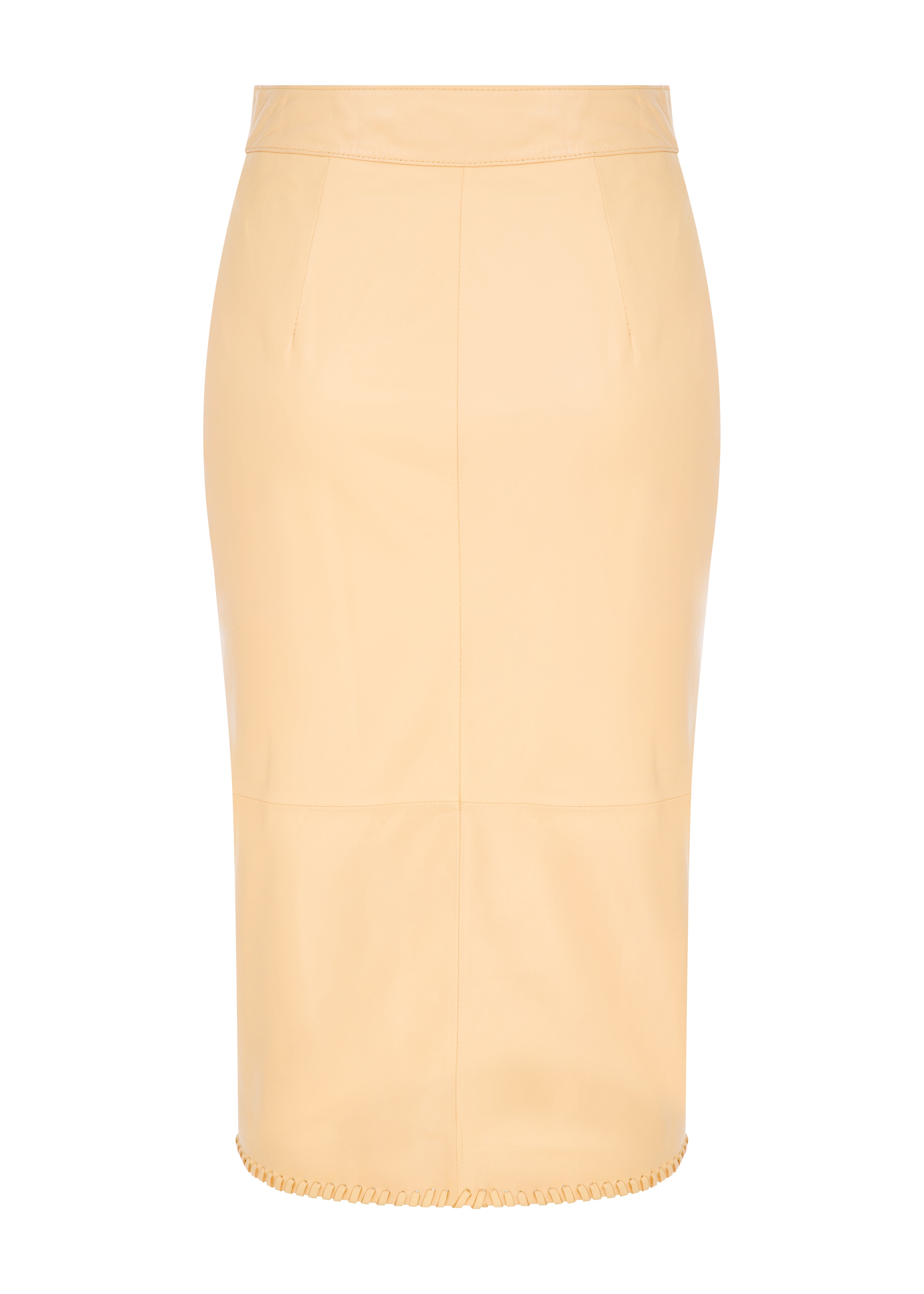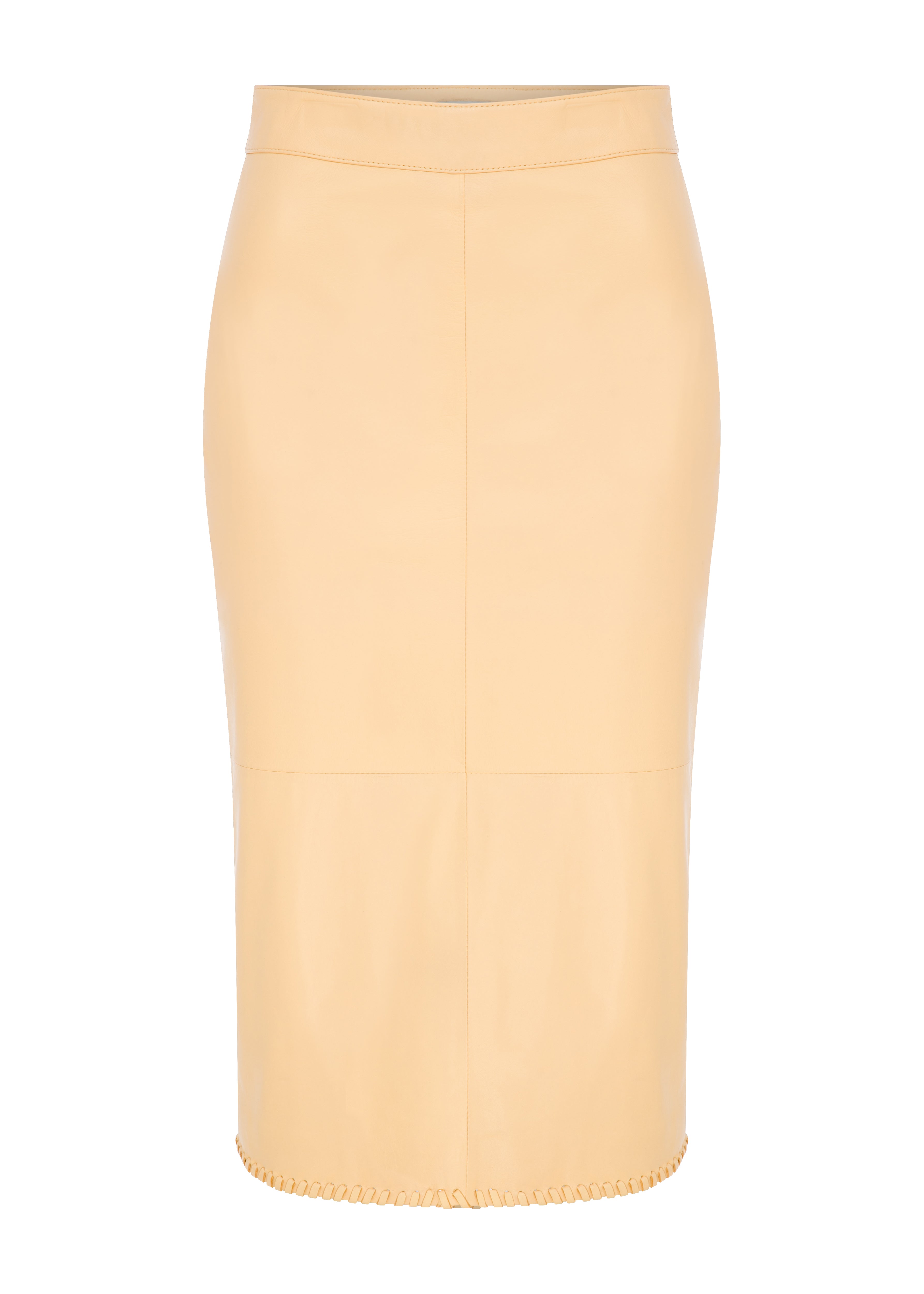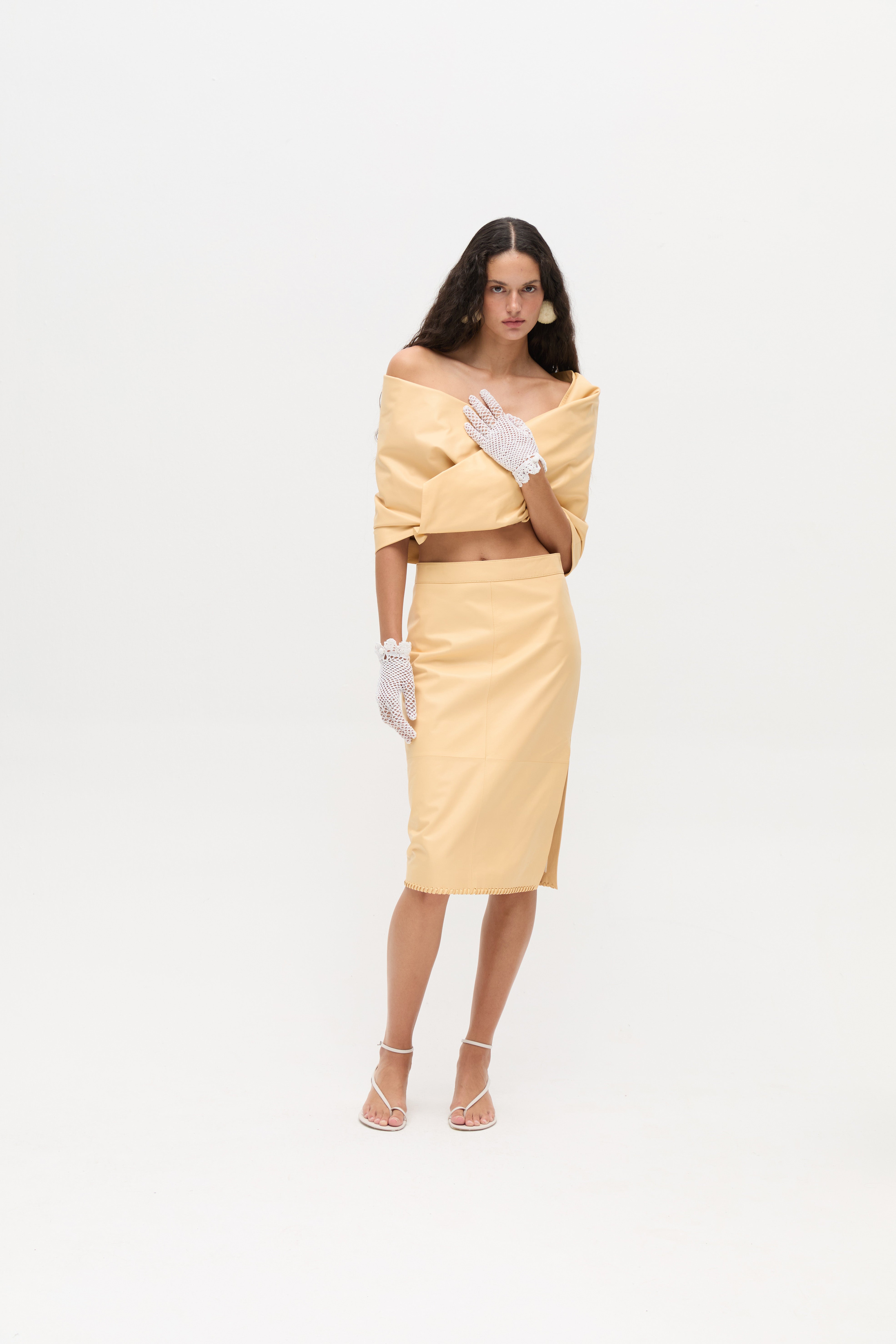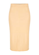 The Nina Skirt is crafted from lambskin leather in a soft yellow tone. Its clean, streamlined cut creates a modern silhouette, while the side slit adds ease of movement and a balanced look. The smooth surface and supple texture allow the skirt to mold comfortably to the body. Striking yet versatile, it transitions effortlessly from daytime wear to more elevated evening looks.