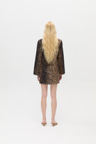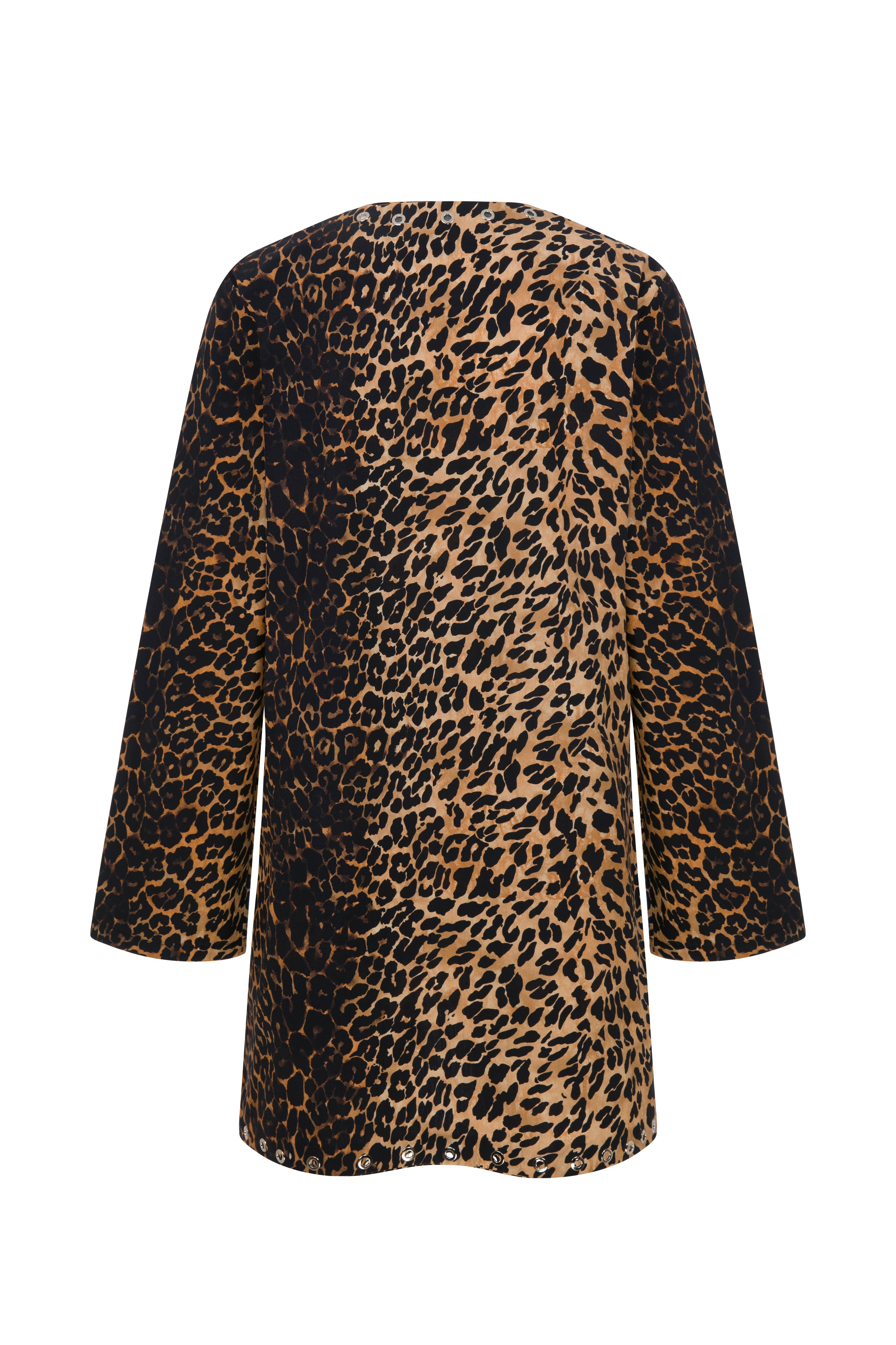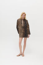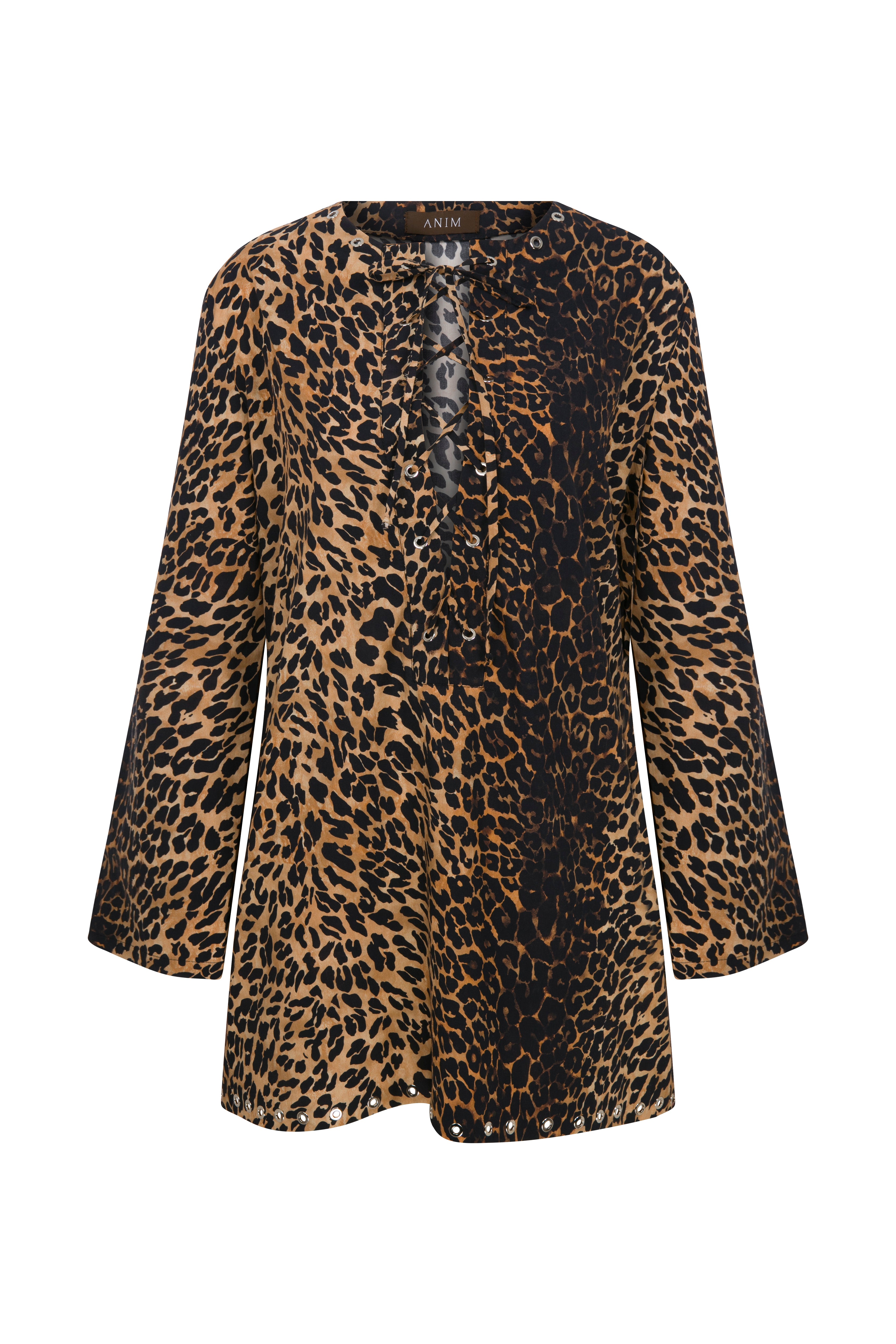 The Nyra Dress is a relaxed mini design crafted from leopard-printed cotton fabric. The tie details at the neckline add a subtle, elegant touch to the piece. With its long sleeves and fluid shape, it offers a comfortable fit; the bold print and simple silhouette combine to create a strong yet balanced look.