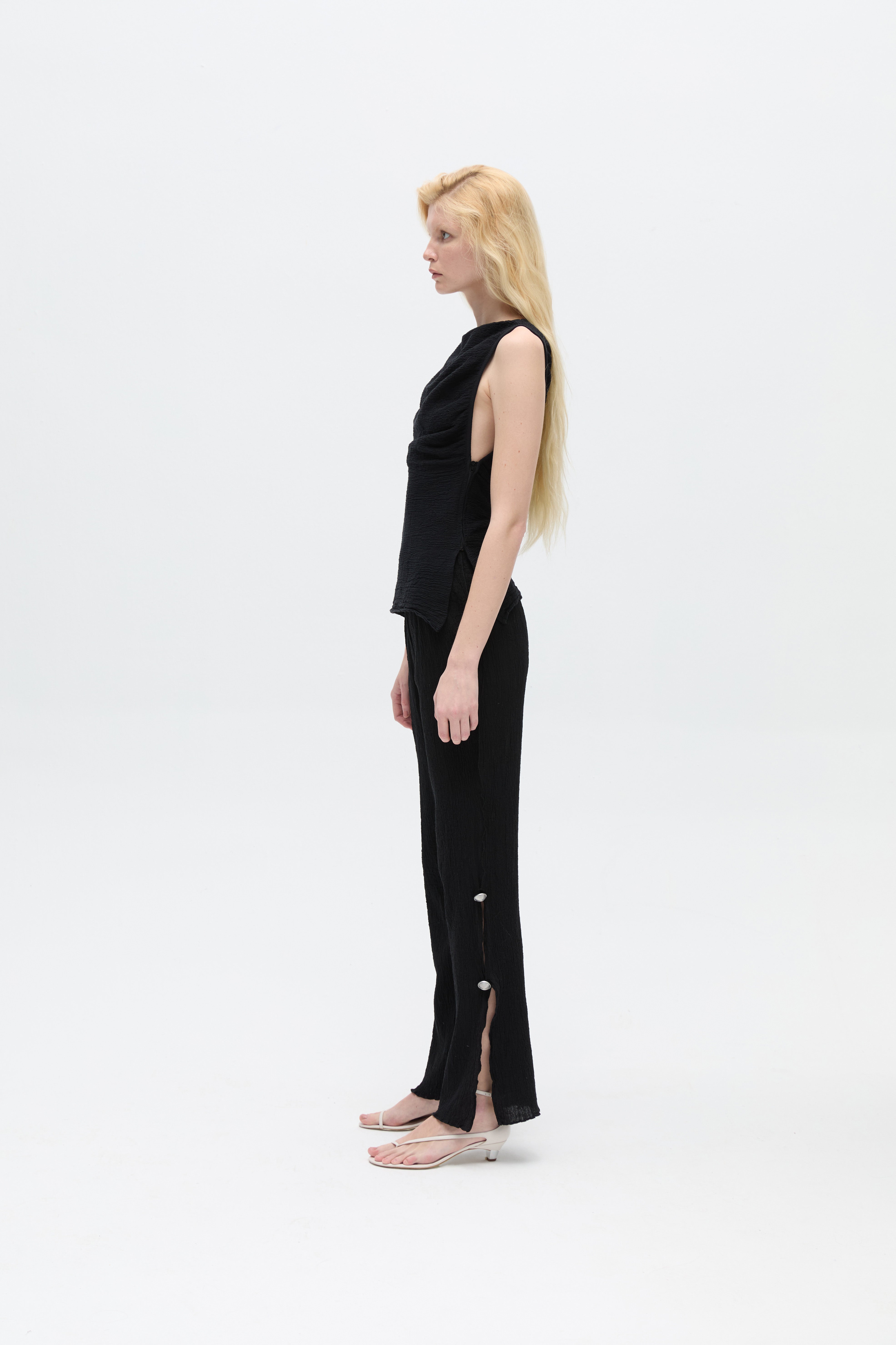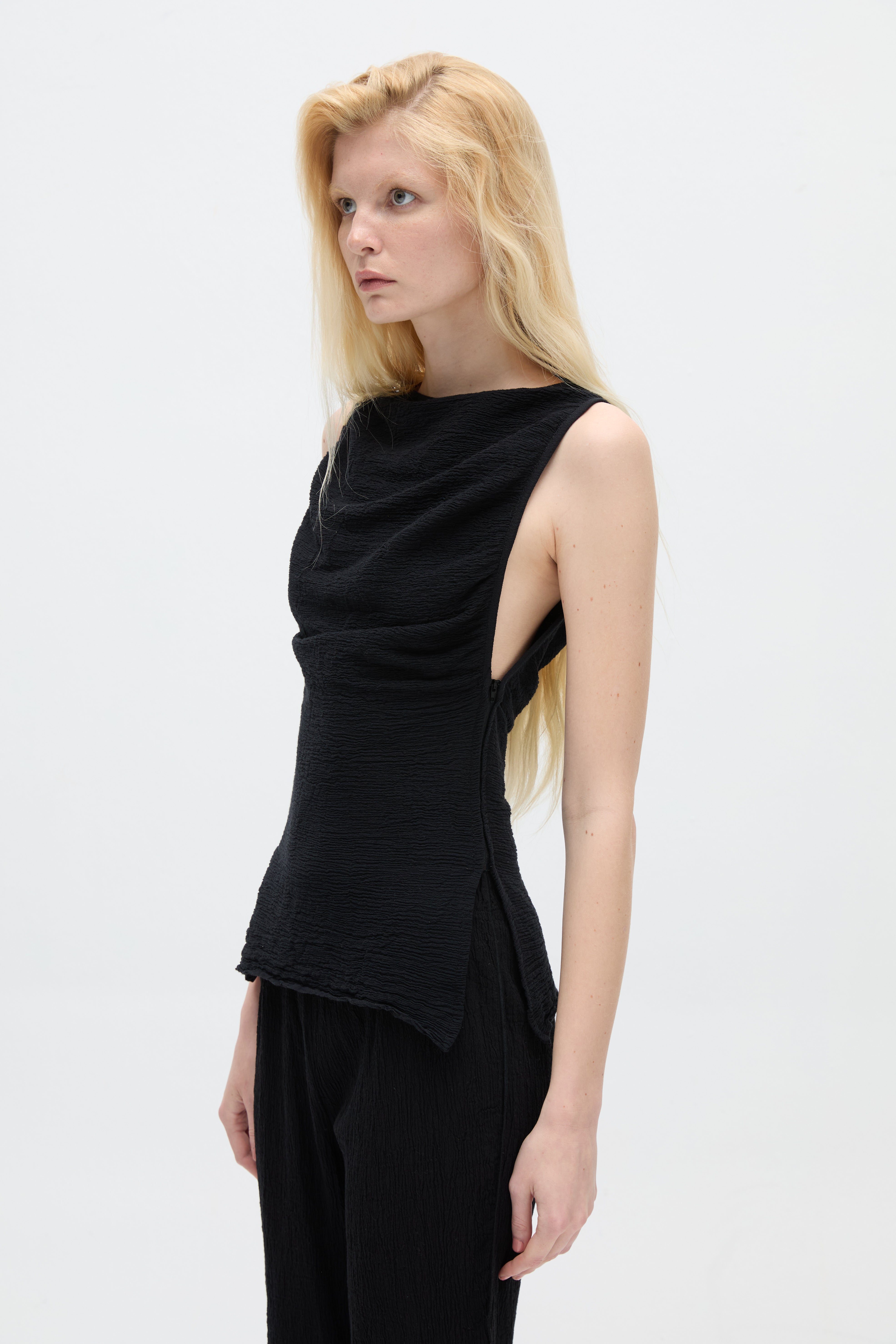 The Sienna Top is a sleeveless design crafted from crinkled cotton fabric. Its softly draped neckline adds a sense of movement to the piece. With its light structure and clean form, it offers a simple yet refined look and can be easily paired with different pieces.