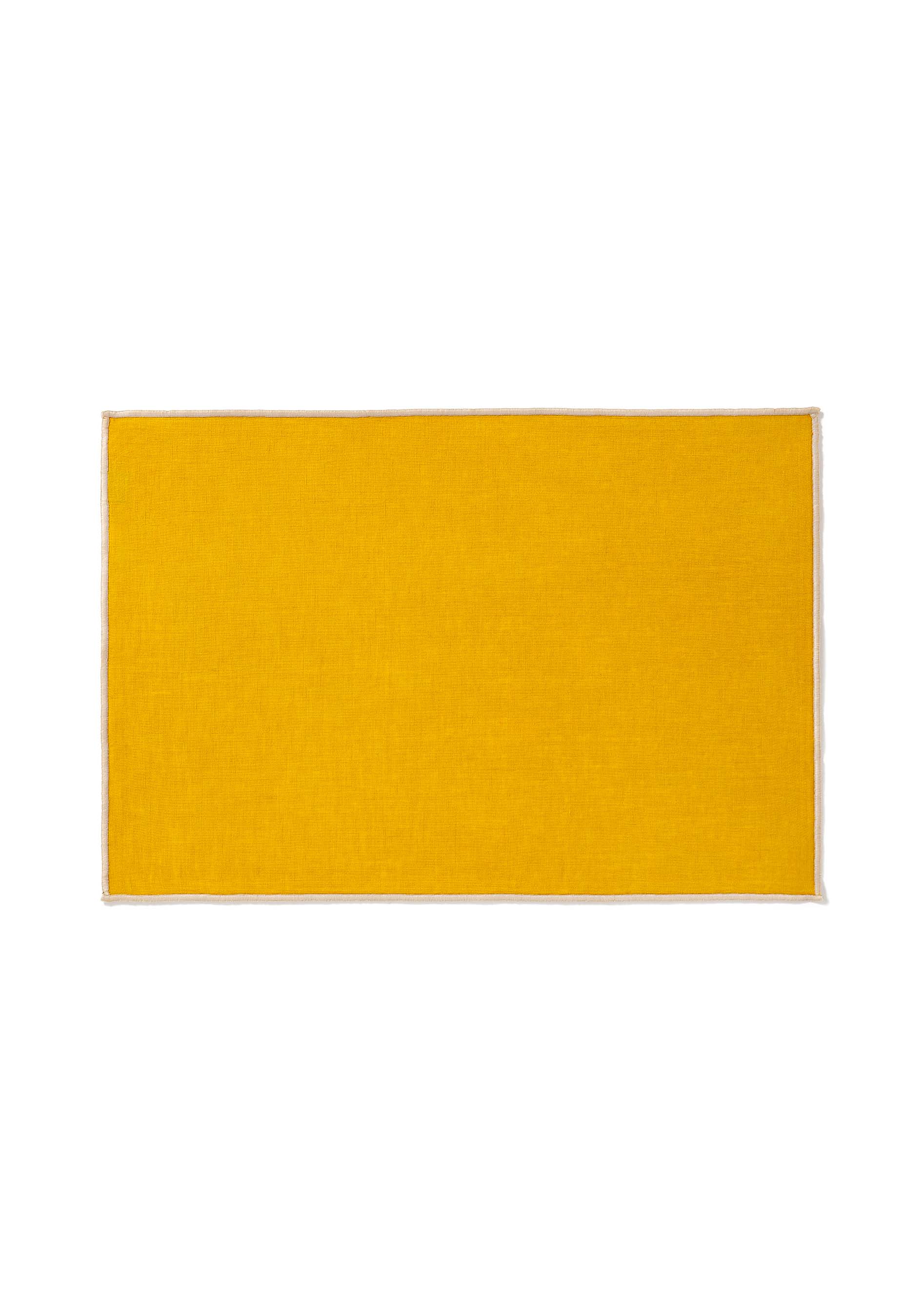 Margot Placemat features yellow linen with subtle beige piping, offering a clean, sun-washed look for both casual and special occasions. Sold as one.