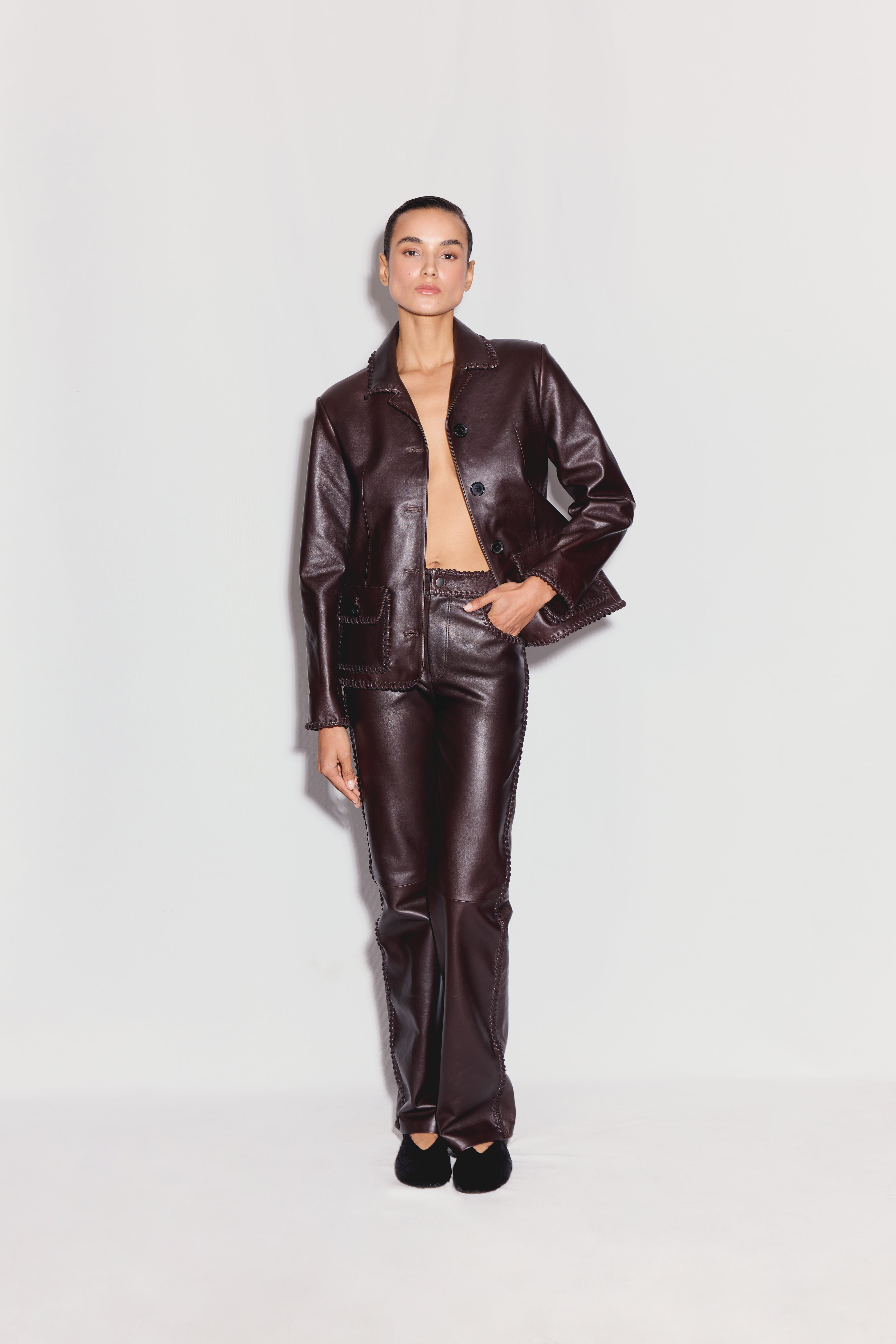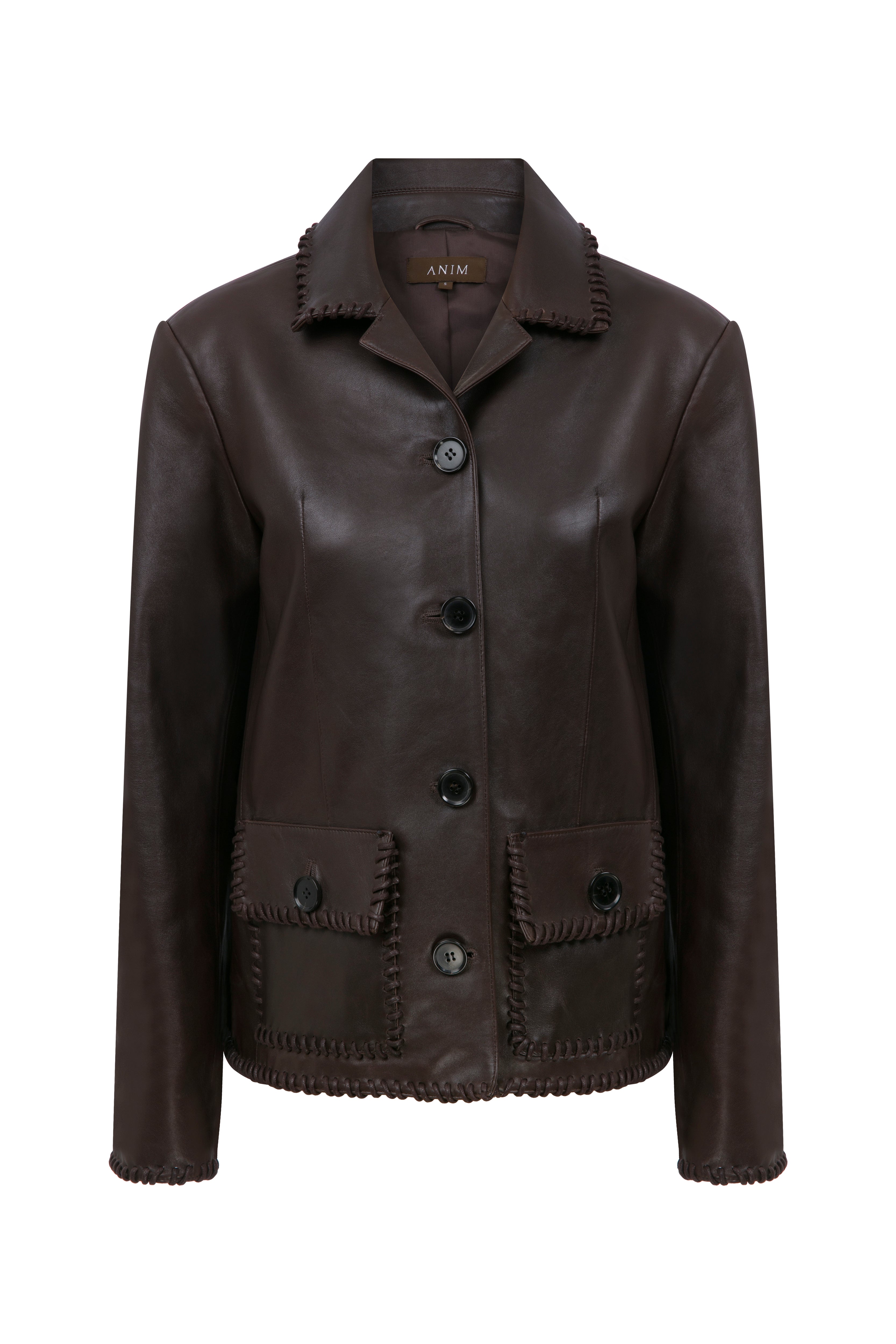The Devon Jacket is a collared leather jacket in rich dark brown, crafted from supple lambskin. It features a tailored silhouette with subtle structure through the shoulders and a relaxed drape over the body. The hemstitched edges add artisanal detail, making it a versatile layer for both refined and casual styling.