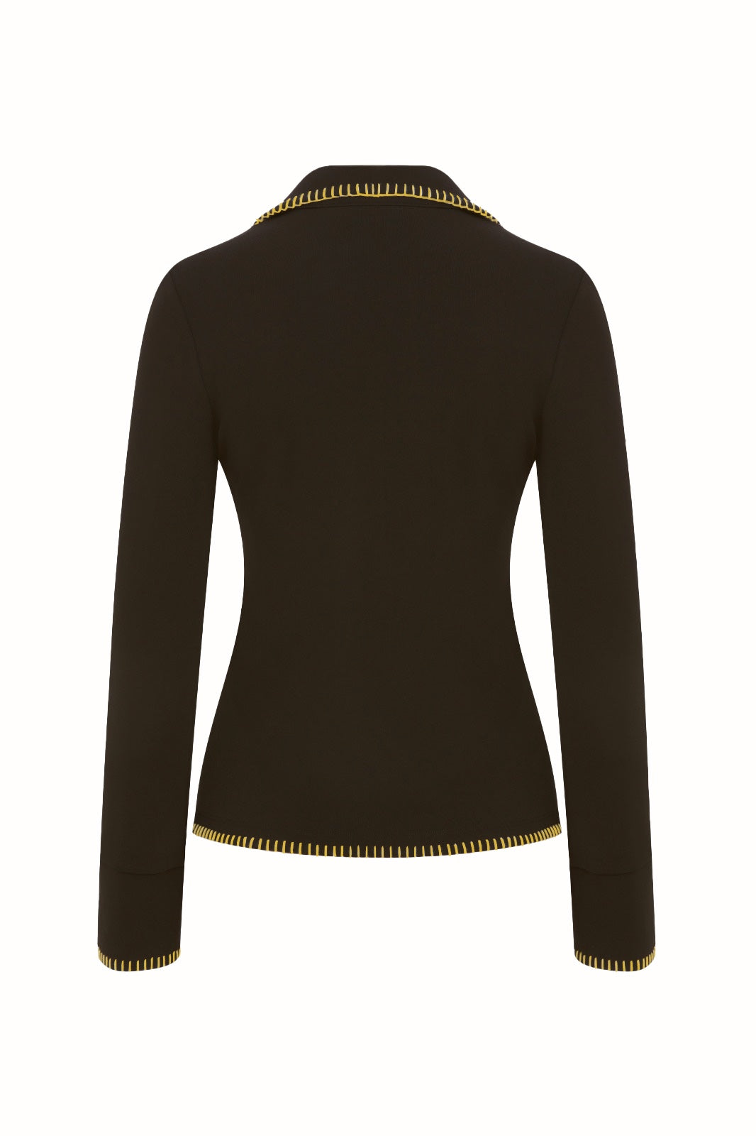 The Koza Brown Top is a long sleeve top in a deep brown shade, crafted from a soft yet structured polyester-elastane blend. Highlighted by hemstitched details along the collar, cuffs, and hemline, it blends understated elegance with everyday wearability. Its slim, body-skimming fit provides a polished silhouette without compromising comfort.