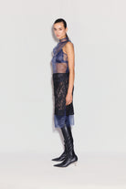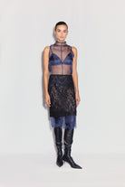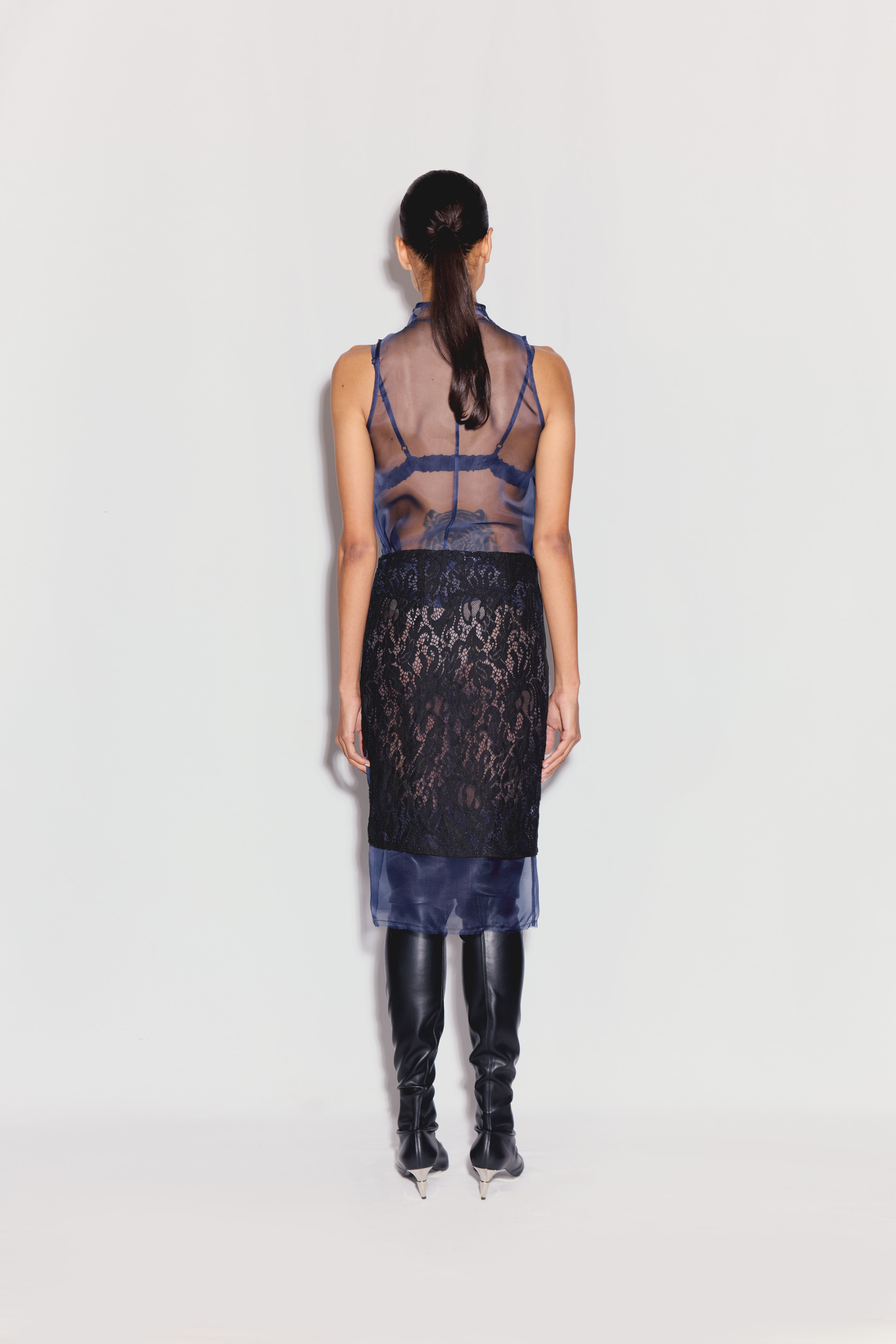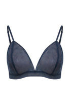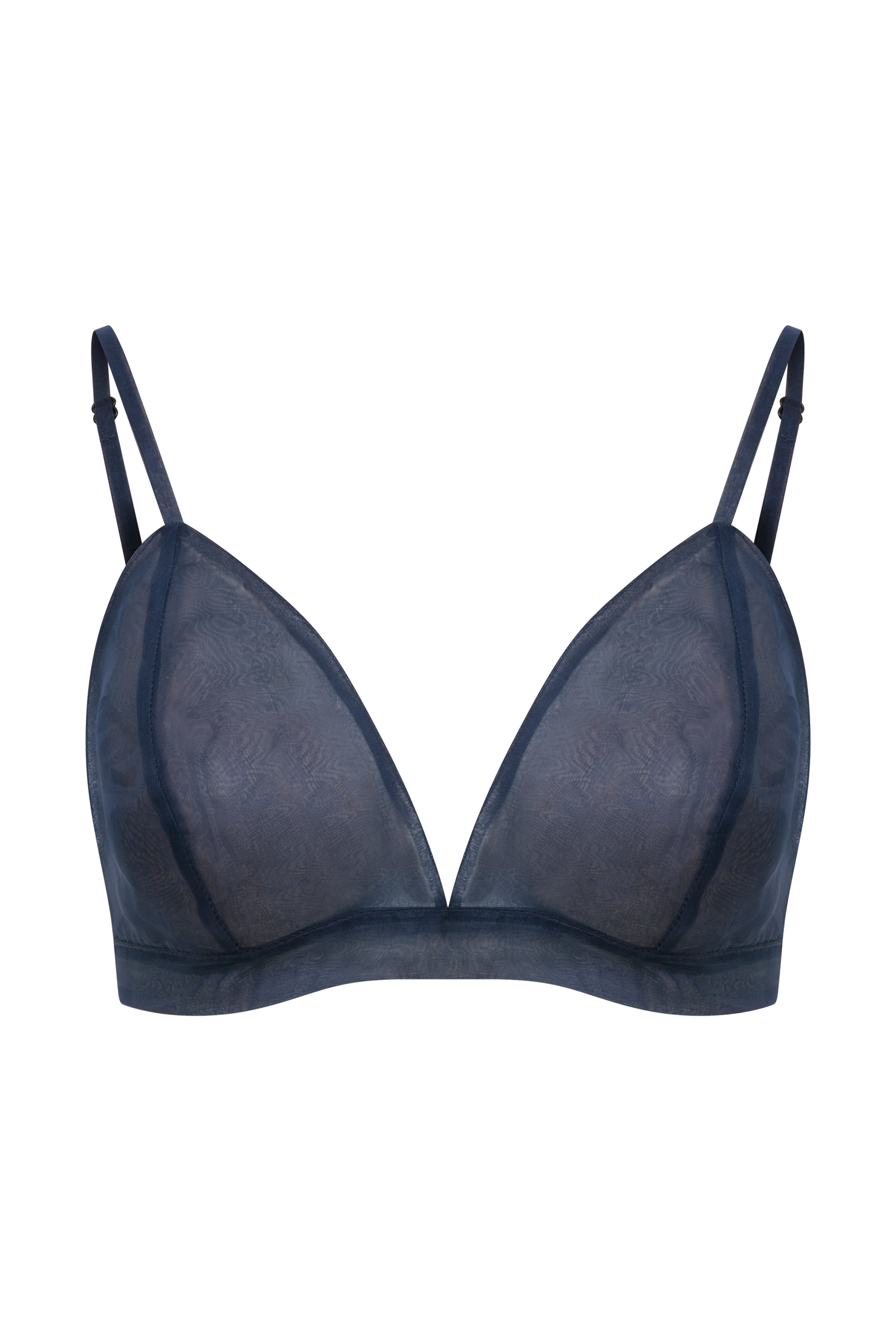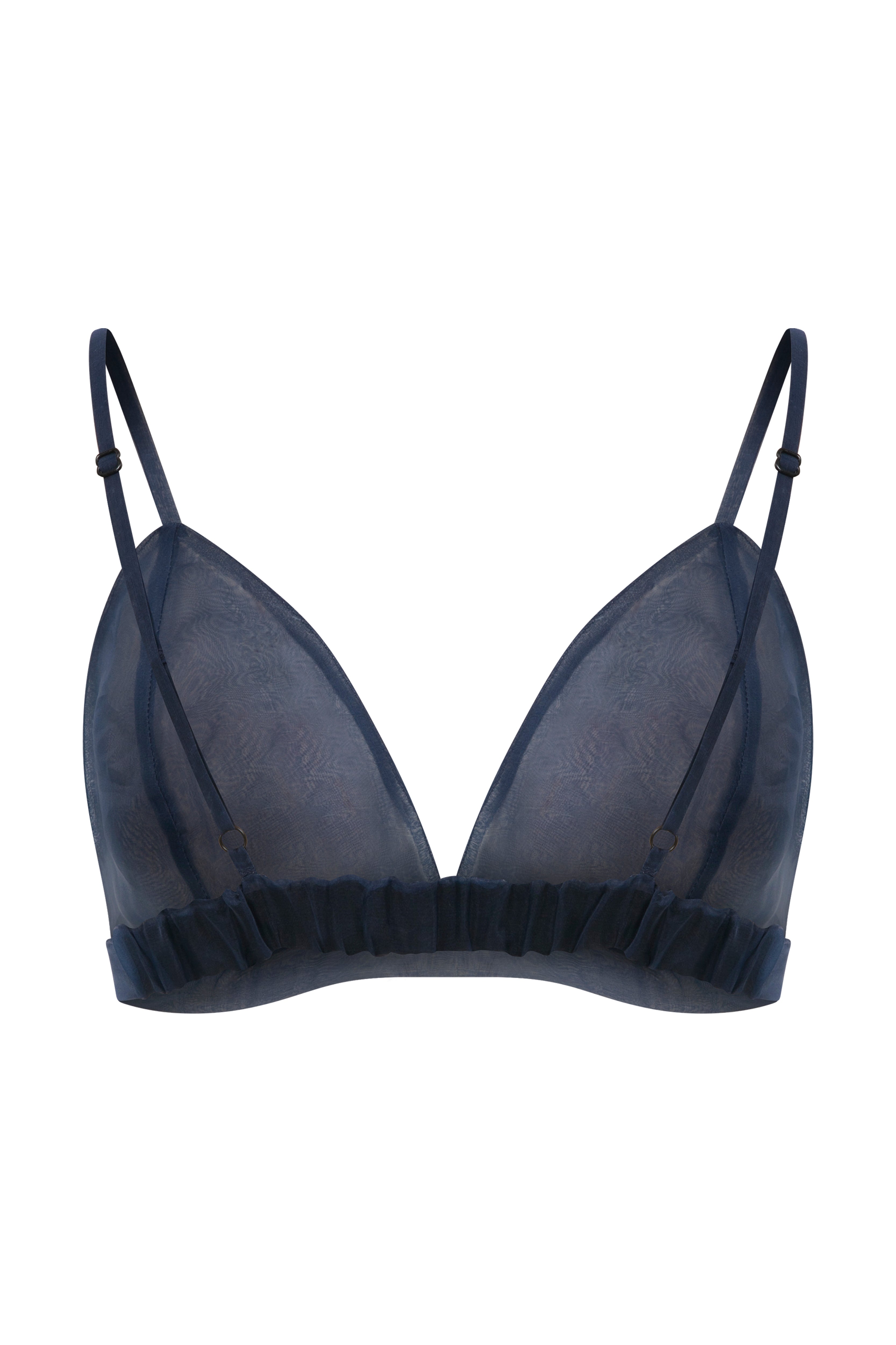 The Martin Bra is a navy triangle bra crafted from delicate organza with a subtle sheen. Designed for a lightweight and barely-there feel, it features adjustable straps and soft cups that provide gentle support. Perfect for pairing with sheer tops.