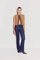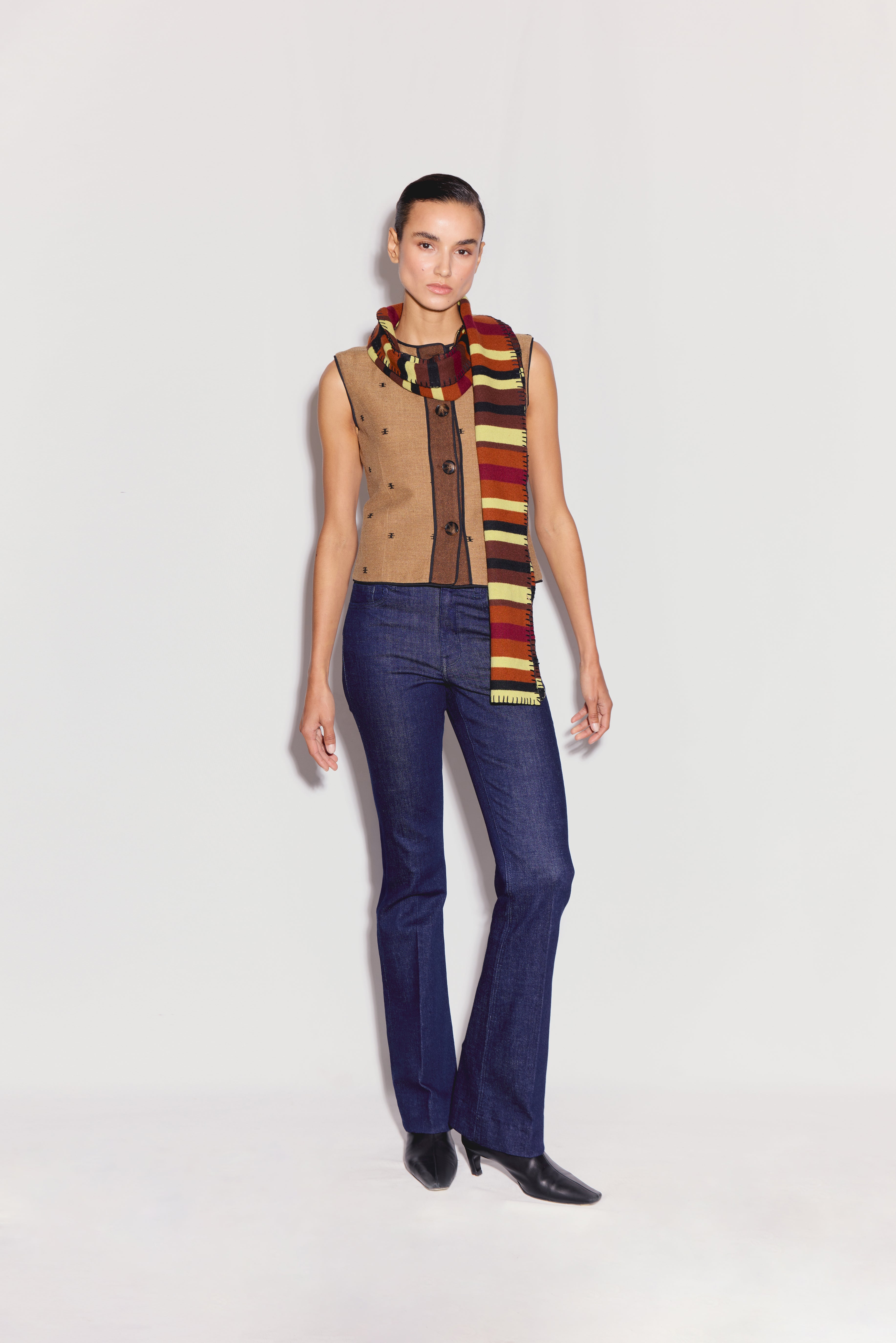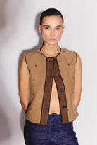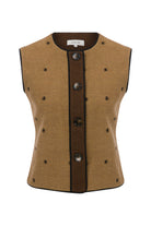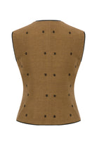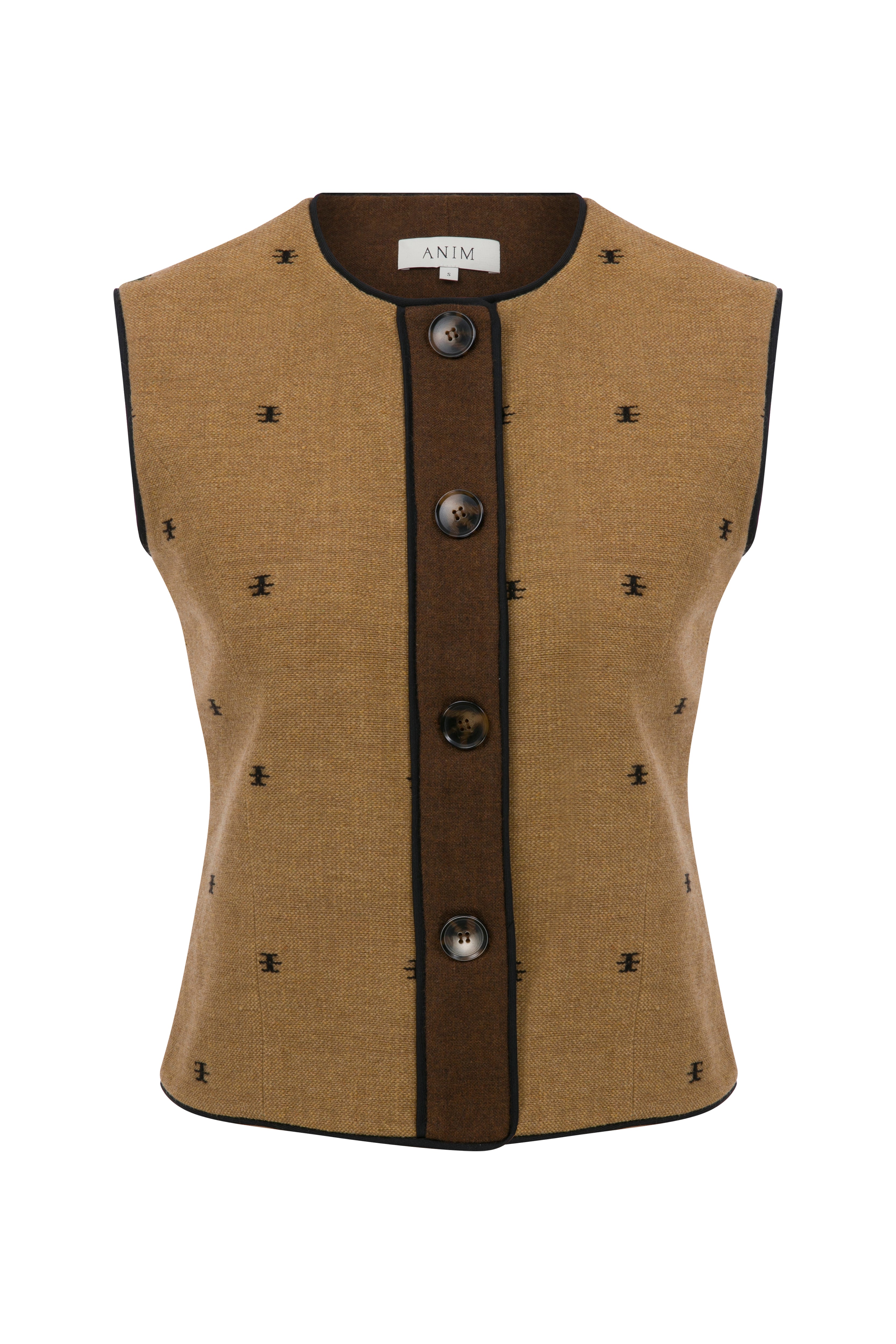 The Mera Vest is a beige and brown ehram fabric vest decorated with fine embroidery and accented with a contrasting button placket. Cut for a fitted shape, it defines the waist while allowing for comfortable layering over shirts or dresses. Its refined, artisanal look makes it a standout piece for both casual and more polished outfits.