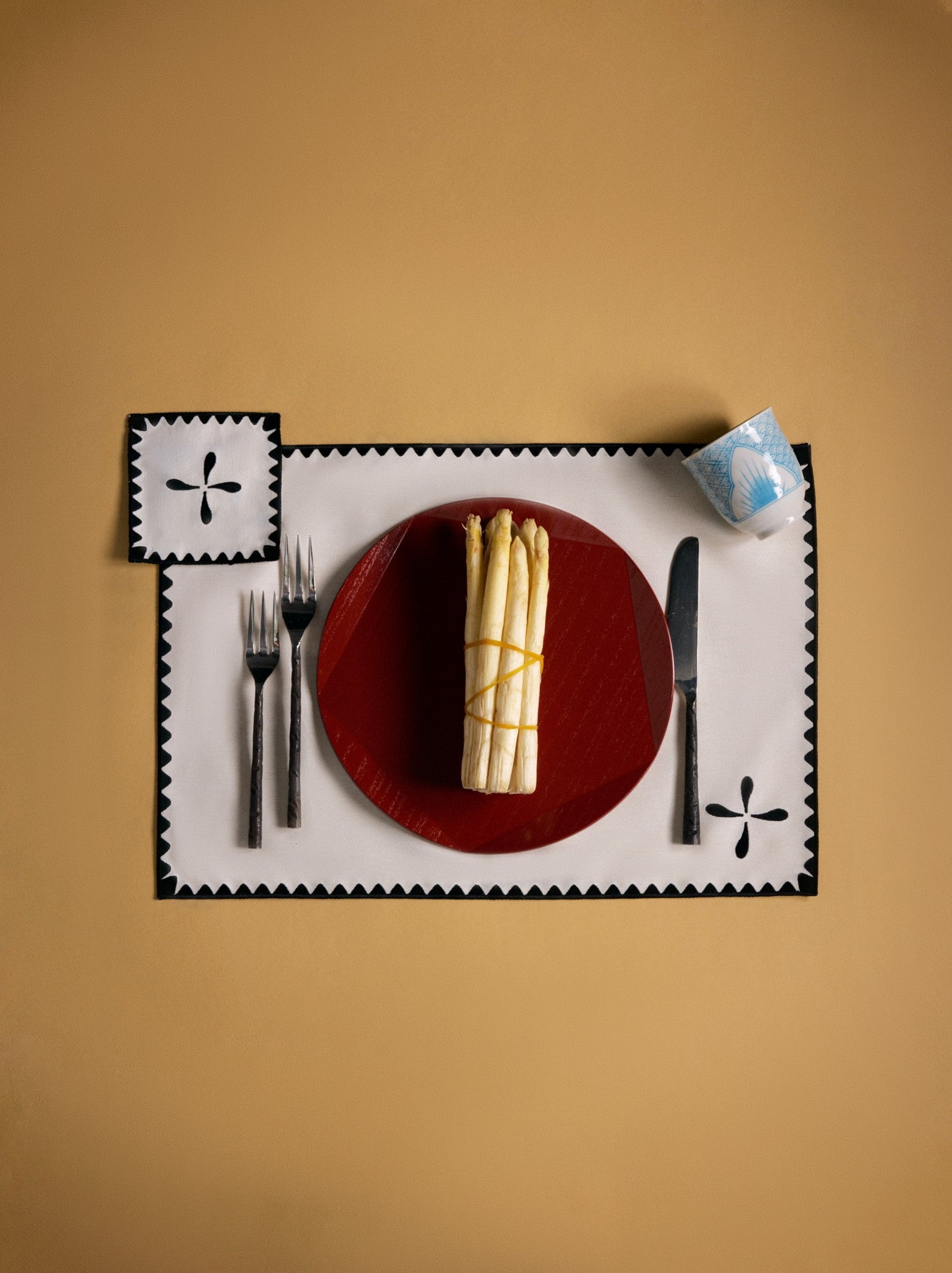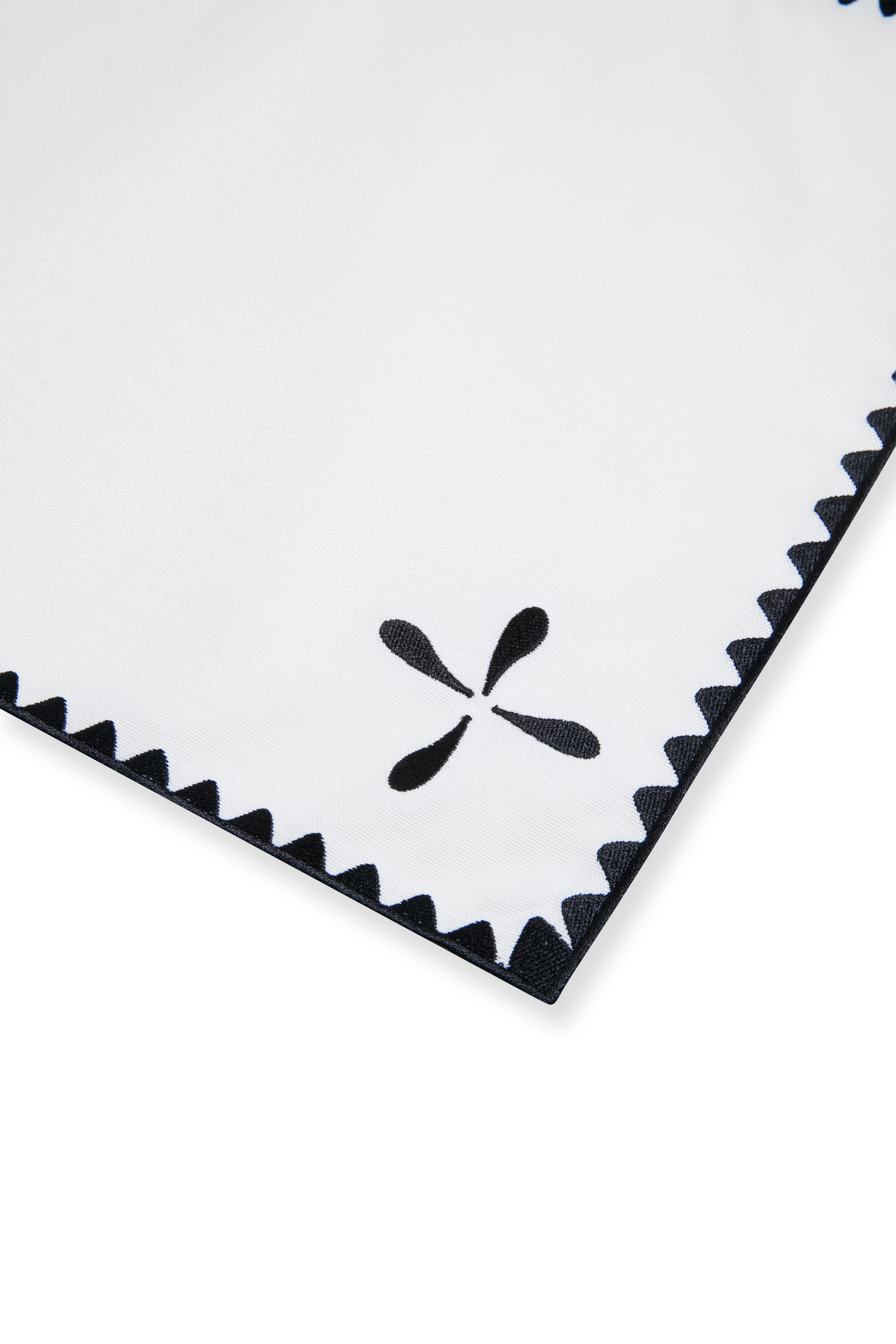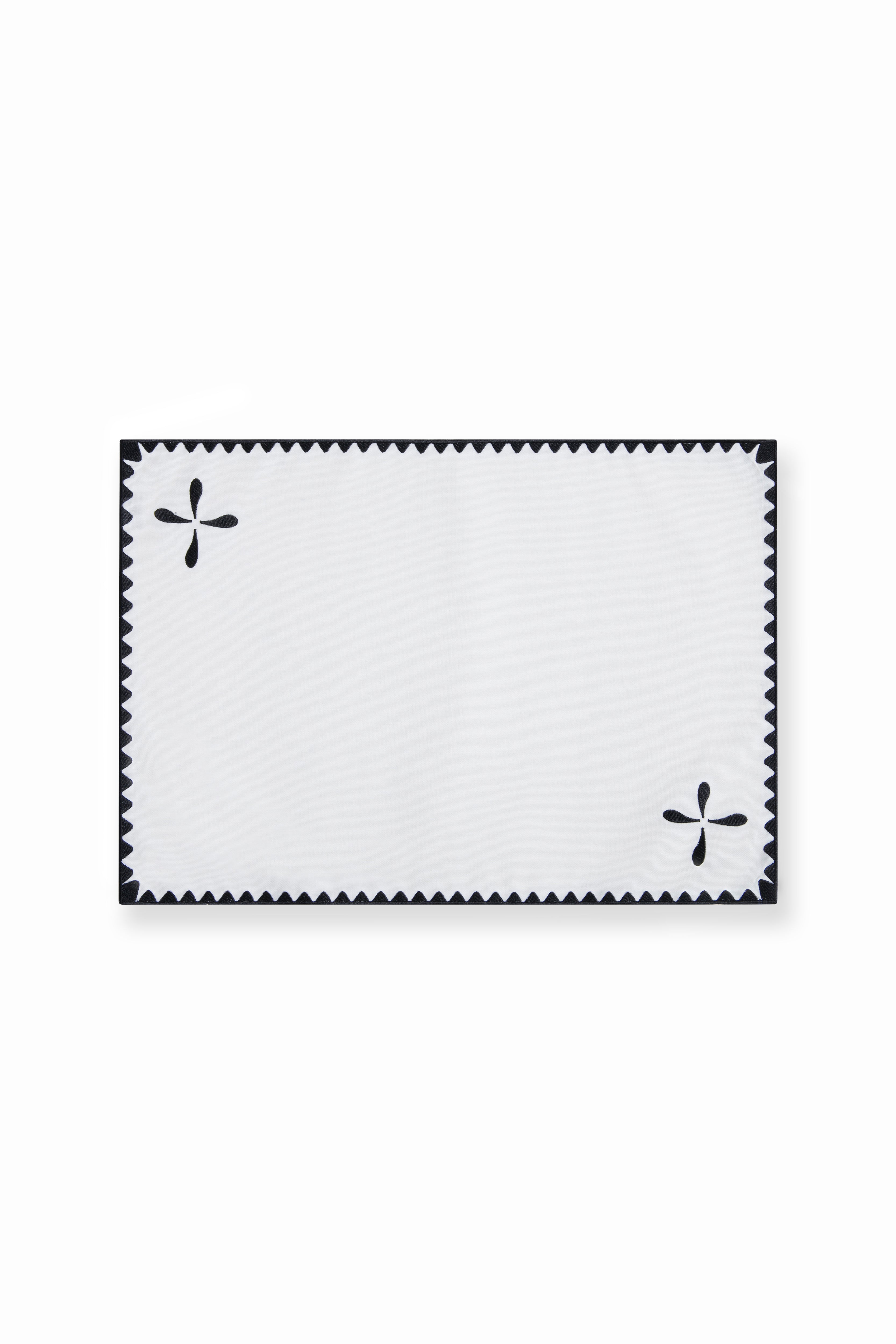Sora Placemat reinterprets the classic rectangular form with bold embroidered details and contrast edging. Its black-and-white palette and clean lines create a sophisticated backdrop, allowing the table setting to stand out with effortless elegance.