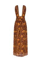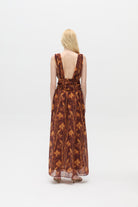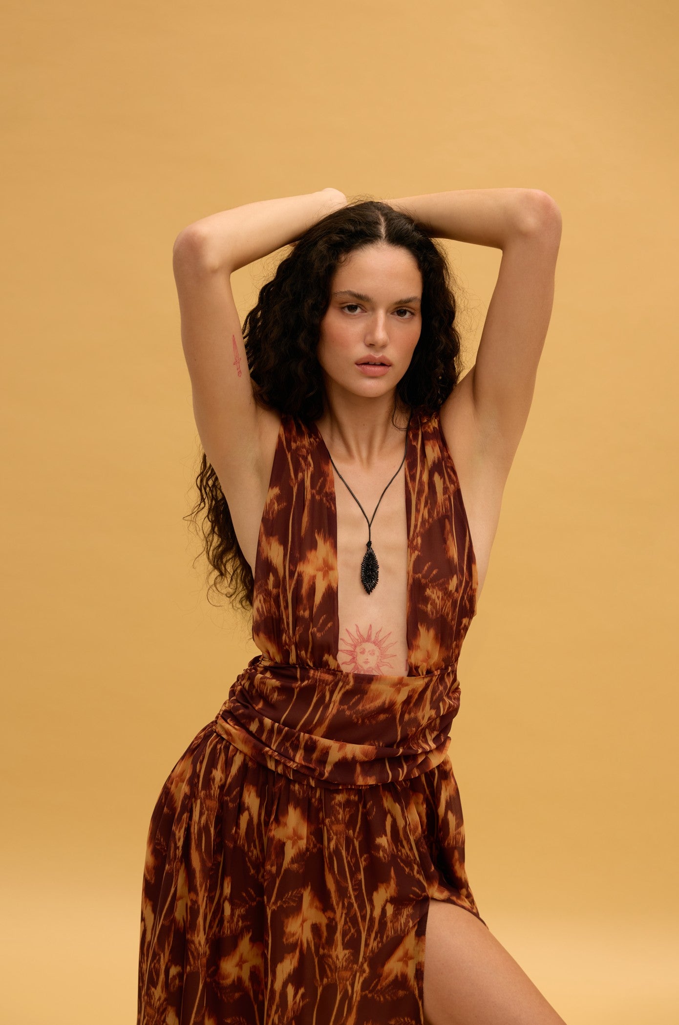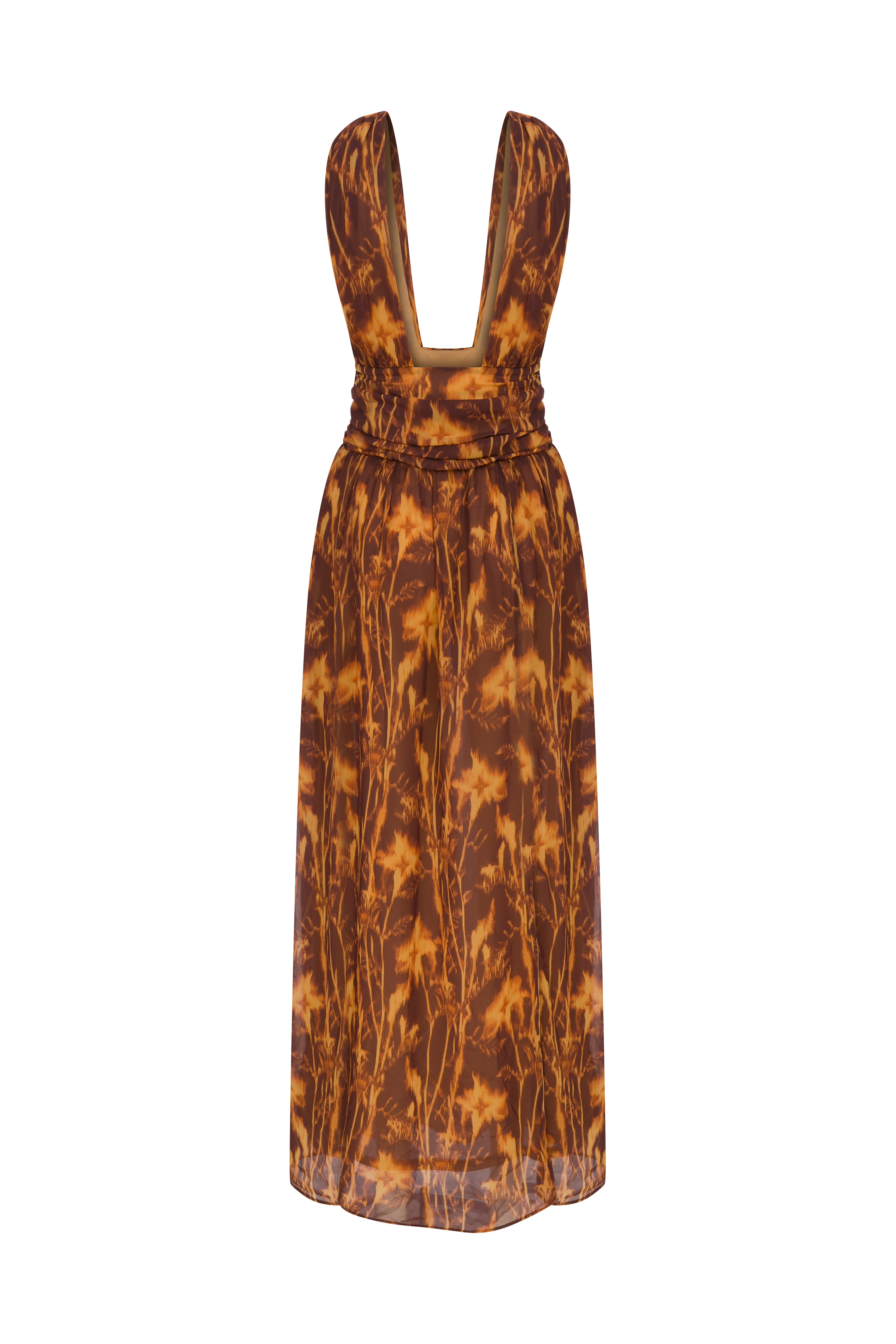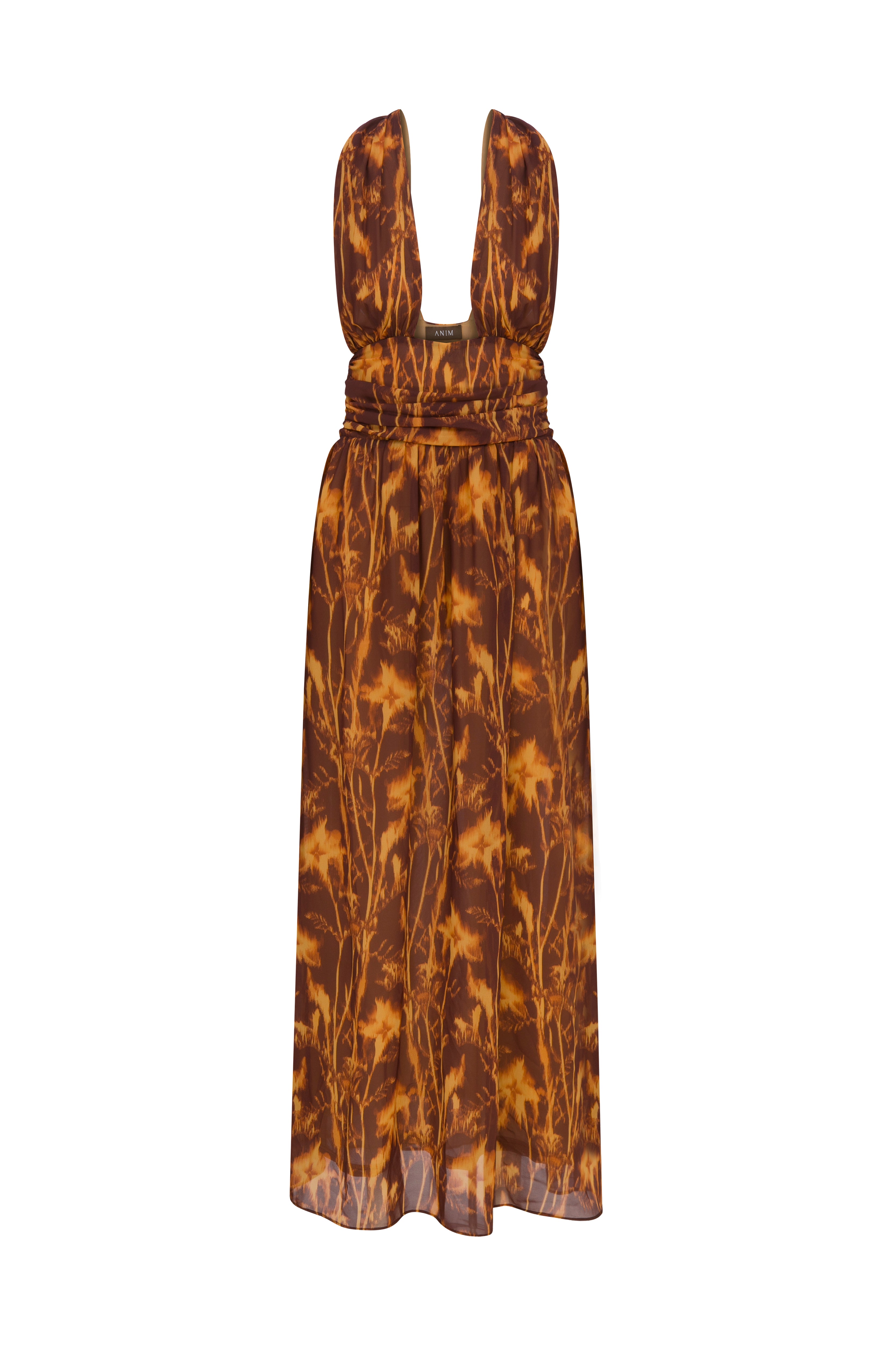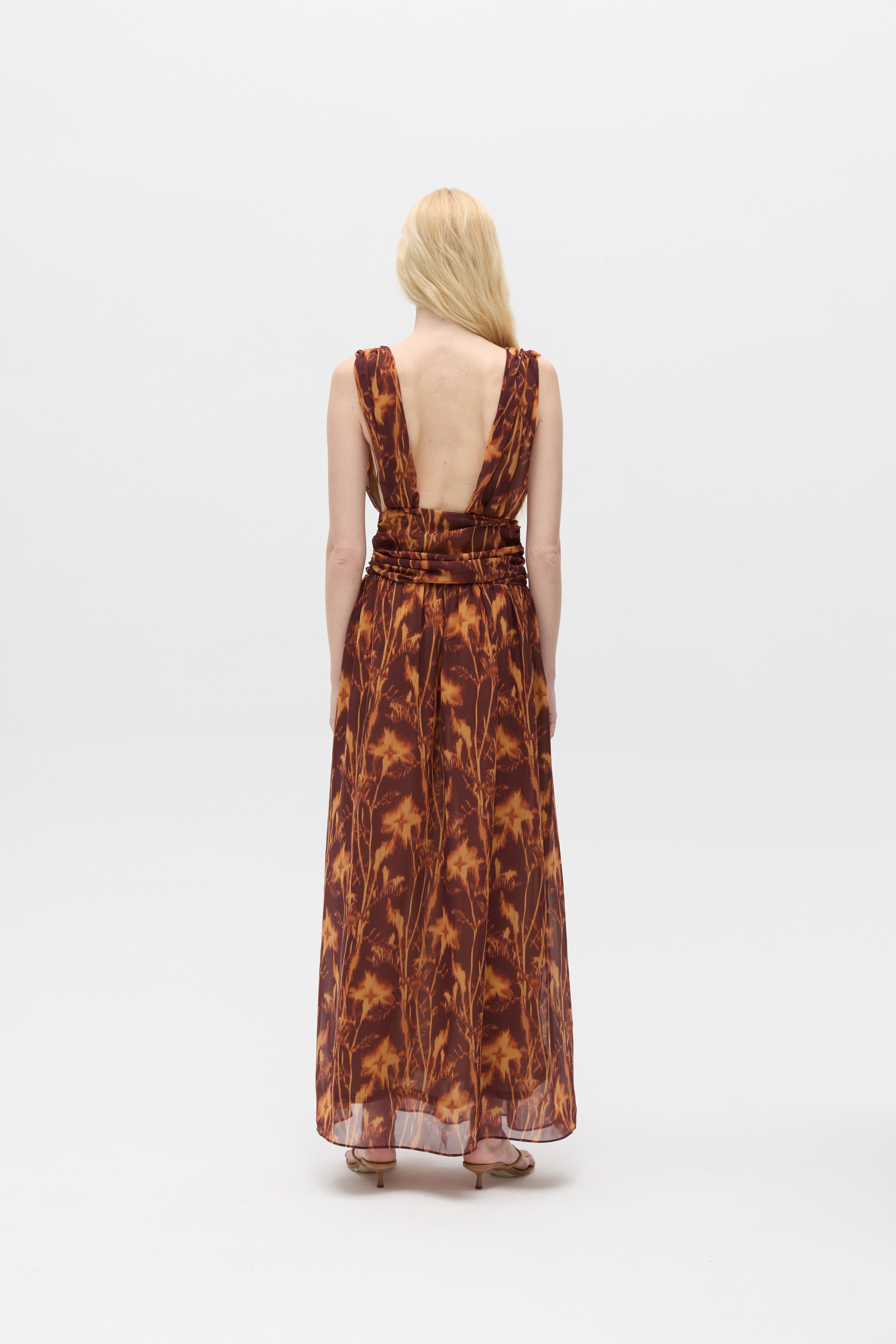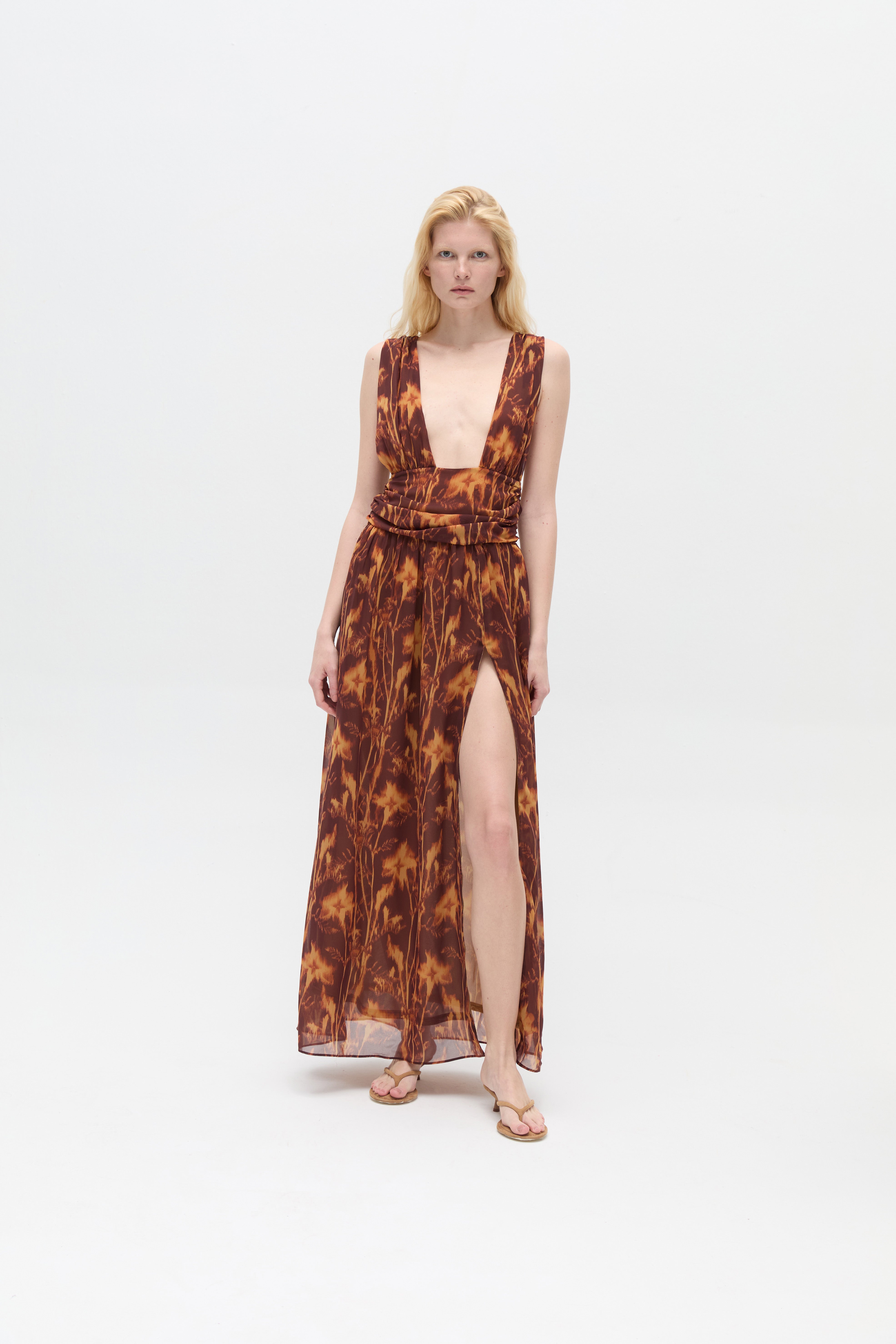 The Sola Dress is crafted from printed chiffon fabric with a sleeveless design. It features wide straps and a gently gathered waist that falls into a long, flowing silhouette. With its lightweight, draped structure, it offers a timeless look — a simple yet striking piece that complements any style.