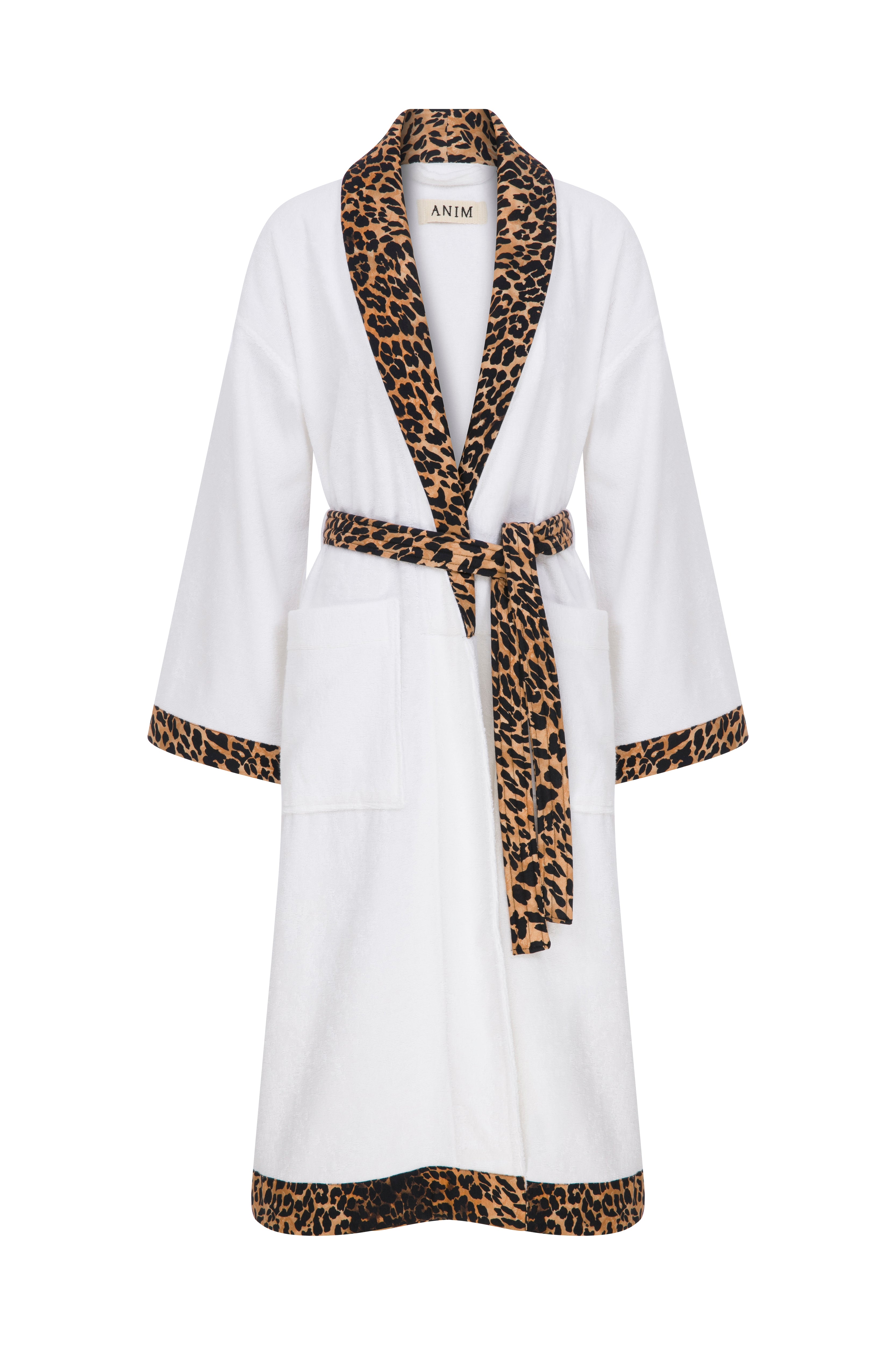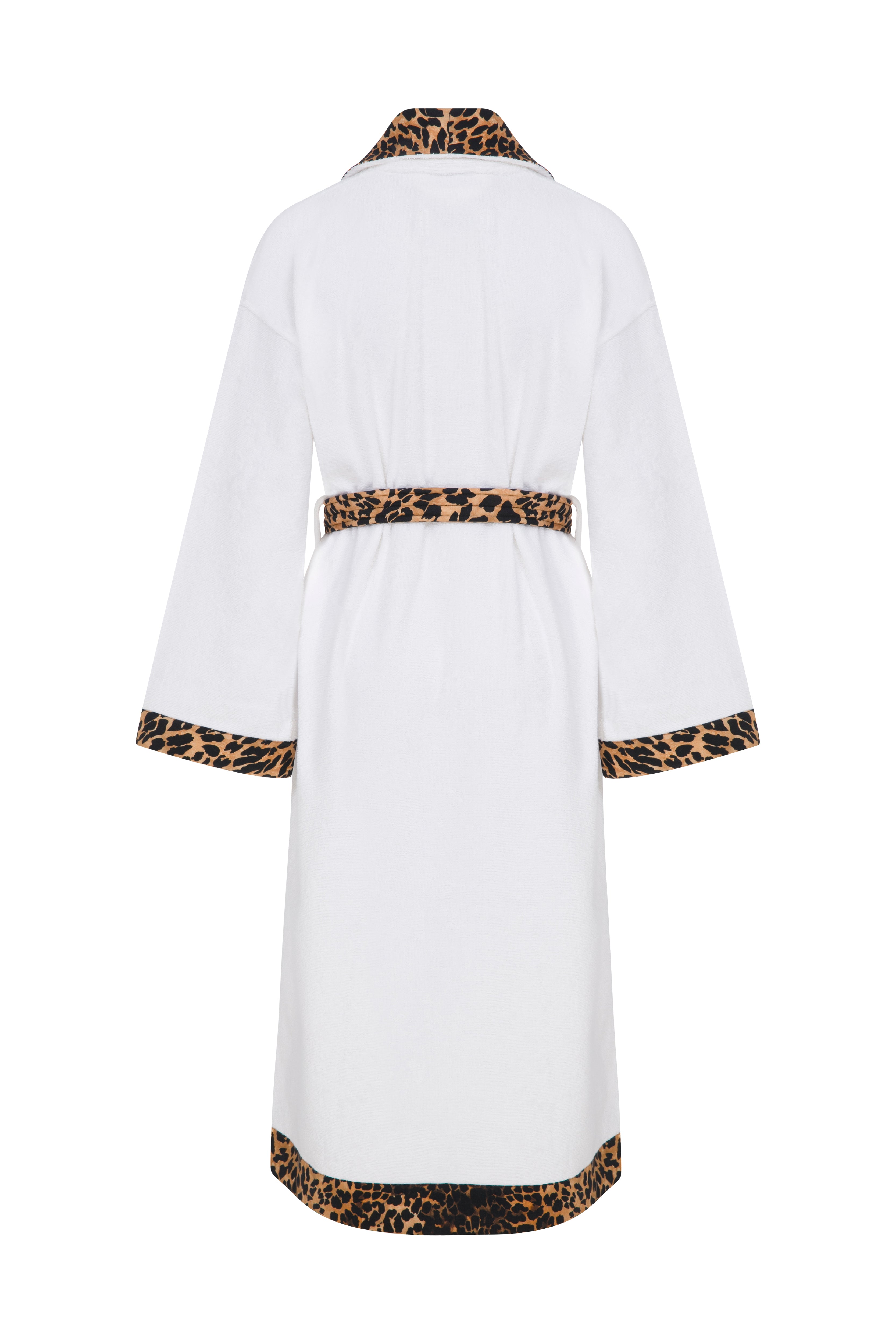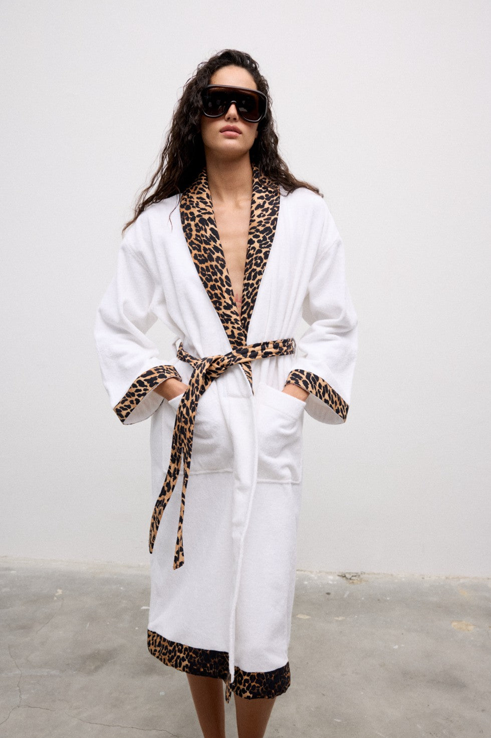 Rea Robe combines the soft texture of white cotton with striking leopard-print trims, creating a bold yet elegant contrast. With its relaxed silhouette, belted waist, and spacious pockets, it blends comfort and style effortlessly. Bringing a touch of luxury to moments of relaxation at home, this robe is both functional and refined.