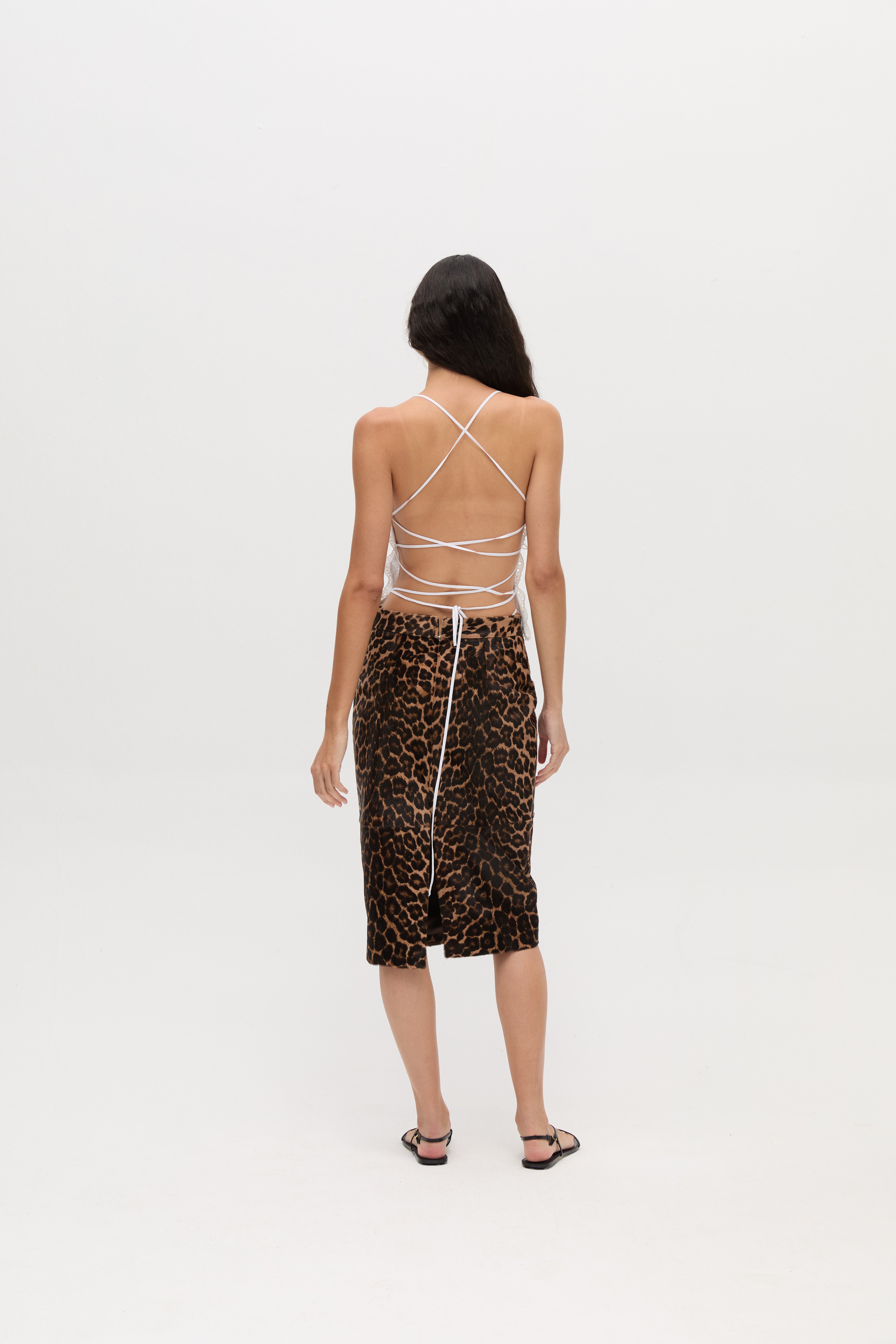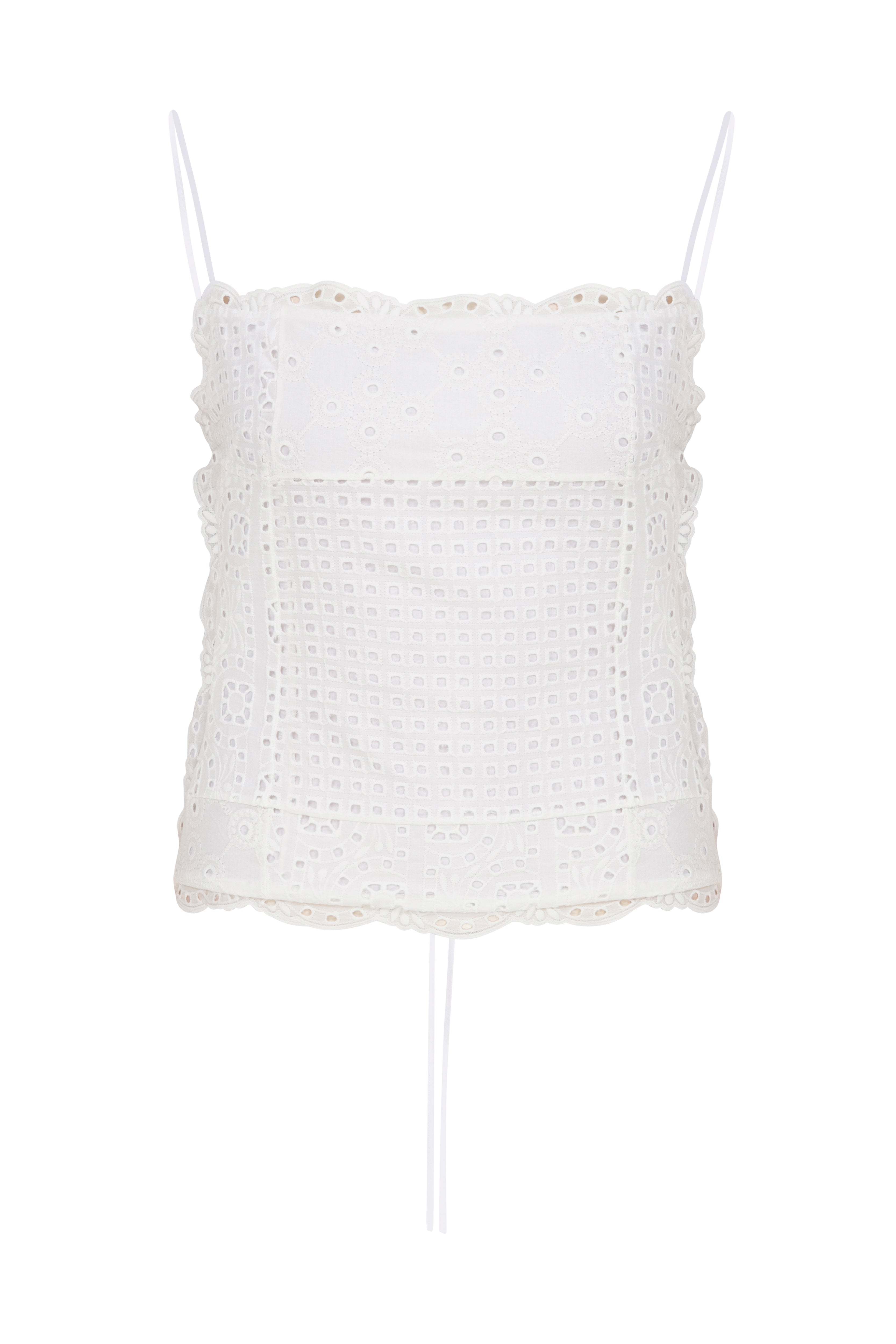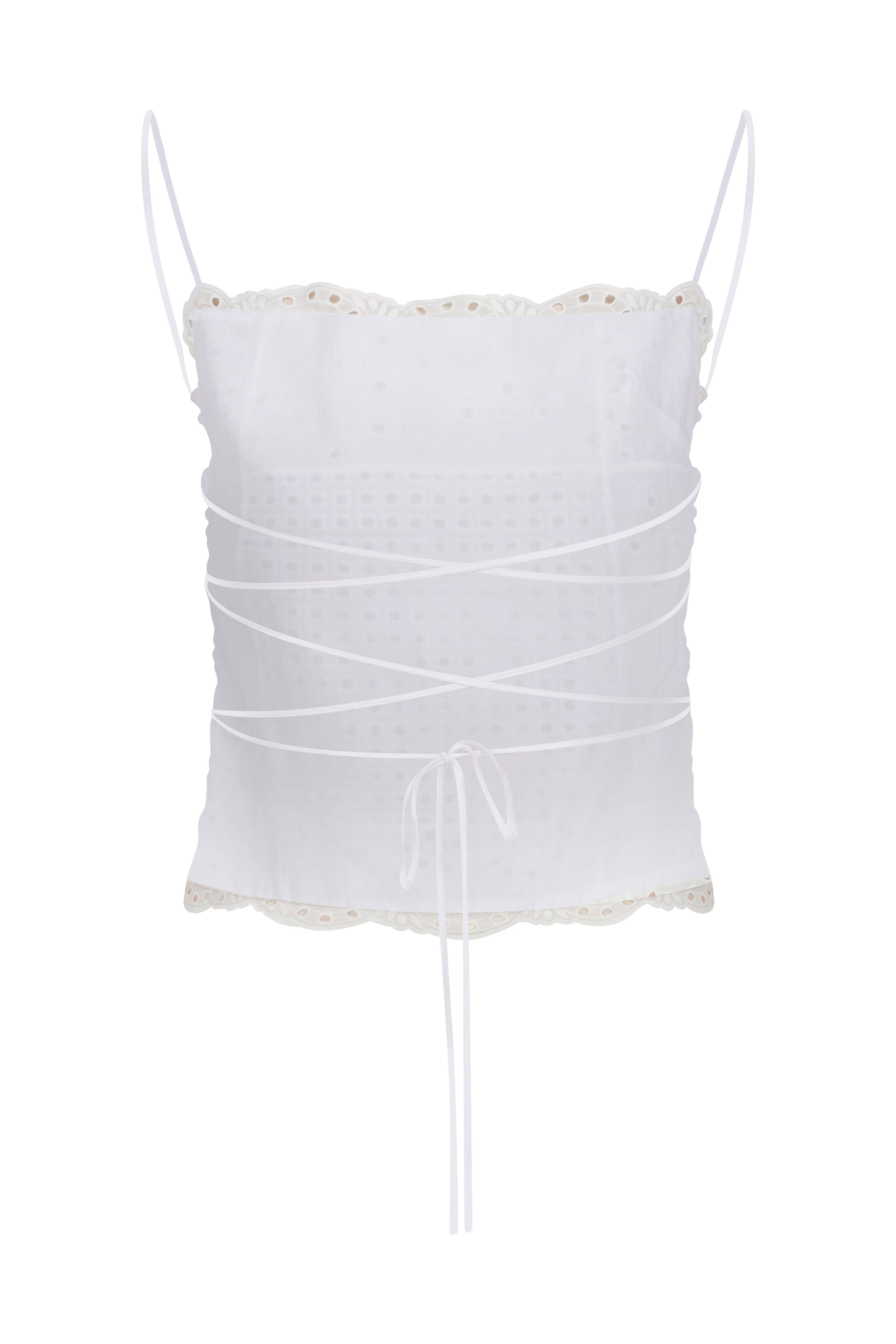 The Elise Bustier is a charming embroidered cotton anglaise top, finished with subtle scalloped edges and adjustable tie details at the back. Its structured yet feminine design works beautifully layered under jackets or paired with high-waisted bottoms.