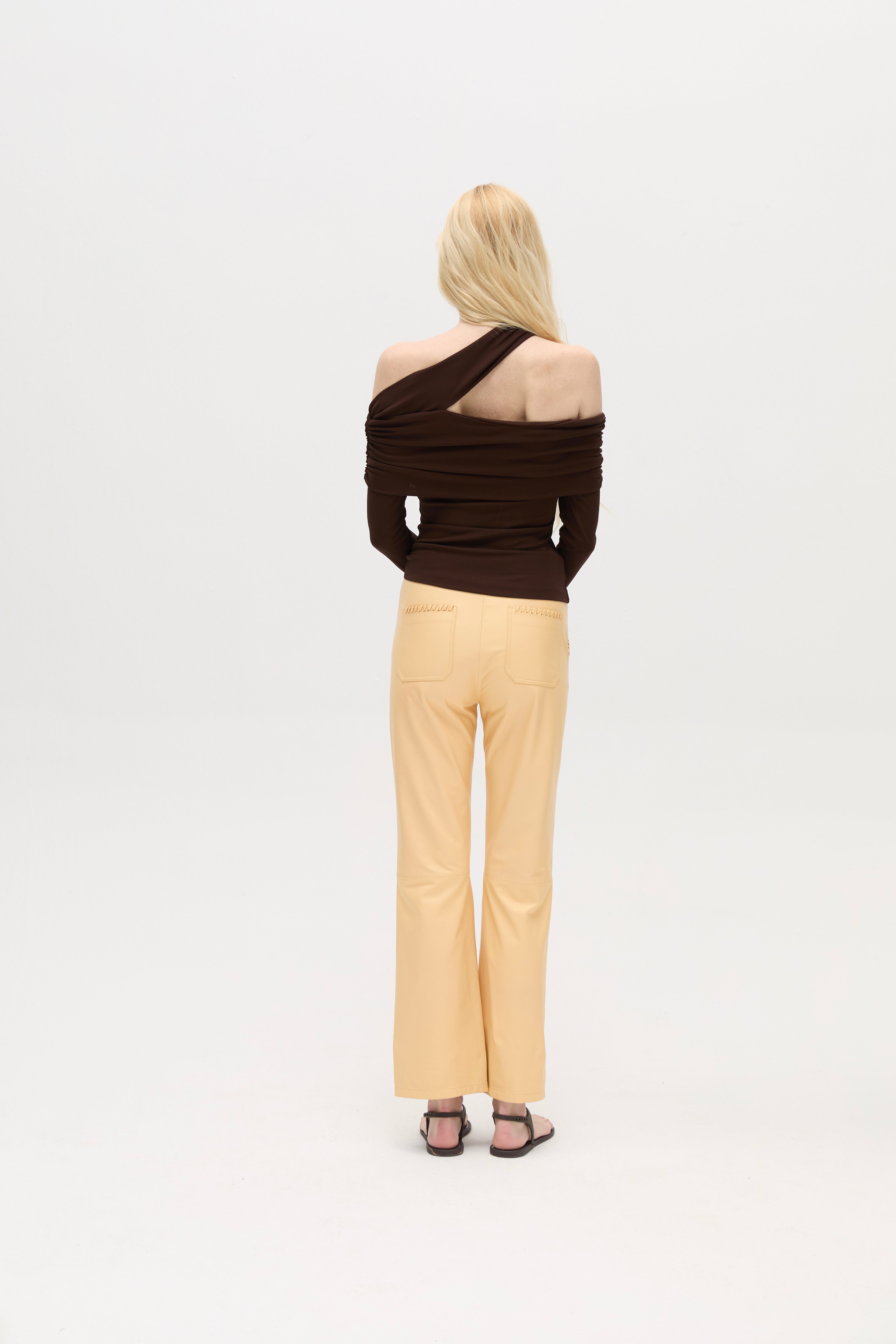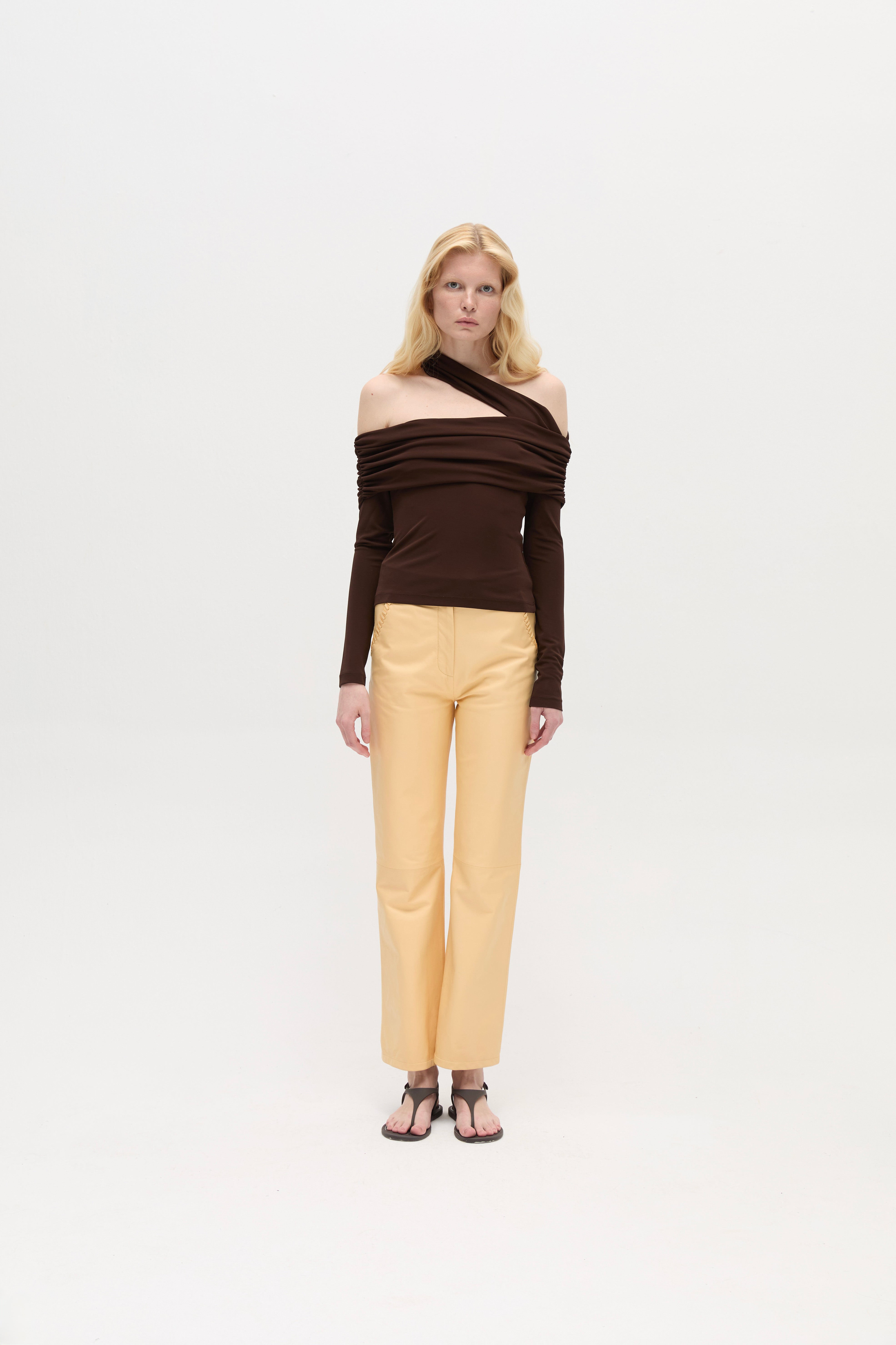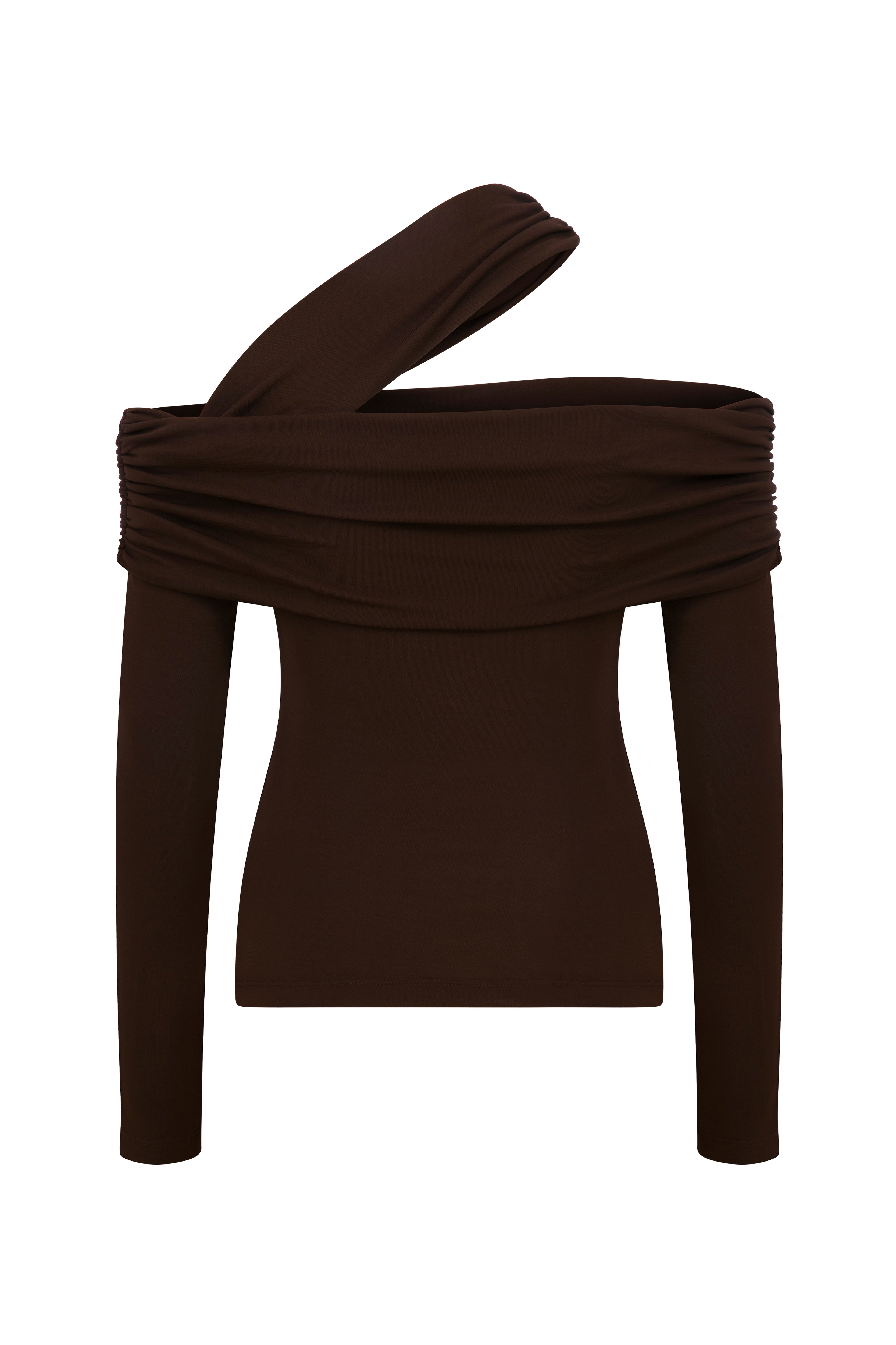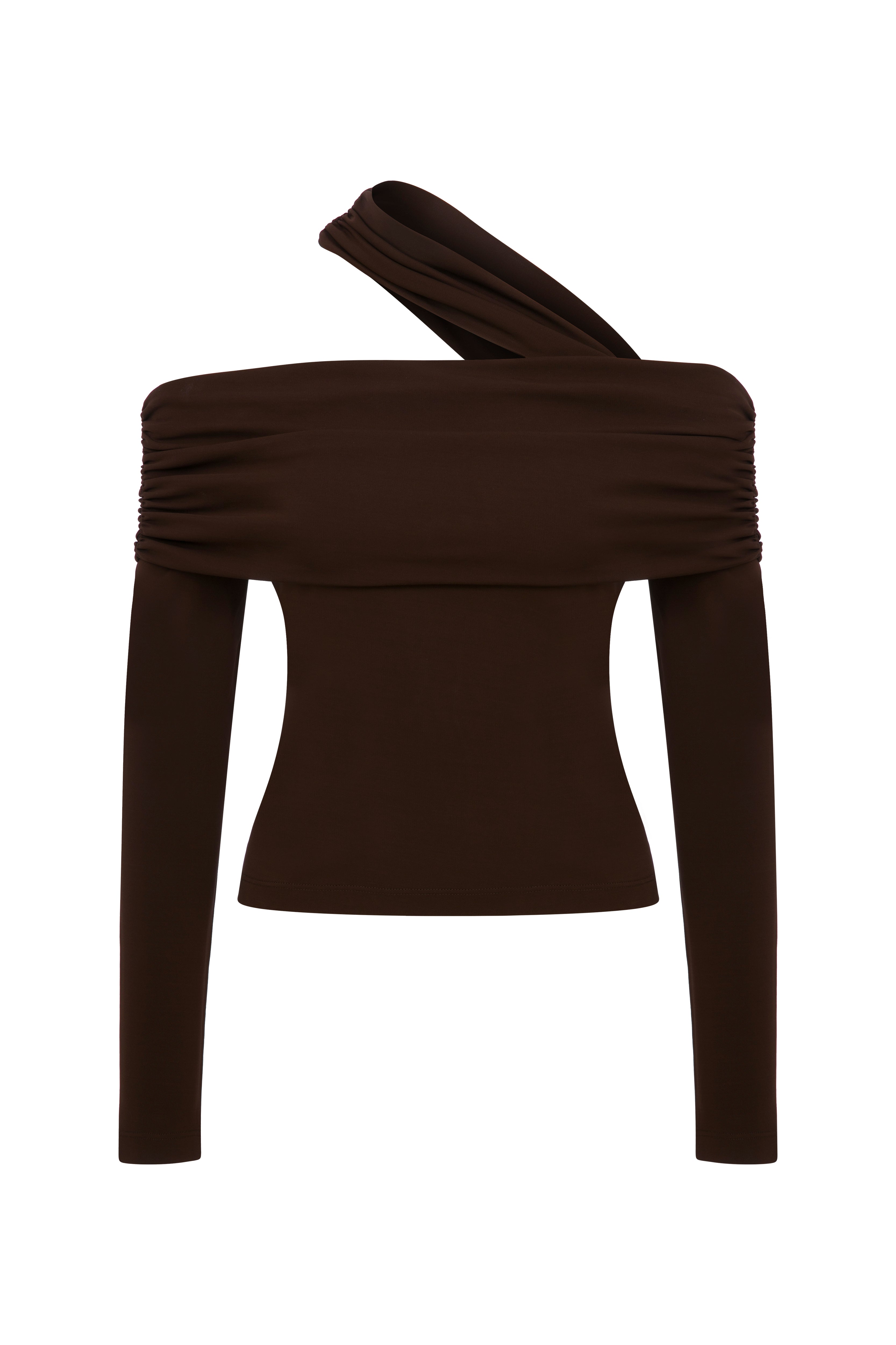 The Sia Top is crafted from brown viscose jersey fabric. It features gathered detailing along the off-shoulder line and a strap that extends around the neck, creating a distinctive silhouette. With its long sleeves and close-fitting shape, it offers an elegant and balanced look that pairs effortlessly with a variety of bottoms.
