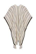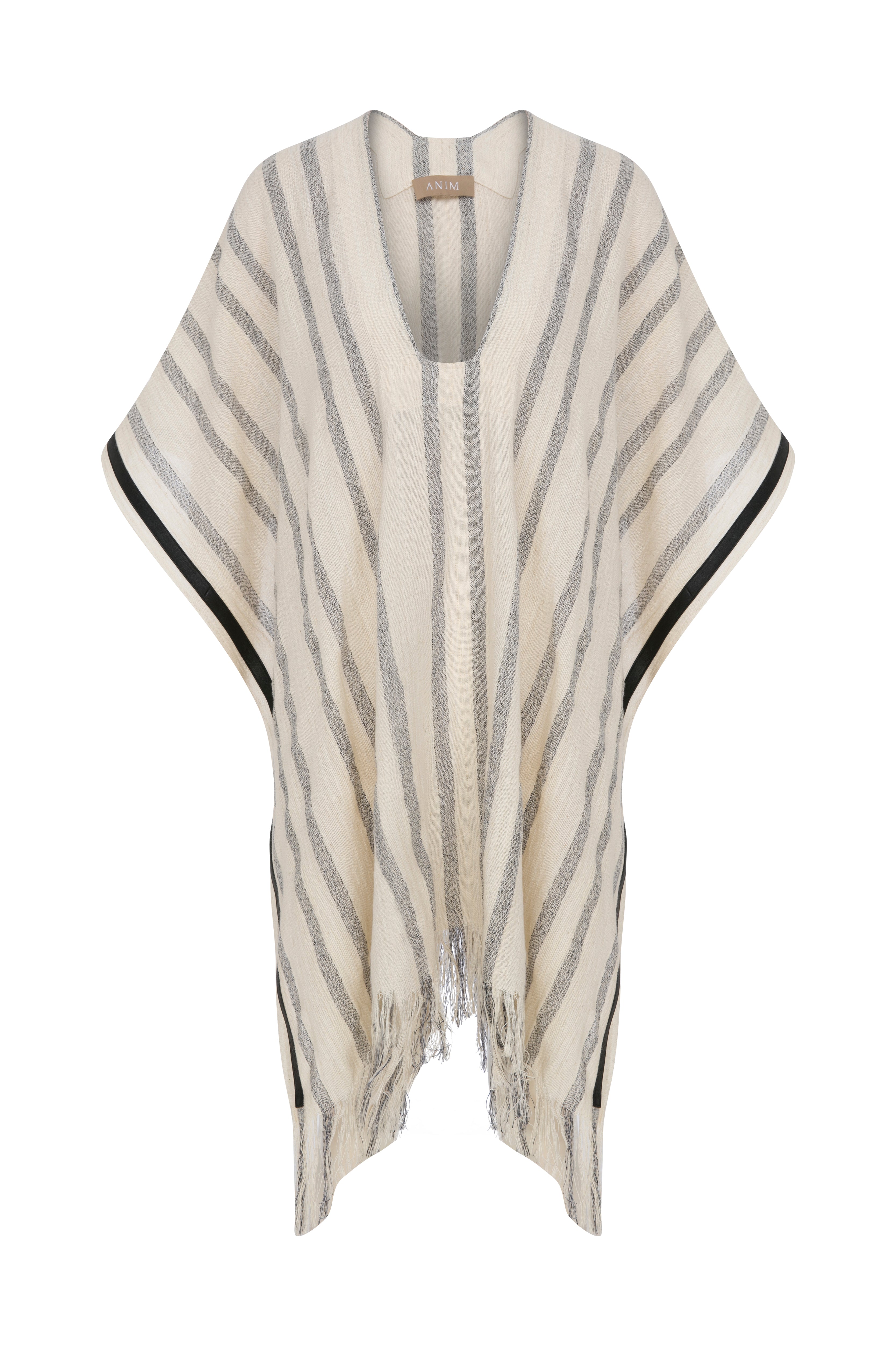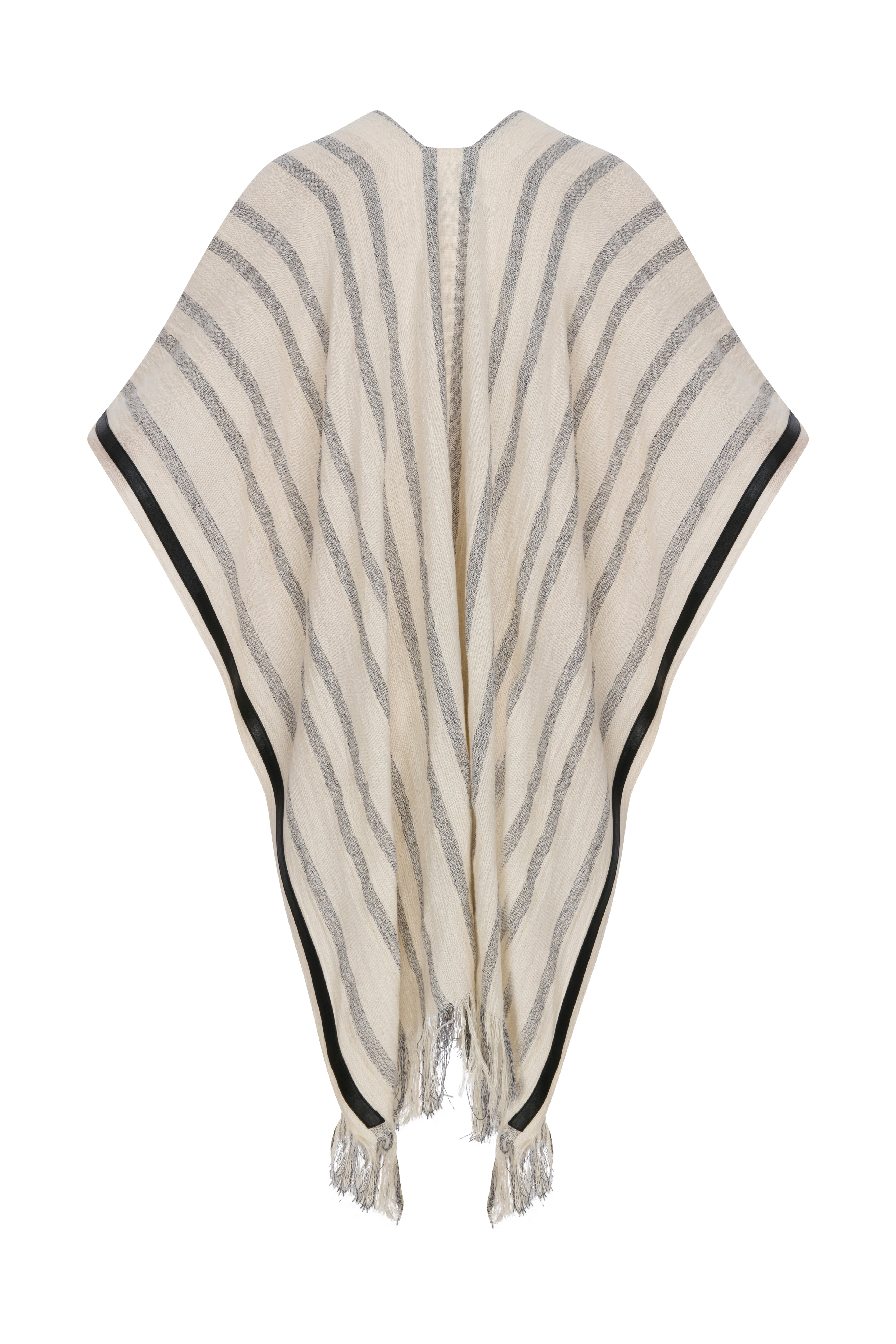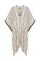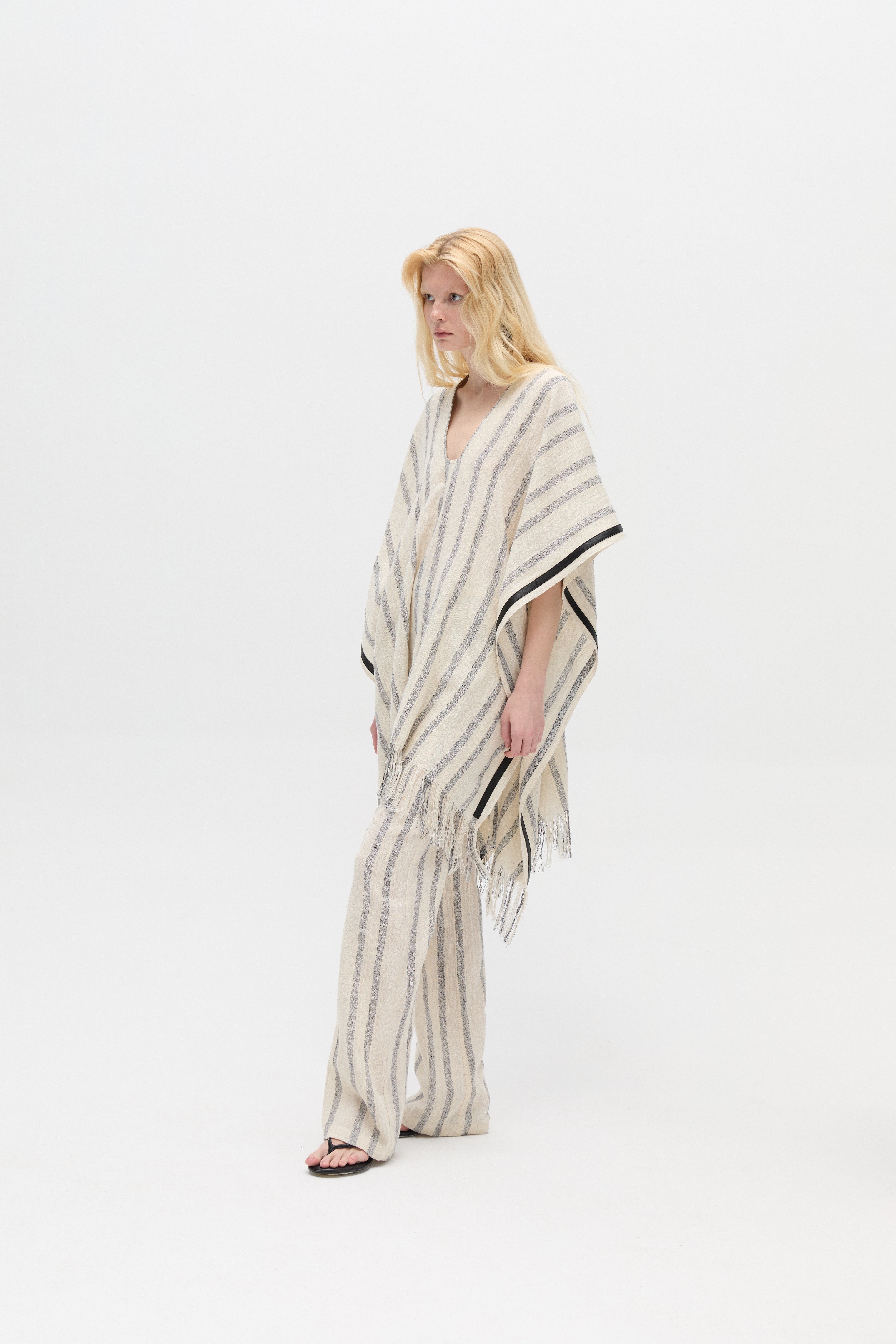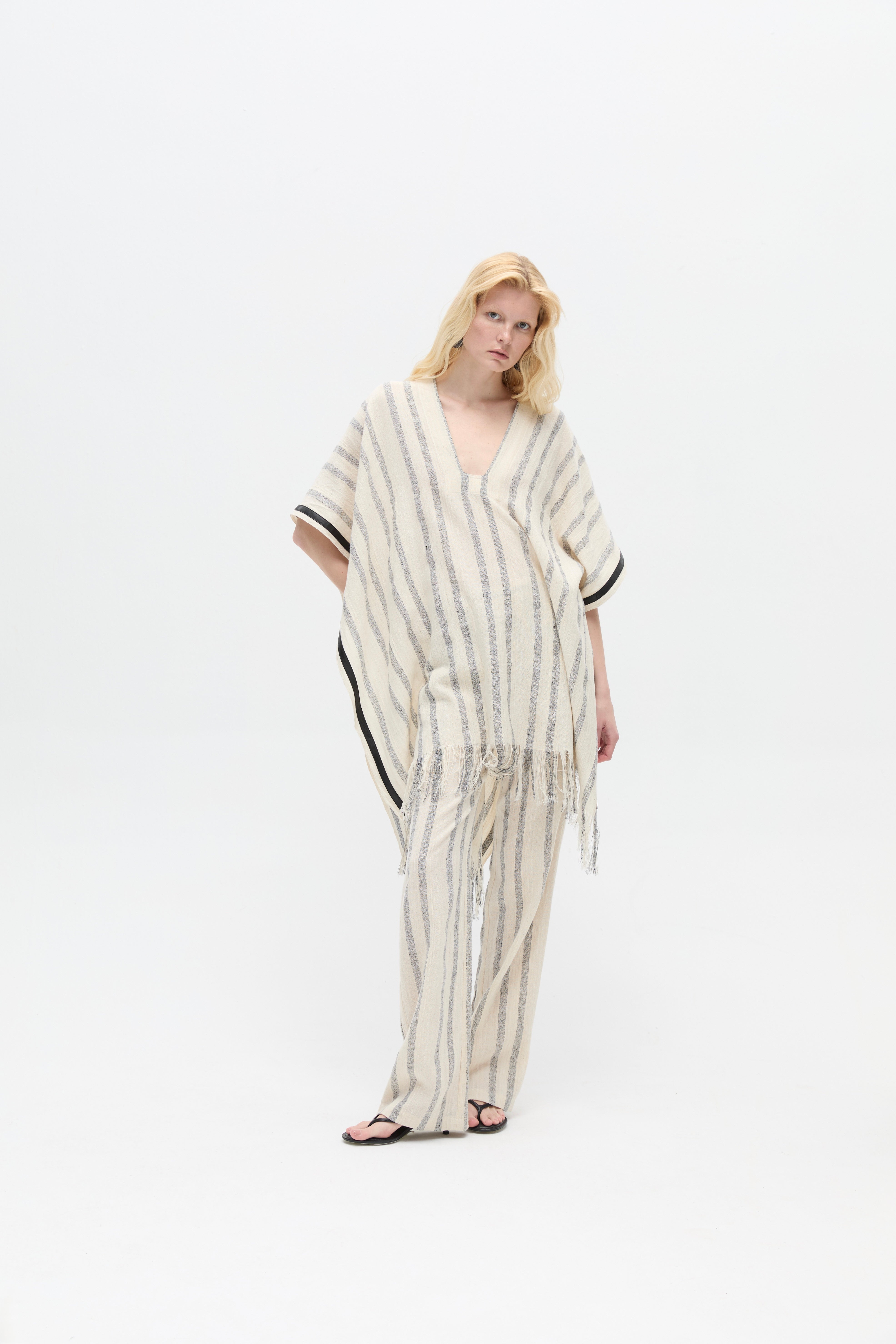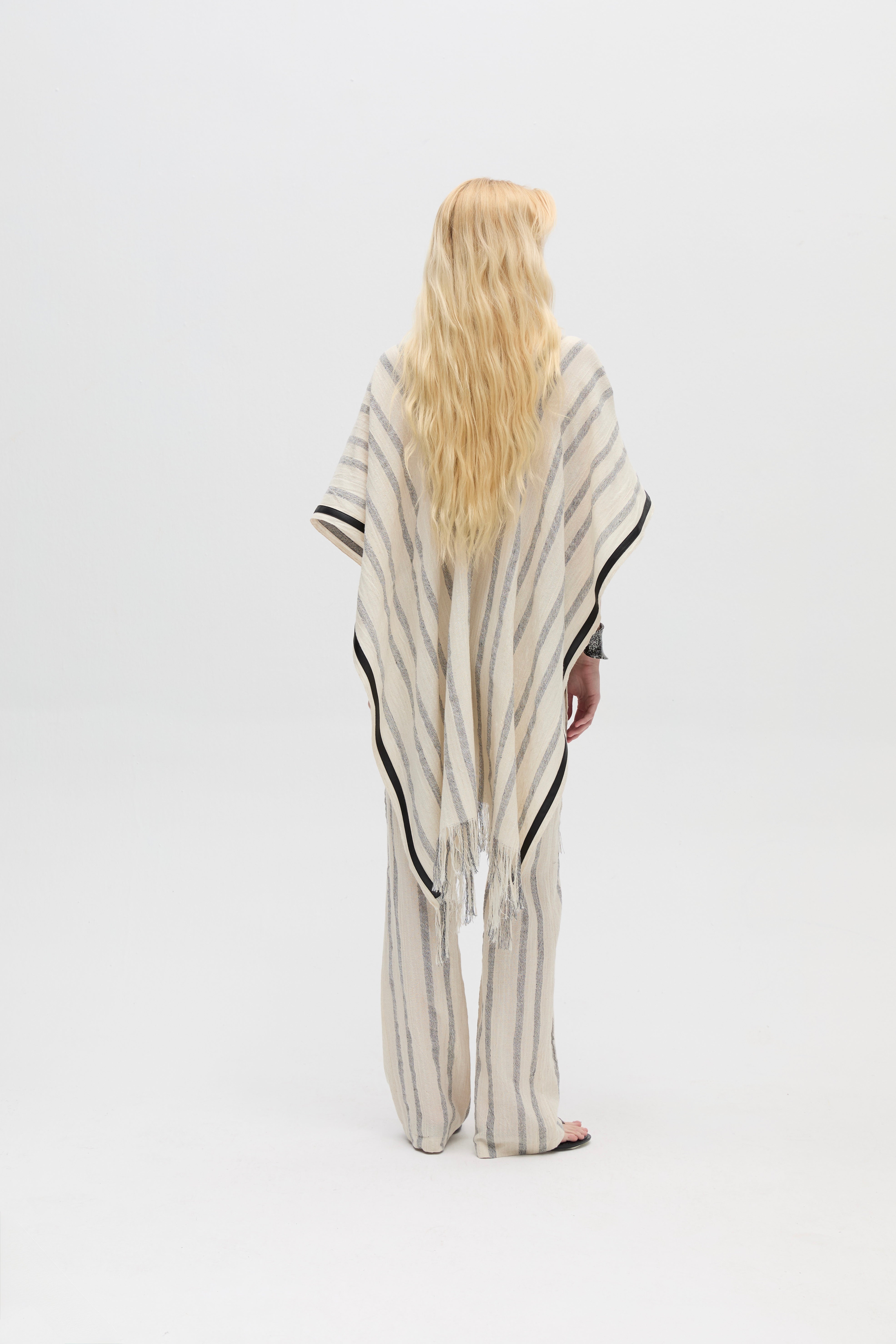 The Kahi Poncho is a mini design crafted from soft cotton fabric in an ecru base with grey stripes. It features open sides and subtle fringe trims that create a fluid silhouette. The relaxed cut and vertical stripes give a sense of length, making it a versatile layering piece for beach, resort, or city wear.