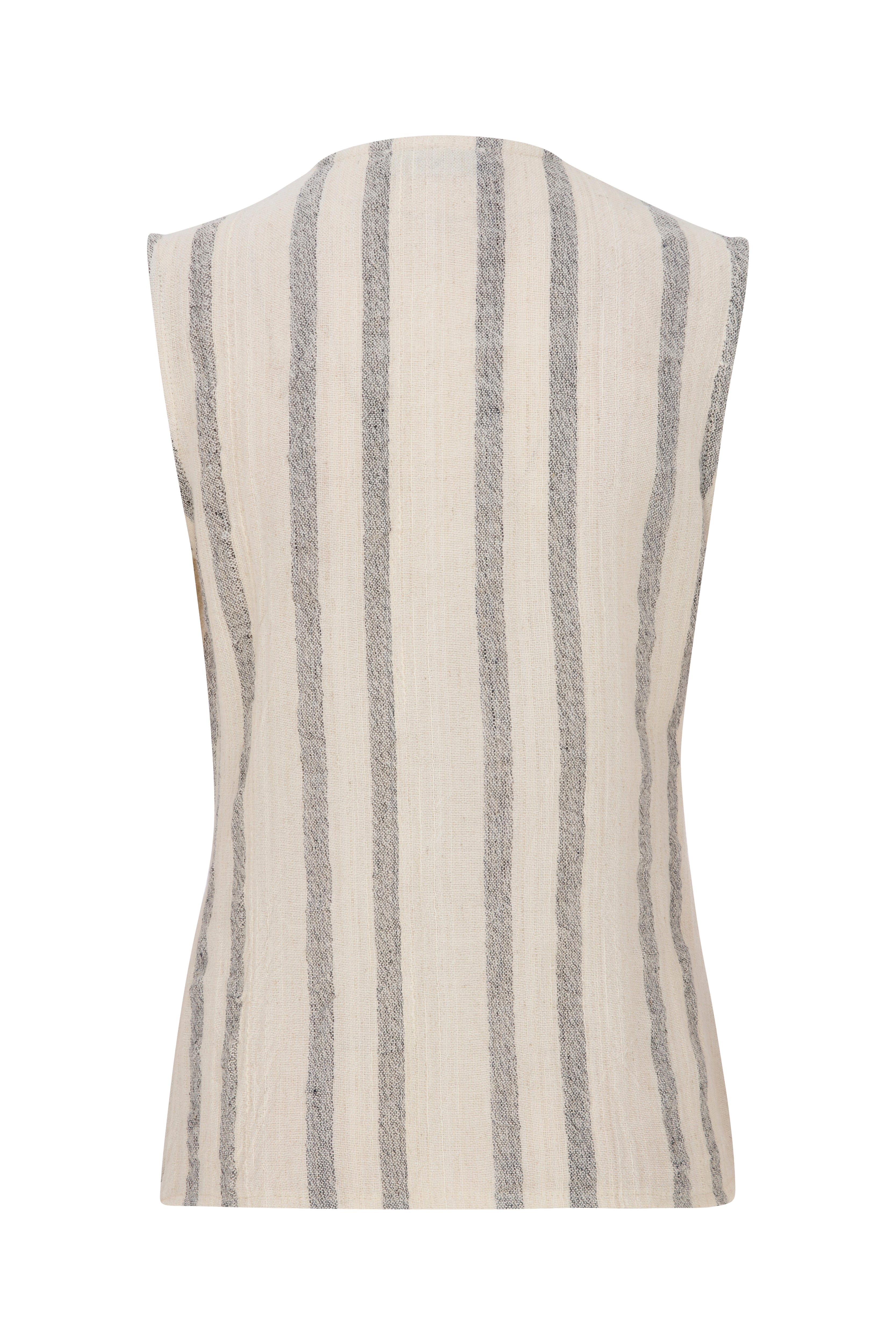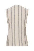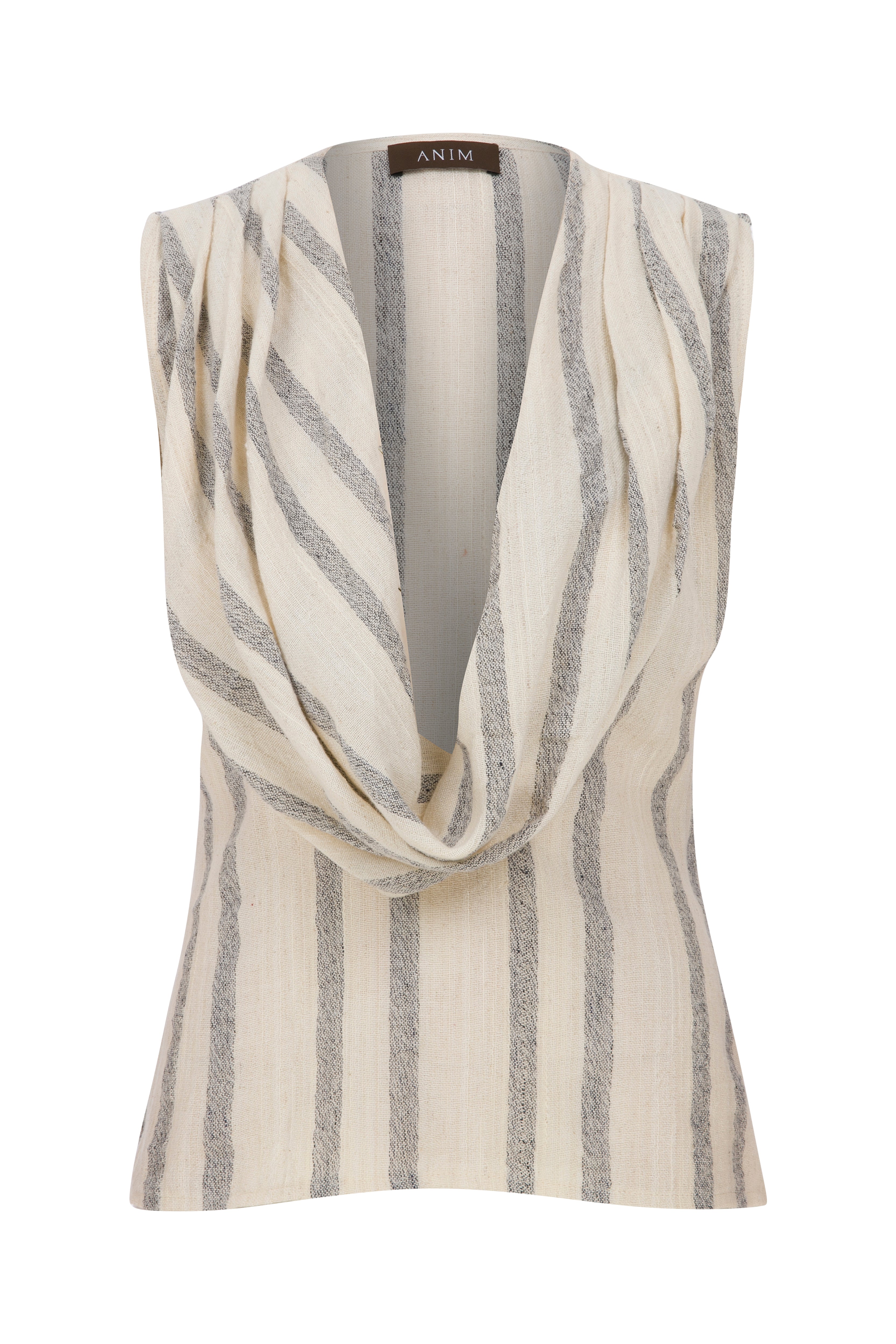 The Kahi Top is crafted from lightweight cotton fabric in an ecru base with grey stripes. Its sleeveless cut and draped neckline add fluidity and depth to the design. The vertical stripe pattern enhances the silhouette, while the relaxed fit allows it to be worn on its own or layered easily. It blends everyday comfort with a clean, refined look.