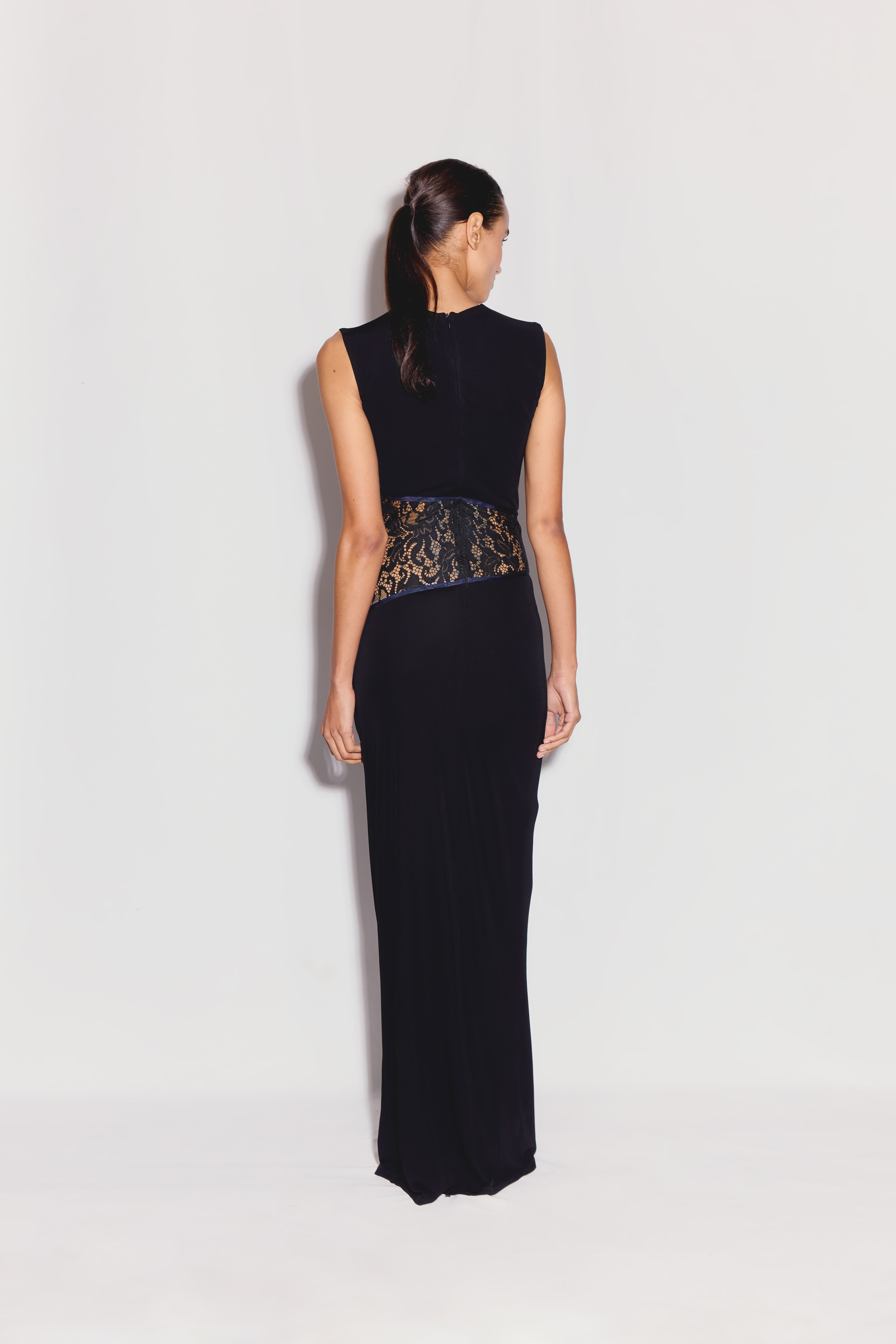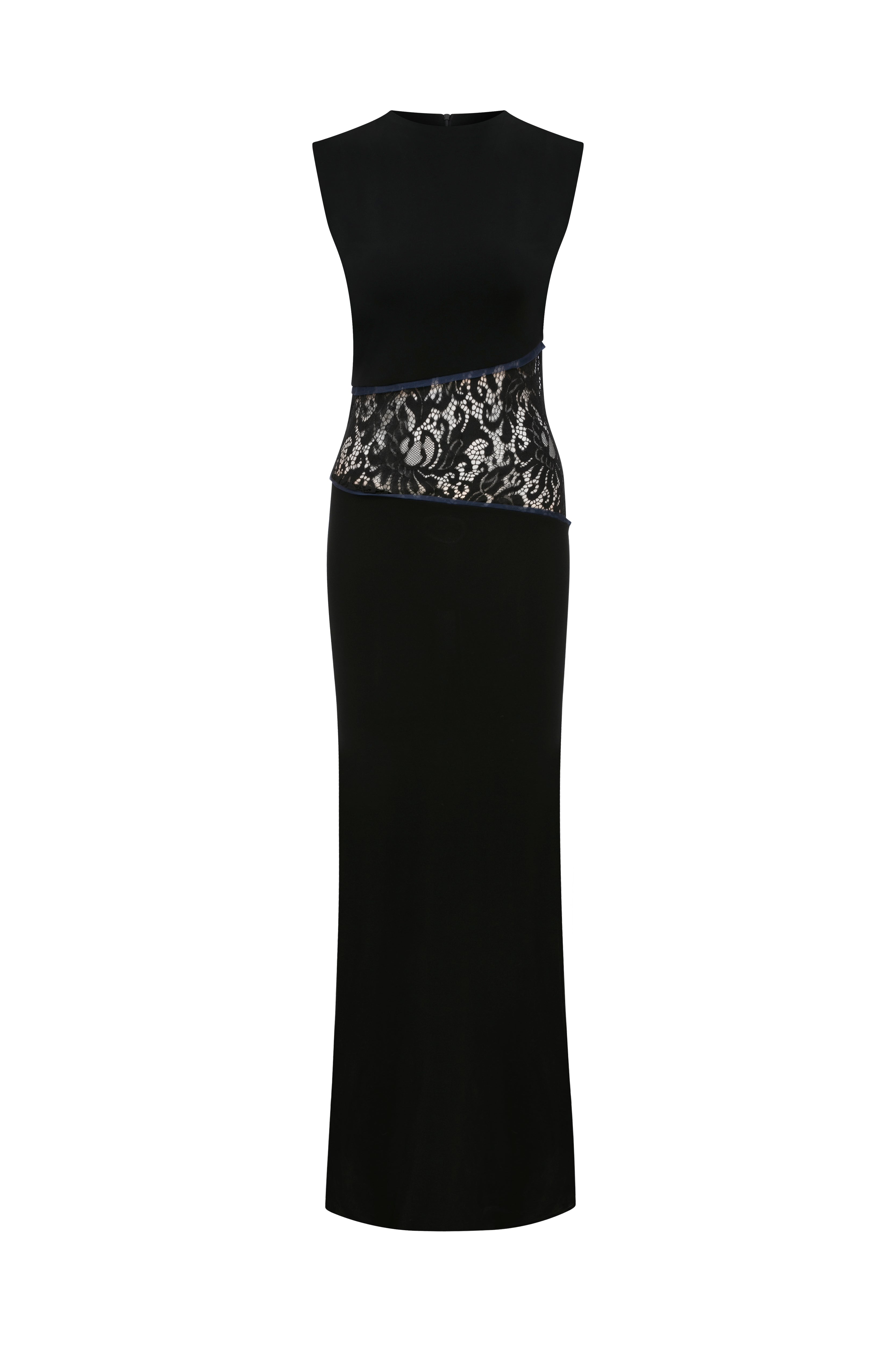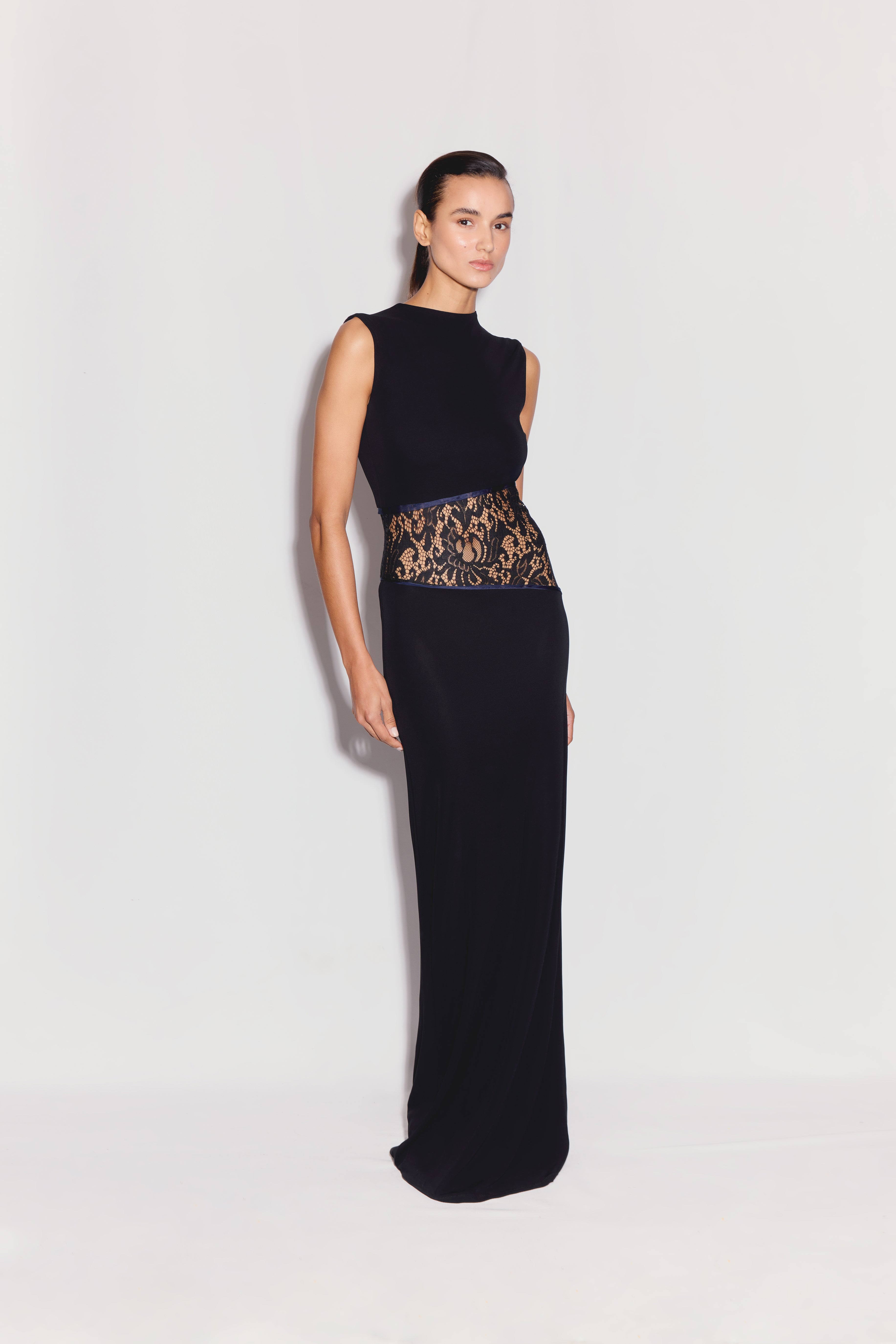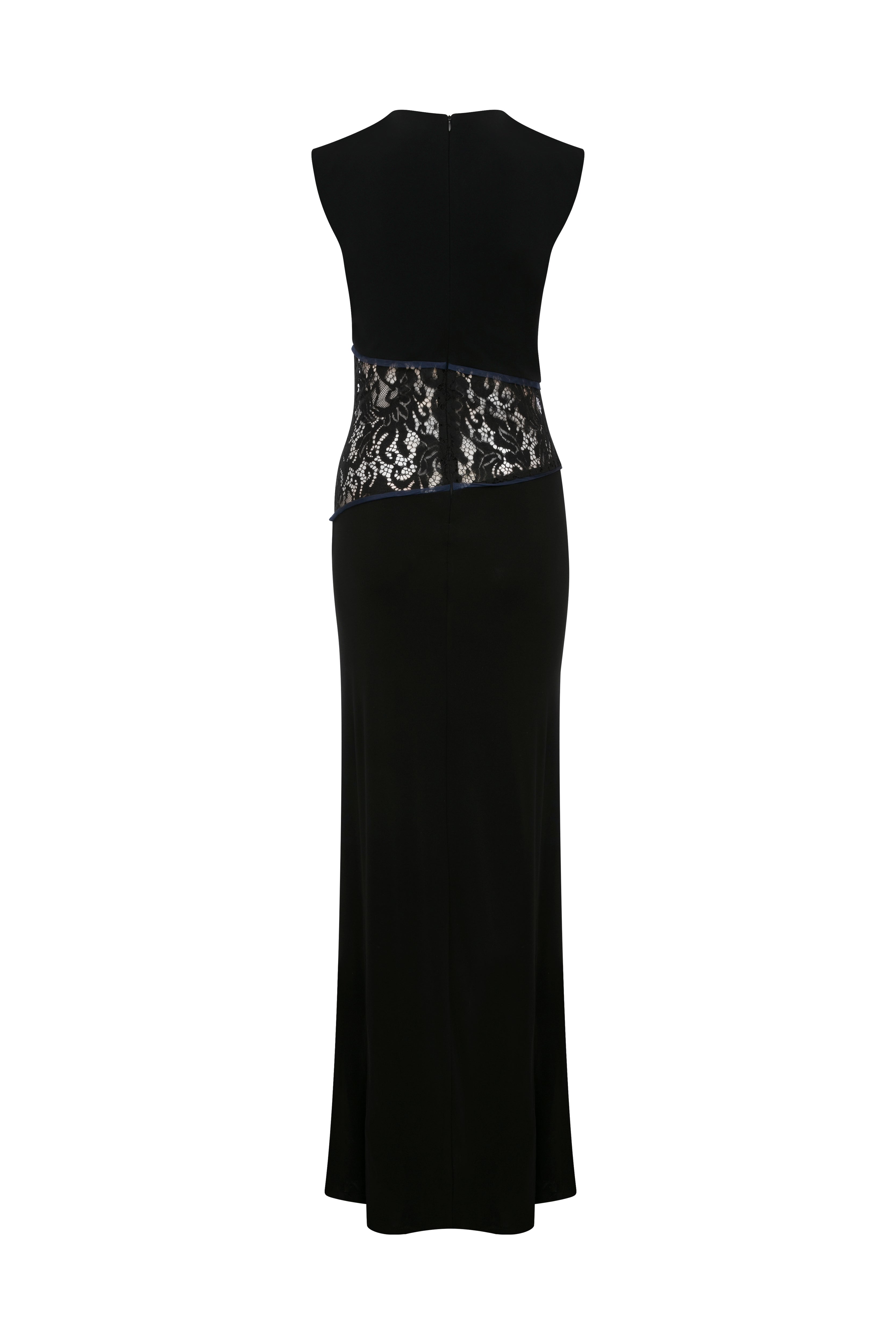 Designed with a fitted bodice and straight floor-length skirt to create an elongated silhouette. The lace panel at the waist adds elegant, subtle allure.